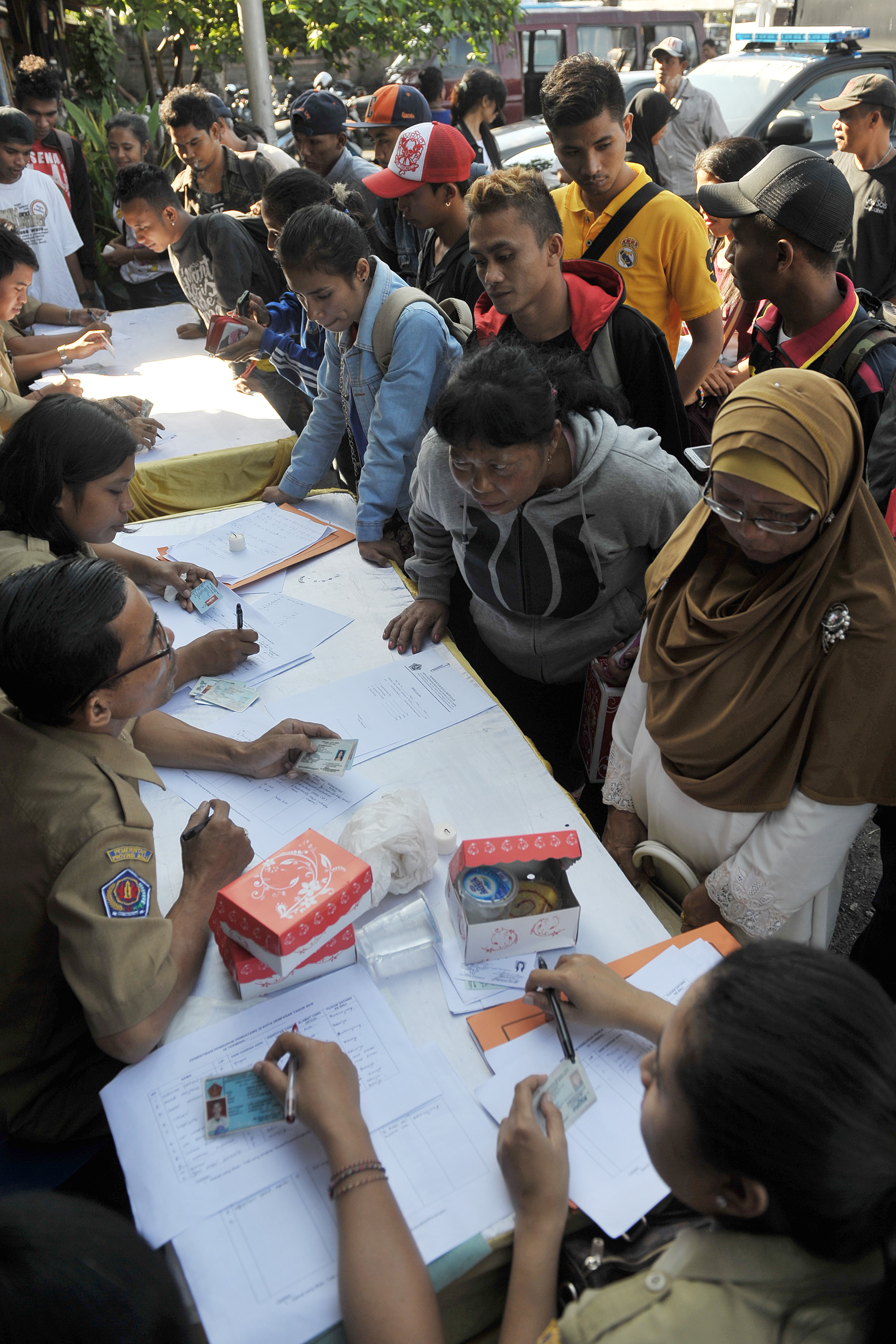 Petugas Dinas Kependudukan dan Catatan Sipil Kota Denpasar mendata para penumpang bus setibanya di Terminal Ubung pada H+4 Lebaran di Denpasar, Bali, Senin (11/7). Inspeksi petugas gabungan dari berbagai unsur tersebut dilakukan untuk mencegah upaya penyelundupan barang berbahaya dan urbanisasi ilegal ke Bali yang memanfaatkan keramaian arus balik Idul Fitri 1437H. ANTARA FOTO/Nyoman Budhiana/Spt/16.