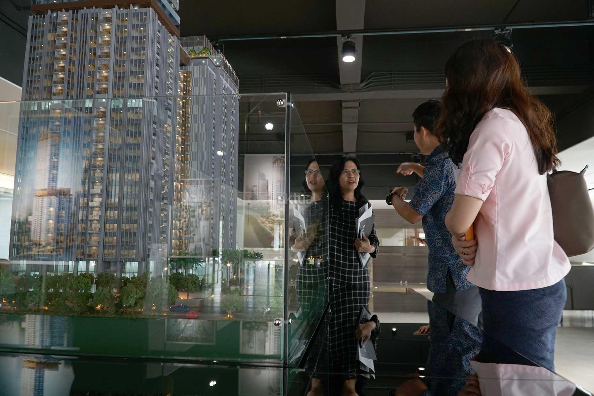 Tenaga pemasaran menjelaskan maket Fifty Seven Promenade kepada calon pembeli disela-sela soft launching proyek tersebut di Jakarta, Selasa (22/8/2017). Fifty Seven Promenade meliliki area pengembangan seluas 3,2 hektar yang menyediakan beragam fungsi seperti kondominium, perkantoran, apartemen servis, dan area ritel promenade.Perusahaan pengembang properti PT Intiland Development segera meluncurkan proyek pengembangan kawasan mixed-use & high rise terpadu di tengah kawasan pusat bisnis Sudirman dan Thamrin di Jakarta. Proyek yang diberi nama Fifty Seven Promenade tersebut akan diluncurkan pada 26 Agustus mendatang. Demikian disampaikan Direktur Pemasaran Intiland Susan Pranata dan Direktur Pengelolaan Modal dan Investasi Intiland Archied Noto Pradono saat sof launch proyek tersebut di Jakarta, Selasa (22/8/2017). Fifty Seven Promenade meliliki area pengembangan seluas 3,2 hektar yang menyediakan beragam fungsi seperti kondominium, perkantoran, apartemen servis, dan area ritel promenade.