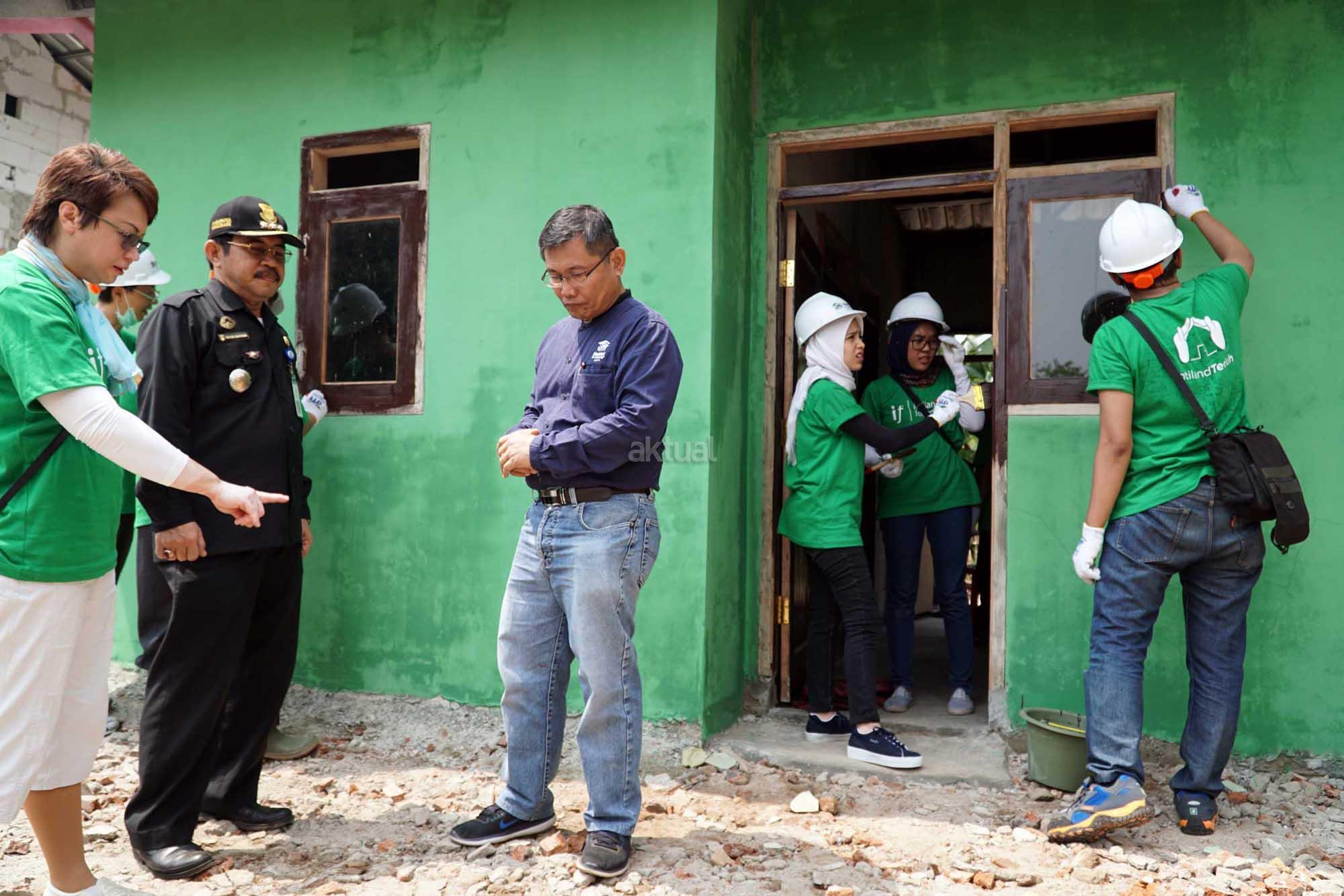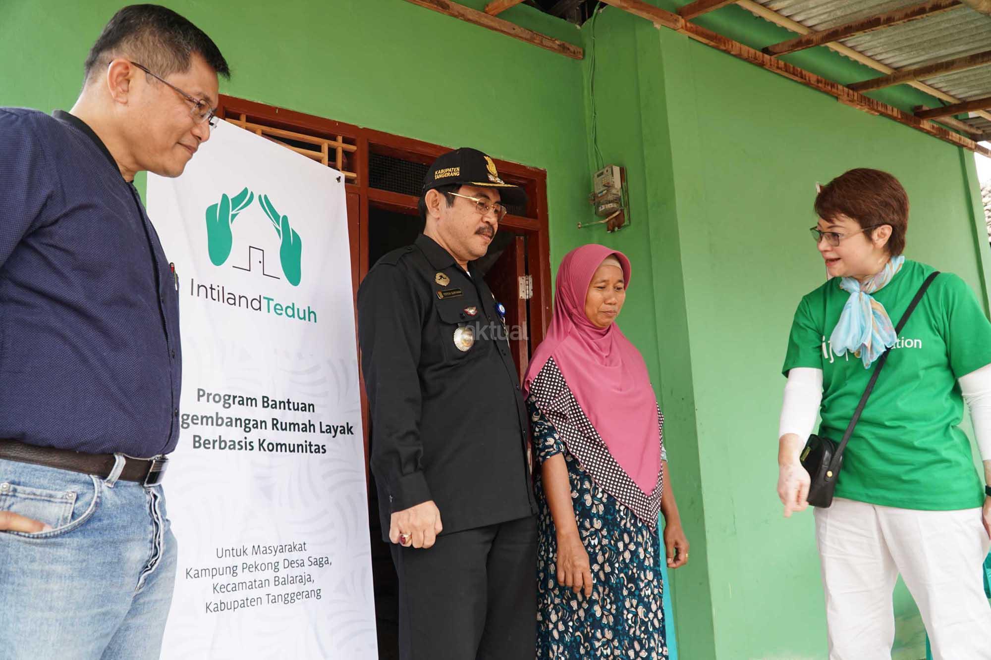 Corporate Secretary dan Head Of CSR Intiland, Theresia Rustandi (kiri) bersama Resources Development Director Habitat, Tommy Pacatang (kanan) serta Camat Balaraja, Yoyon Suryana melihat dan menyaksikan dari dekat proses akhir dan pengecatan salah sebuah rumah layak huni yang di kerjakan oleh relawan di Kampung Pekong, Desa Saga, Kabupaten Tangerang, Banten, Sabtu (5/8). Pengembang properti PT Intiland Development Tbk melalui Yayasan Intiland memulai proses serah terima bantuan 5 rumah dari 25 rumah layak huni kepada warga terpilih setempat. Proses pembangunan yang juga melibatkan relawan habitat, karyawan Intiland serta partisipasi aktif warga setempat telah dimulai beberapa bulan lalu tersebut juga dilengkapi fasilitas sanitasi publik. Sebagai pendukung kegiatan tersebut, Habitat juga memberikan pelatihan mengenai cara cara mengelola rumah yang sehat serta penyuluhan mengenai kebersihan dan gaya hidup sehat. AKTUAL/Eko S Hilman