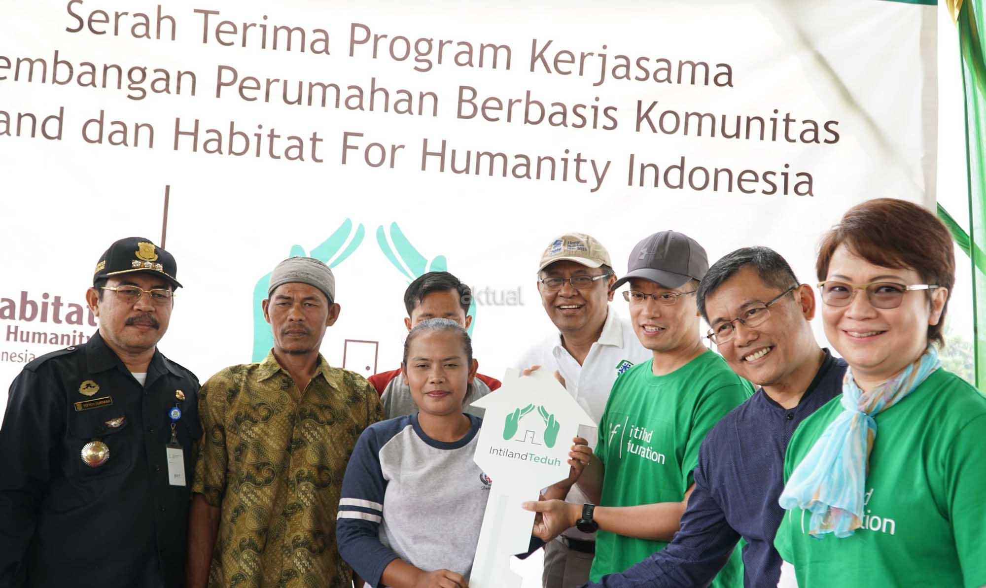 Direktur Eksekutif Intiland, Utama Gondokusumo (ketiga dari kanan) disaksikan Corporate Secretary dan Head Of CSR Intiland, Theresia Rustandi (kanan), Resources Development Director Habitat, Tommy Pacatang (kedua dari kanan) dan Camat Balaraja, Yoyon Suryana (kiri) menyerahkan secara simbolis kunci sebuah rumah layak huni kepada perwakilan warga di Kampung Pekong, Desa Saga, Kabupaten Tangerang, Banten, Sabtu (5/8). Pengembang properti PT Intiland Development Tbk melalui Yayasan Intiland memulai proses serah terima bantuan 5 rumah dari 25 rumah layak huni kepada warga terpilih setempat. Proses pembangunan yang juga melibatkan relawan habitat, karyawan Intiland serta partisipasi aktif warga setempat telah dimulai beberapa bulan lalu tersebut juga dilengkapi fasilitas sanitasi publik. Sebagai pendukung kegiatan tersebut, Habitat juga memberikan pelatihan mengenai cara cara mengelola rumah yang sehat serta penyuluhan mengenai kebersihan dan gaya hidup sehat. AKTUAL/Eko S Hilman