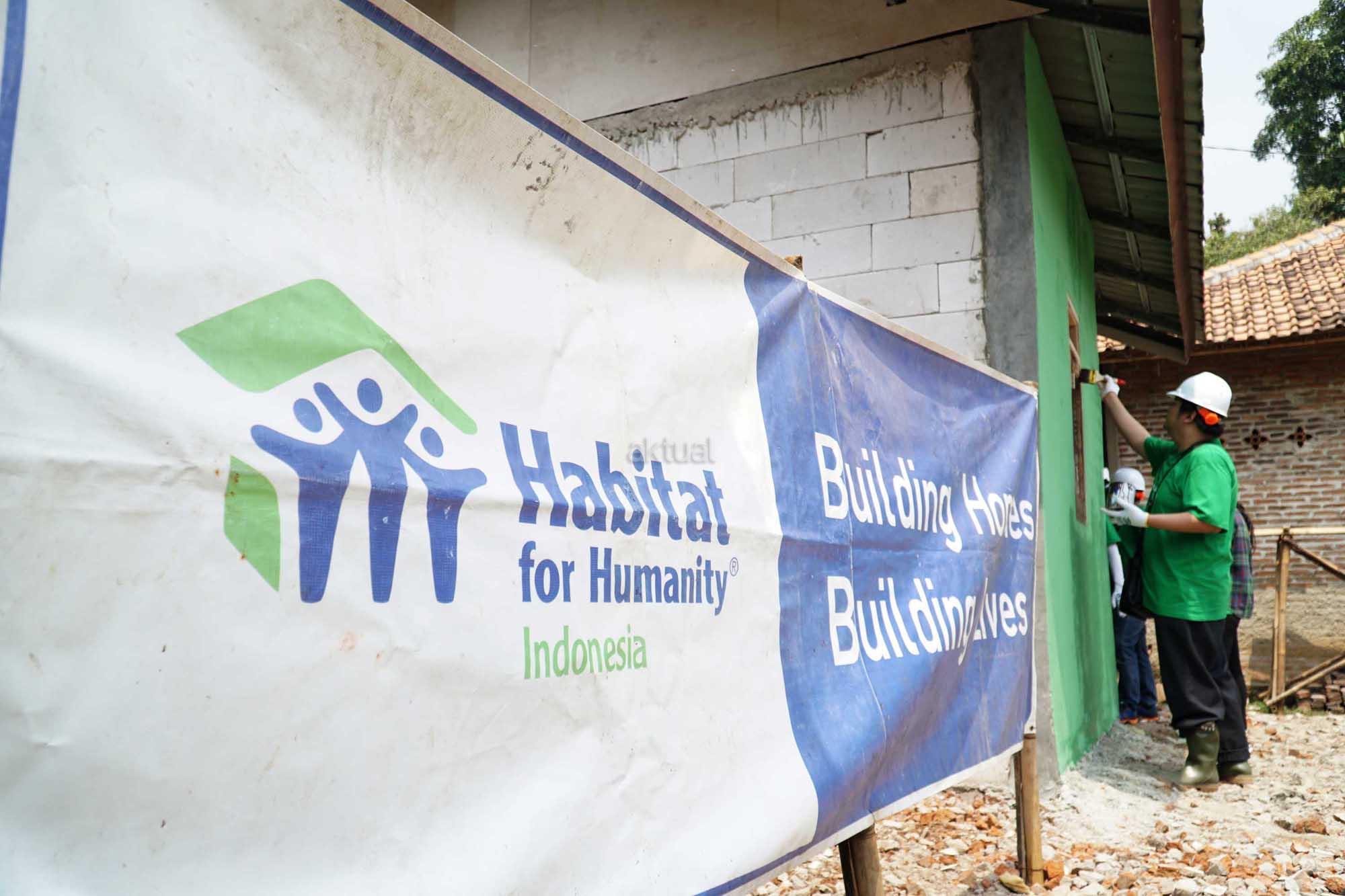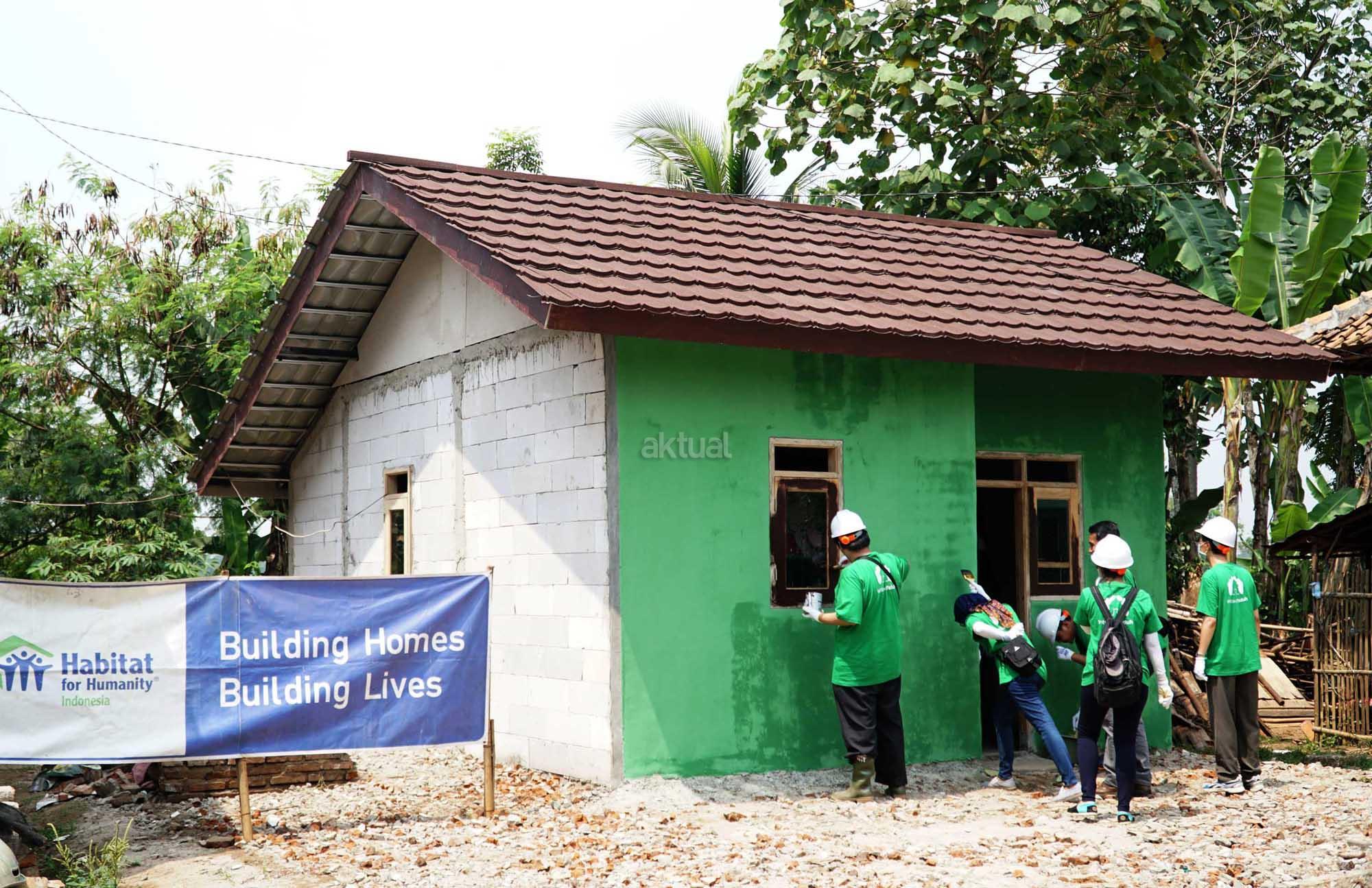 Relawan Habitat dan karyawan Intiland melakukan pengecatan salah sebuah rumah layak huni yang di kerjakan di Kampung Pekong, Desa Saga, Kabupaten Tangerang, Sabtu (5/8). Pengembang properti PT Intiland Development Tbk melalui Yayasan Intiland memulai proses serah terima bantuan 5 rumah dari 25 rumah layak huni kepada warga terpilih setempat. Proses pembangunan yang juga melibatkan relawan habitat, karyawan Intiland serta partisipasi aktif warga setempat telah dimulai beberapa bulan lalu tersebut juga dilengkapi fasilitas sanitasi publik. Sebagai pendukung kegiatan tersebut, Habitat juga memberikan pelatihan mengenai cara cara mengelola rumah yang sehat serta penyuluhan mengenai kebersihan dan gaya hidup sehat. AKTUAL/Eko S Hilman