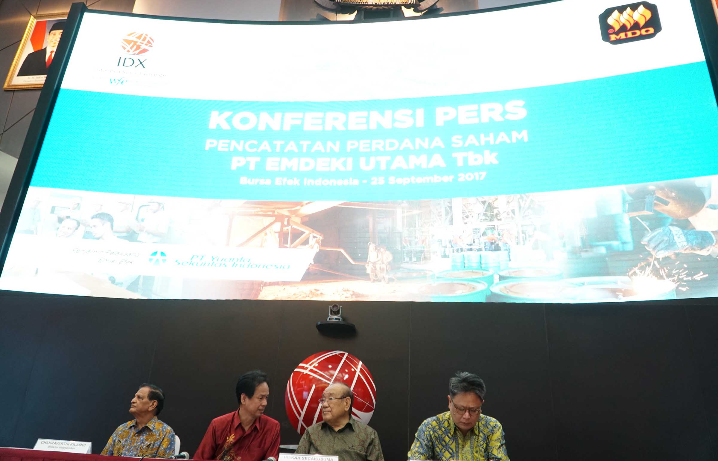 (dari kiri ke kanan), Direktur Independen PT Emdeki Utama Tbk, Chakrayarthi Kilambi, Direktur,Sencant Secapramana,Direktur Utama , Hiskak Secakusuma, Presdir PT Yuanta Sekuritas Indonesia, Surya Widjaja saat jumpa pers seusai pencatatatan saham di Main Hall Bursa Efek Indonesia, Jakarta ,Senin (25/9). Produsen kalsium karbida pertama dan satu satunya di Indonesia resmi telah mencatatkan sahamnya di BEI dengan kode saham MDKI.Perseroan melepas sejumlah 307.250.000 lembar saham baru atau setara dengan 17% dari total modal ditempatkan dan disetor penuh setelah Penawaran Umum Perdana Saham (IPO). Perseroan akan menggunakan 73,91% dana hasil IPO untuk belanja modal.Dari jumlah tersebut, sebesar 48,96% untuk membiayai pembangunan pabrik highh grade silica alloy dan 24,95% untuk membangun pabrik carbide desulphuriser.Sementar itu, sekitar 13,41% dana hasil IPO akan dialokasikan untuk modal kerja kedua pabrik tersebut dan sisanya 12,68% bakal digunakan untuk modal kerja produksi kalsium karbida.Sementara pada tahun 2016, volume produksi perseroan sebanyak 21.185 metrik ton, dengan volume penjualan sebanyak 21.169 metrik ton. AKTUAL/Eko S Hilman