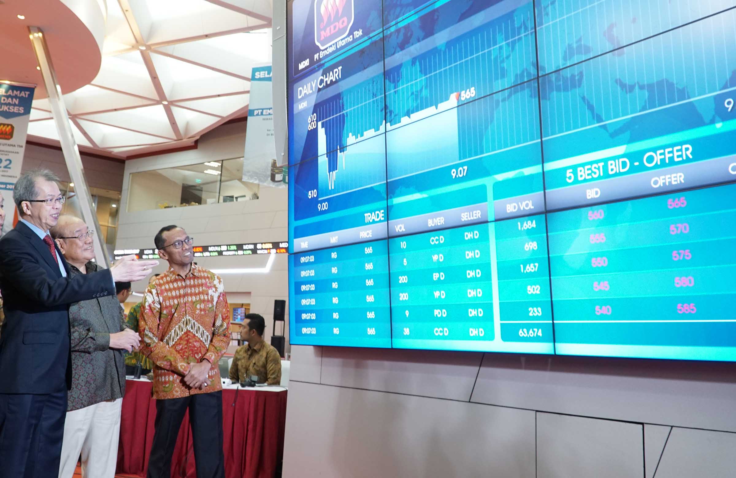 Direktur Perdagangan dan Pengaturan Anggota Bursa, Alpino Kianjaya (kiri) berbincang dengan Direktur Utama PT Emdeki Utama Tbk, Hiskak Secakusuma (tengah) dan Direktur Independen PT Emdeki Utama Tbk, Chakrayarthi Kilambi disela pencatatatan saham di Main Hall Bursa Efek Indonesia, Jakarta ,Senin (25/9). Produsen kalsium karbida pertama dan satu satunya di Indonesia resmi telah mencatatkan sahamnya di BEI dengan kode saham MDKI.Perseroan melepas sejumlah 307.250.000 lembar saham baru atau setara dengan 17% dari total modal ditempatkan dan disetor penuh setelah Penawaran Umum Perdana Saham (IPO). Perseroan akan menggunakan 73,91% dana hasil IPO untuk belanja modal.Dari jumlah tersebut, sebesar 48,96% untuk membiayai pembangunan pabrik highh grade silica alloy dan 24,95% untuk membangun pabrik carbide desulphuriser.Sementar itu, sekitar 13,41% dana hasil IPO akan dialokasikan untuk modal kerja kedua pabrik tersebut dan sisanya 12,68% bakal digunakan untuk modal kerja produksi kalsium karbida.Sementara pada tahun 2016, volume produksi perseroan sebanyak 21.185 metrik ton, dengan volume penjualan sebanyak 21.169 metrik ton. AKTUAL/Eko S Hilman