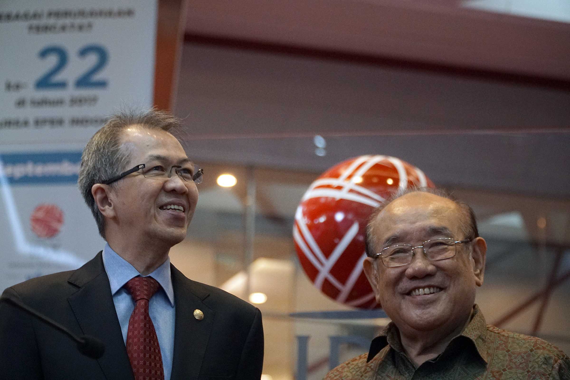 Direktur Perdagangan dan Pengaturan Anggota Bursa, Alpino Kianjaya (kiri) berbincang dengan Direktur Utama PT Emdeki Utama Tbk, Hiskak Secakusuma (kanan) disela pencatatatan saham di Main Hall Bursa Efek Indonesia, Jakarta ,Senin (25/9). Produsen kalsium karbida pertama dan satu satunya di Indonesia resmi telah mencatatkan sahamnya di BEI dengan kode saham MDKI.Perseroan melepas sejumlah 307.250.000 lembar saham baru atau setara dengan 17% dari total modal ditempatkan dan disetor penuh setelah Penawaran Umum Perdana Saham (IPO). Perseroan akan menggunakan 73,91% dana hasil IPO untuk belanja modal.Dari jumlah tersebut, sebesar 48,96% untuk membiayai pembangunan pabrik highh grade silica alloy dan 24,95% untuk membangun pabrik carbide desulphuriser.Sementar itu, sekitar 13,41% dana hasil IPO akan dialokasikan untuk modal kerja kedua pabrik tersebut dan sisanya 12,68% bakal digunakan untuk modal kerja produksi kalsium karbida.Sementara pada tahun 2016, volume produksi perseroan sebanyak 21.185 metrik ton, dengan volume penjualan sebanyak 21.169 metrik ton. AKTUAL/Eko S Hilman