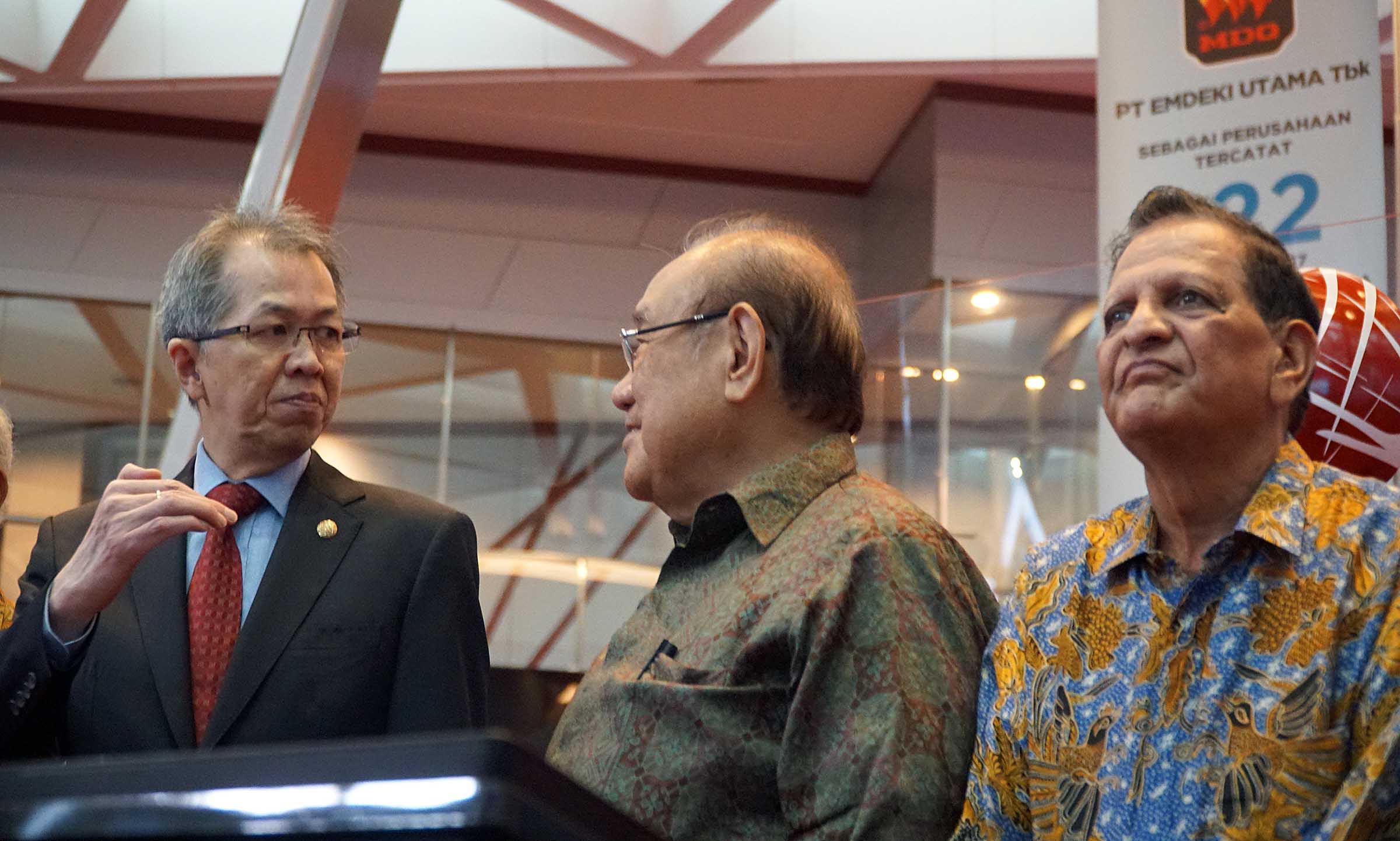 Direktur Perdagangan dan Pengaturan Anggota Bursa, Alpino Kianjaya (kiri) berbincang dengan Direktur Utama PT Emdeki Utama Tbk, Hiskak Secakusuma (tengah) dan Direktur Pengawasan Transaksi dan Kepatuhan BEI, Hamid Hassyarbaini disela pencatatatan saham di Main Hall Bursa Efek Indonesia, Jakarta ,Senin (25/9). Produsen kalsium karbida pertama dan satu satunya di Indonesia resmi telah mencatatkan sahamnya di BEI dengan kode saham MDKI.Perseroan melepas sejumlah 307.250.000 lembar saham baru atau setara dengan 17% dari total modal ditempatkan dan disetor penuh setelah Penawaran Umum Perdana Saham (IPO). Perseroan akan menggunakan 73,91% dana hasil IPO untuk belanja modal.Dari jumlah tersebut, sebesar 48,96% untuk membiayai pembangunan pabrik highh grade silica alloy dan 24,95% untuk membangun pabrik carbide desulphuriser.Sementar itu, sekitar 13,41% dana hasil IPO akan dialokasikan untuk modal kerja kedua pabrik tersebut dan sisanya 12,68% bakal digunakan untuk modal kerja produksi kalsium karbida.Sementara pada tahun 2016, volume produksi perseroan sebanyak 21.185 metrik ton, dengan volume penjualan sebanyak 21.169 metrik ton. AKTUAL/Eko S Hilman