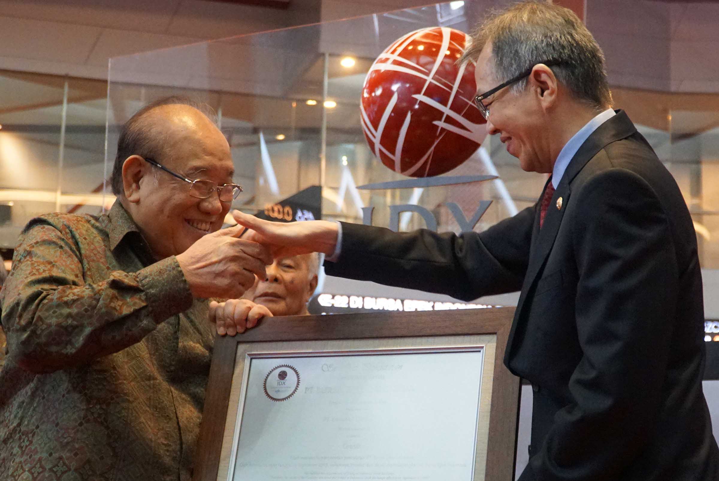 Direktur Perdagangan dan Pengaturan Anggota Bursa, Alpino Kianjaya (kiri) menyerahkan sertifikat pencatatan kepada Direktur Utama PT Emdeki Utama Tbk, Hiskak Secakusuma (kanan) disela pencatatatan saham di Main Hall Bursa Efek Indonesia, Jakarta ,Senin (25/9). Produsen kalsium karbida pertama dan satu satunya di Indonesia resmi telah mencatatkan sahamnya di BEI dengan kode saham MDKI.Perseroan melepas sejumlah 307.250.000 lembar saham baru atau setara dengan 17% dari total modal ditempatkan dan disetor penuh setelah Penawaran Umum Perdana Saham (IPO). Perseroan akan menggunakan 73,91% dana hasil IPO untuk belanja modal.Dari jumlah tersebut, sebesar 48,96% untuk membiayai pembangunan pabrik highh grade silica alloy dan 24,95% untuk membangun pabrik carbide desulphuriser.Sementar itu, sekitar 13,41% dana hasil IPO akan dialokasikan untuk modal kerja kedua pabrik tersebut dan sisanya 12,68% bakal digunakan untuk modal kerja produksi kalsium karbida.Sementara pada tahun 2016, volume produksi perseroan sebanyak 21.185 metrik ton, dengan volume penjualan sebanyak 21.169 metrik ton. AKTUAL/Eko S Hilman