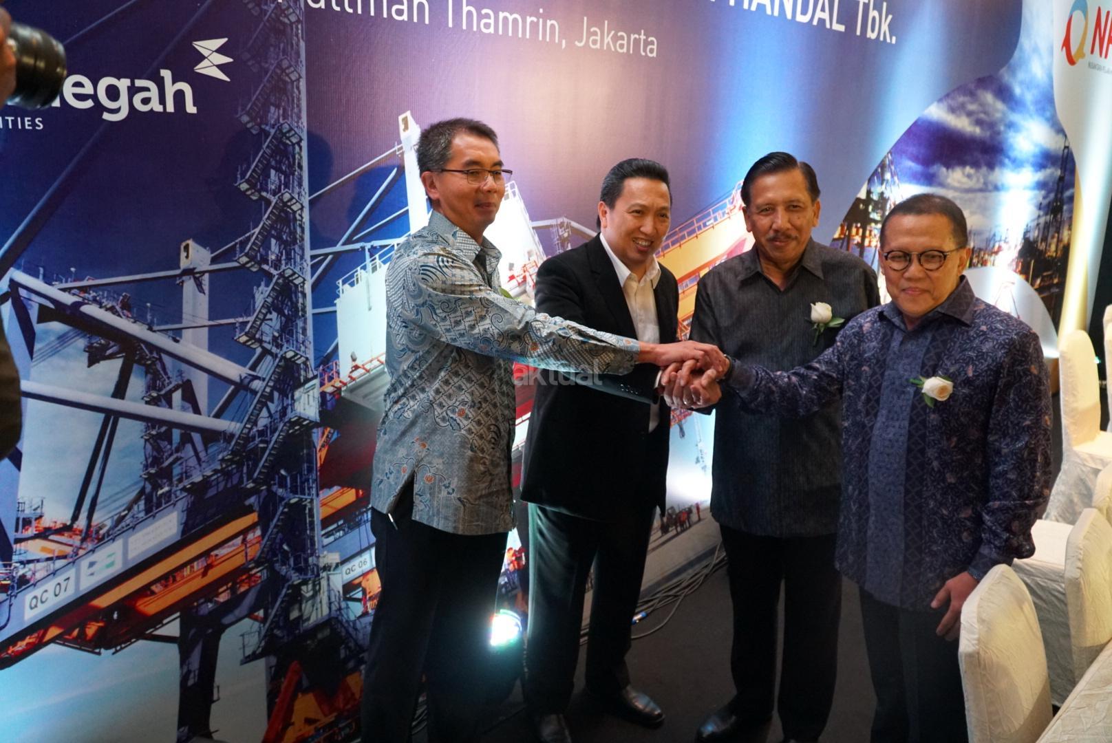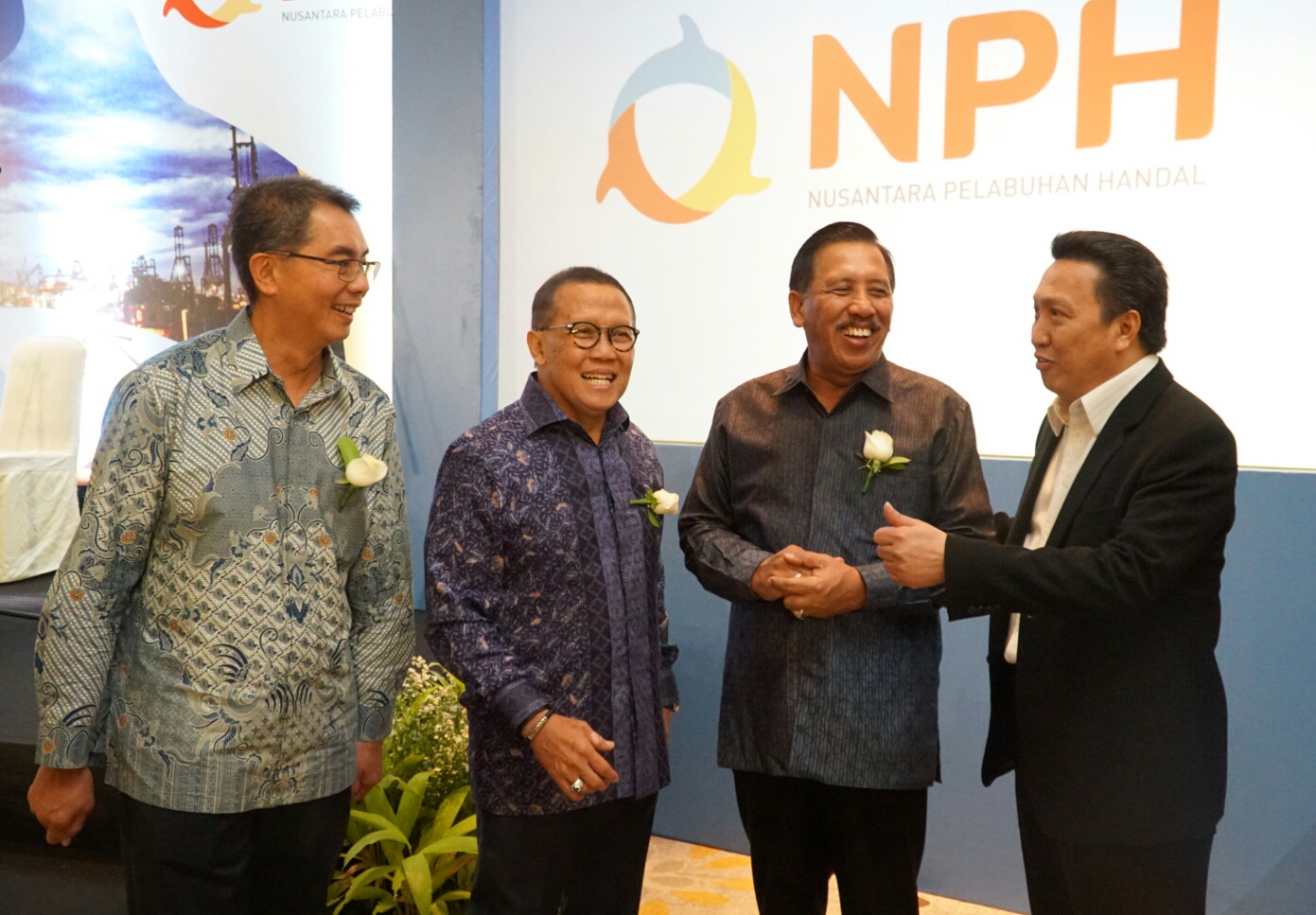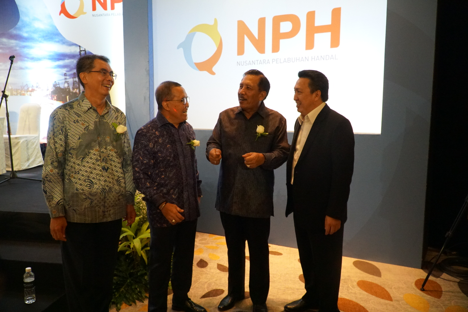 Direktur Utama PT Nusantara Pelabuhan Handal Tbk, Paul Krisnadi (kiri),Pengusaha Nasional yang menjabat sebagai Pemegang Saham Pengendali perseroan, Garibaldi Thohir( kanan), Komisaris Utama, Agus Suhartono (kedua dari kanan) serta Komisaris Independen, Eddy Kuntadi berbincang seusai Penawaran Umum Perdana Saham di Jakarta,Kamis (9/2).Perusahaan yang mengoperasikan dan mengembangkan terminal peti kemas dan kargo termasuk dalam melakukan desain dan memasok peralatan terminal (menyediakan end to end port bussiness solution) menerbitkan sebanyak 576.858.100 saham baru atau sekitar 20,5% dari modalnya setelah penawaran umum. AKTUAL/Eko S Hilman