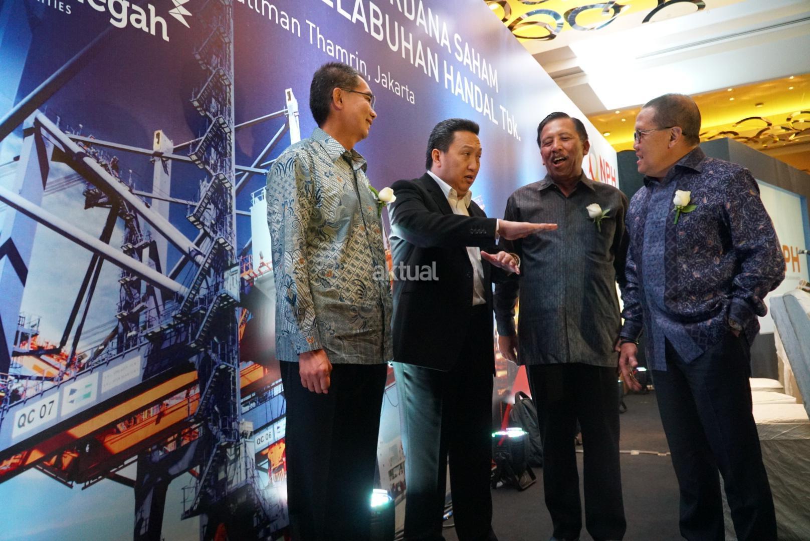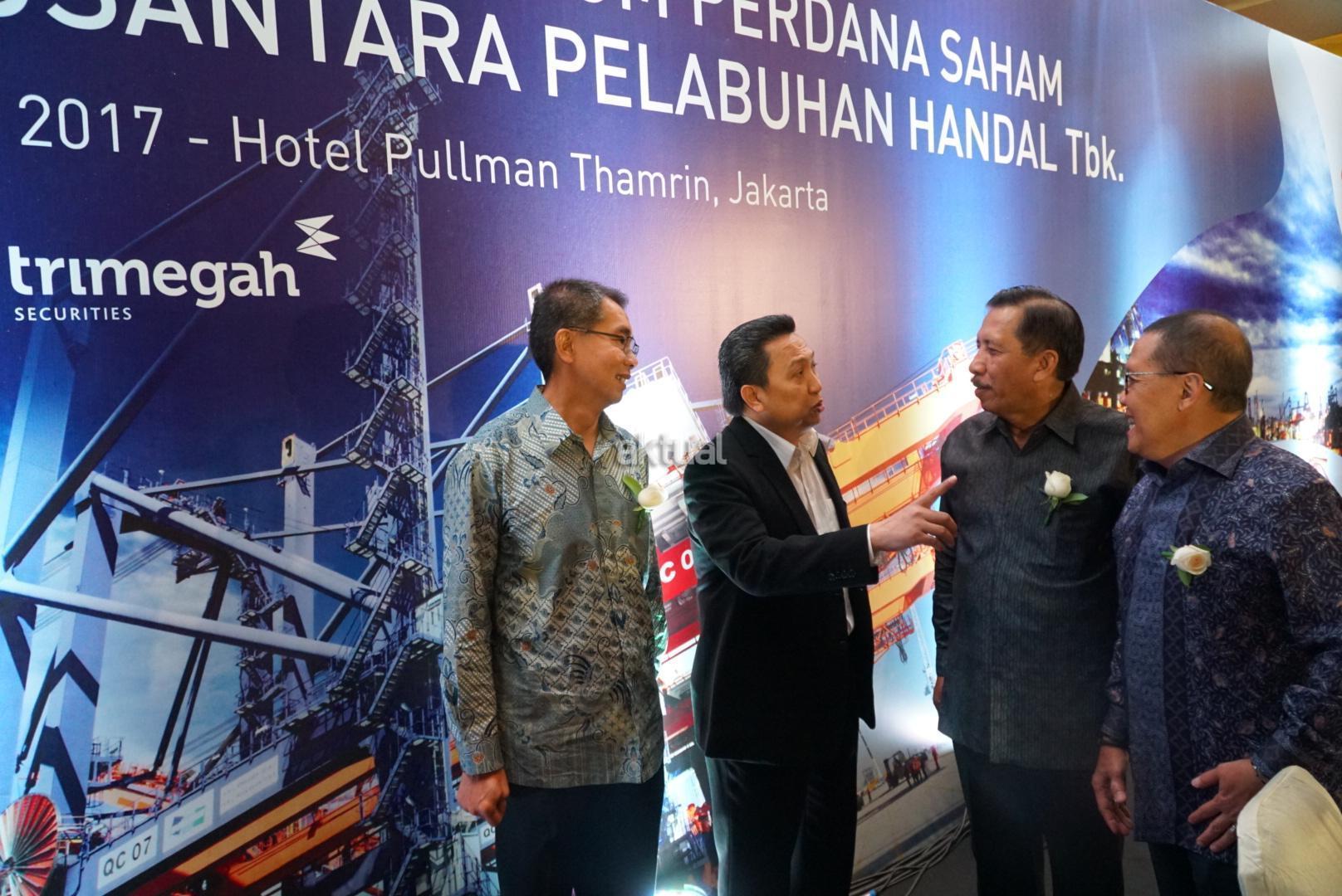 Dari kiri ke kanan, Direktur Utama PT Nusantara Pelabuhan Handal Tbk Paul Krisnadi, Pengusaha Nasional yang menjabat sebagai Pemegang Saham Pengendali perseroan Garibaldi Thohir, Komisaris Utama Agus Suhartono serta Komisaris Independen Eddy Kuntadi berbincang seusai Penawaran Umum Perdana Saham di Jakarta, Kamis (9/2). Perusahaan yang mengoperasikan dan mengembangkan terminal peti kemas dan kargo termasuk dalam melakukan desain dan memasok peralatan terminal (menyediakan end to end port bussiness solution) menerbitkan sebanyak 576.858.100 saham baru atau sekitar 20,5% dari modalnya setelah penawaran umum. AKTUAL/Eko S Hilman