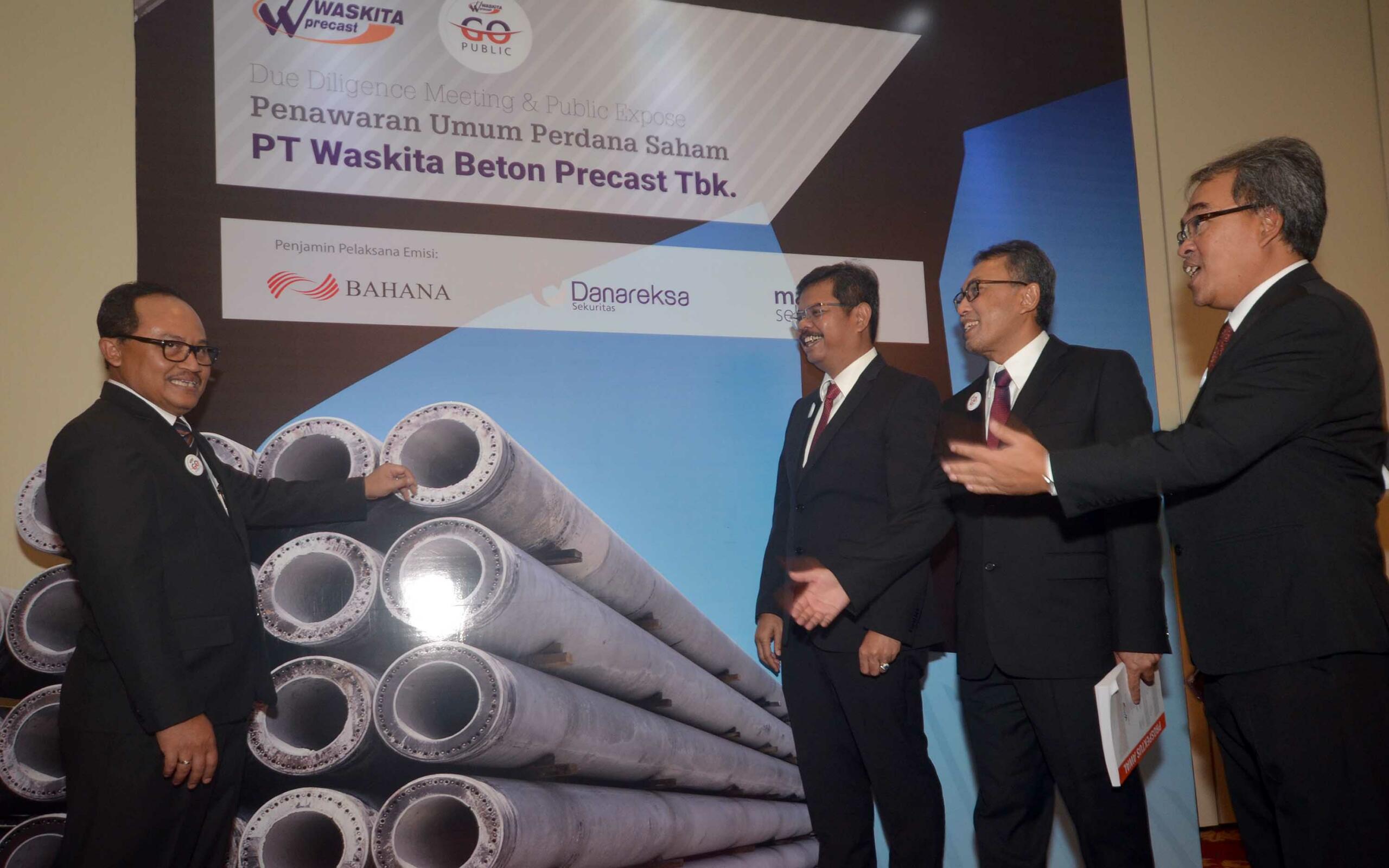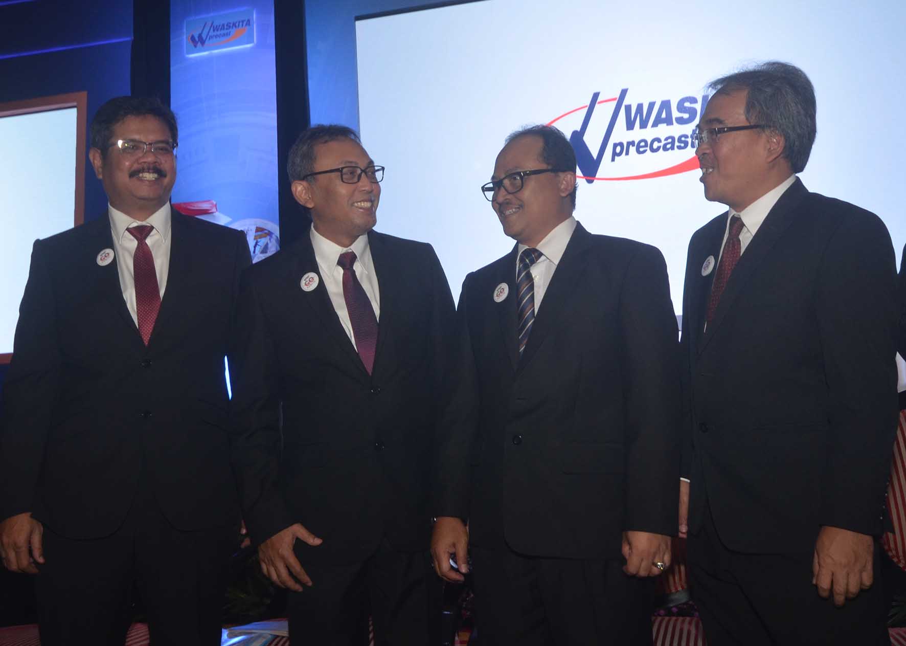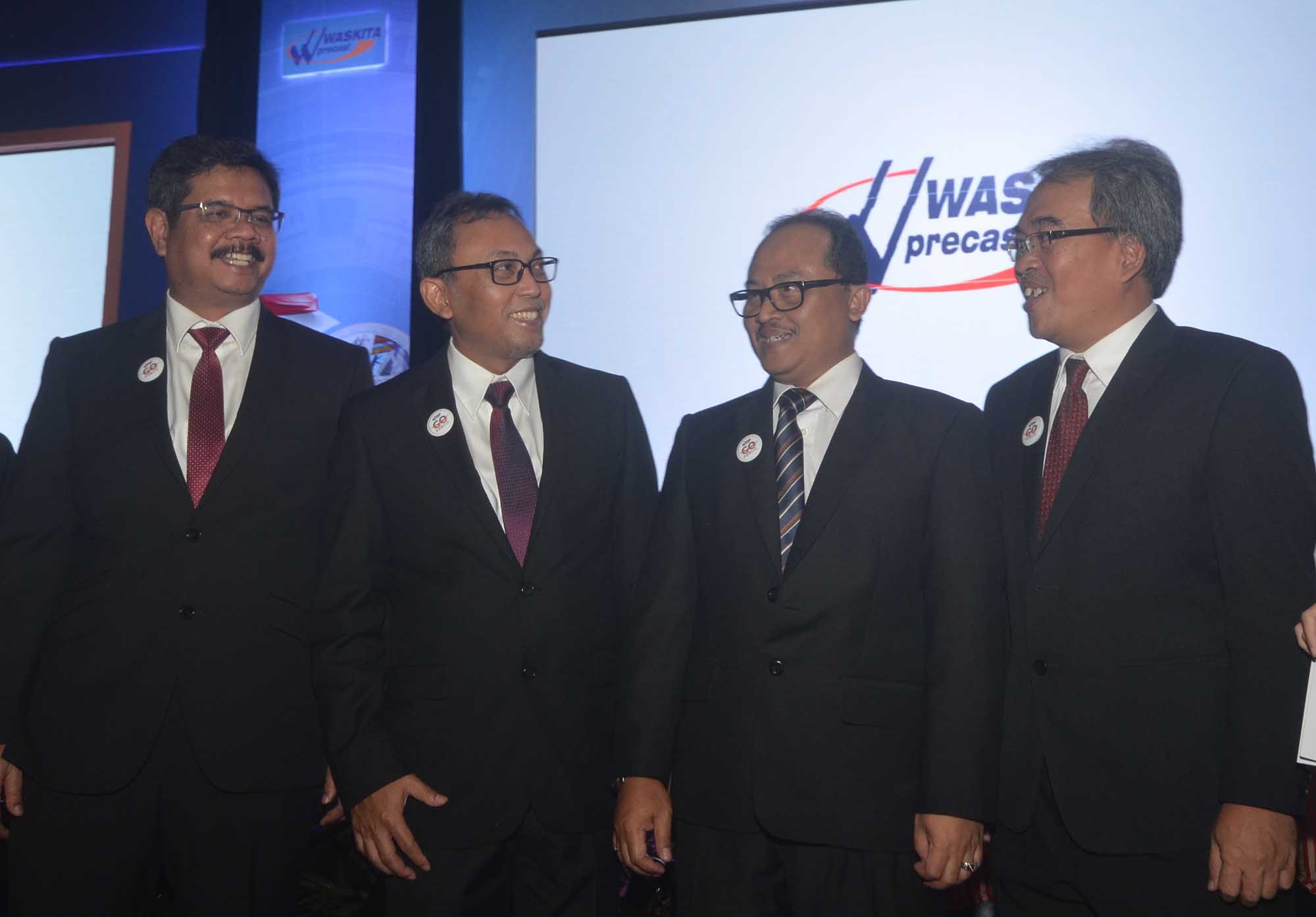 Direktur Utama PT Waskita Beton Precast Tbk, Jarot Subana (kiri) berbincang dengan (dari kiri ke kanan) Direktur Teknik & Operasi, Agus Wantoro, Direktur Pengembangan & SDM, Anton Y Nugroho, Direktur Keuangan, Budy Setyono seusai paparan publik penawaran umum perdana (IPO) saham di Jakarta , Rabu (10/8). Anak Usaha PT Waskita Karya (persero) Tbk (WSKT) ini menawarkan sebanyak banyak 10.544.463.000 saham atau setara dengan sebanyak banyaknya sebesar 40% dari modal ditempatkan dan disetor penuh setelah penawaran umum.WSKT akan menggunakan dana hasil IPO saham untuk keperluan modal kerja dan pengembangan usaha perseroan.Perusahaan yang bergerak di bidang industri manufaktur beton precast dan ready mix, saat ini, pemegang saham terbesar perseroan adalah waskita karya dengan kepemilikan sebesar 99,99%. Sisanya 0,01% dimiliki Koperasi Waskita.