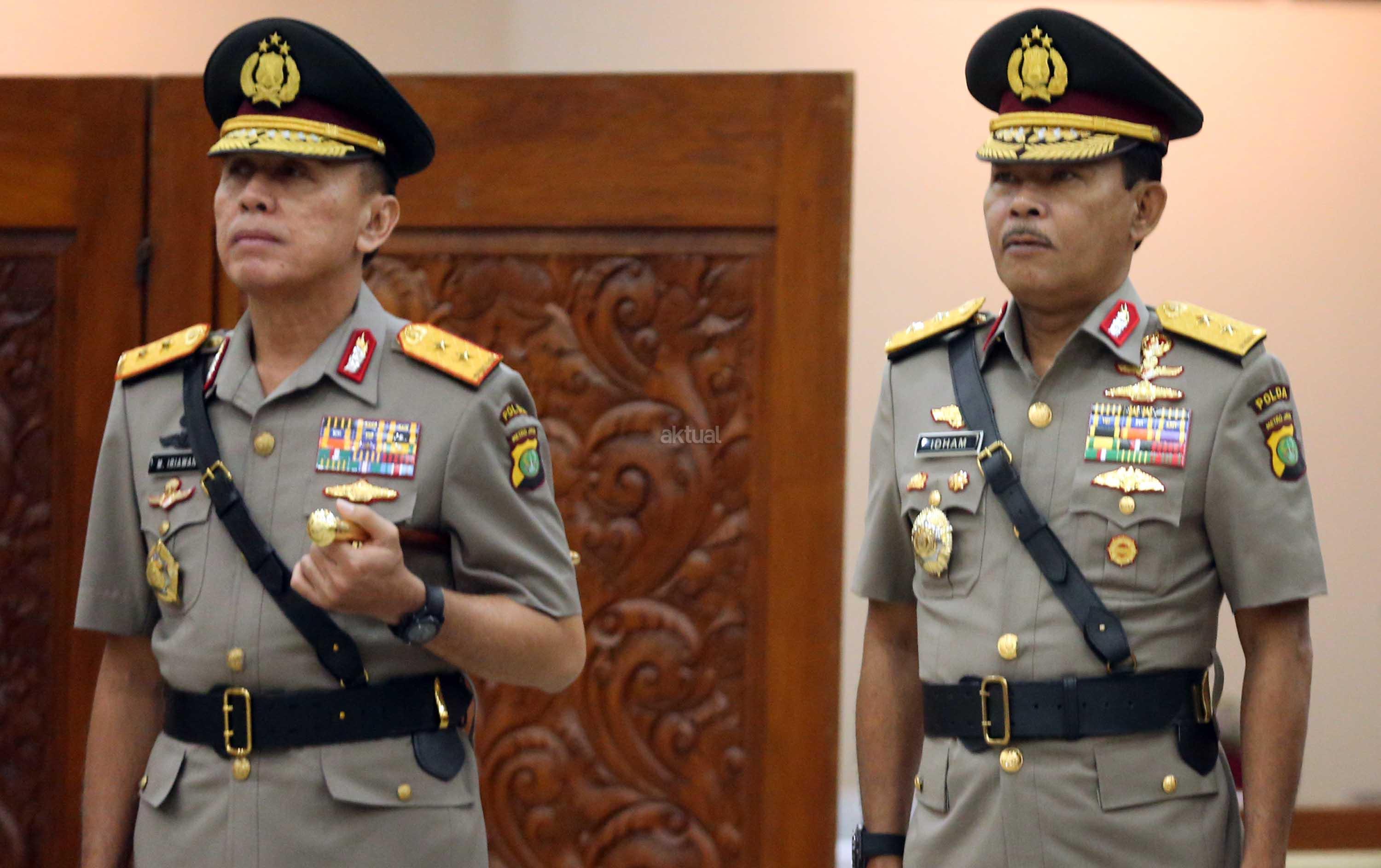 Pejabat baru Kapolda Metro Jaya, Irjen Pol Idham Azis (kanan) bersama dengan pejabat lama Kapolda Metro Jaya, Irjen Pol M. Iriawan (kiri) memasuki ruangan saat akan melakukan serah terima jabatan Kapolda Metro Jaya di Mabes Polri, Jakarta, Rabu (26/7). Idham Azis yang sebelumnya menjabat sebagai Kadiv Propam Polri telah resmi menjabat sebagai Kapolda Metro Jaya menggantikan M. Iriawan. AKTUAL/Tino Oktaviano