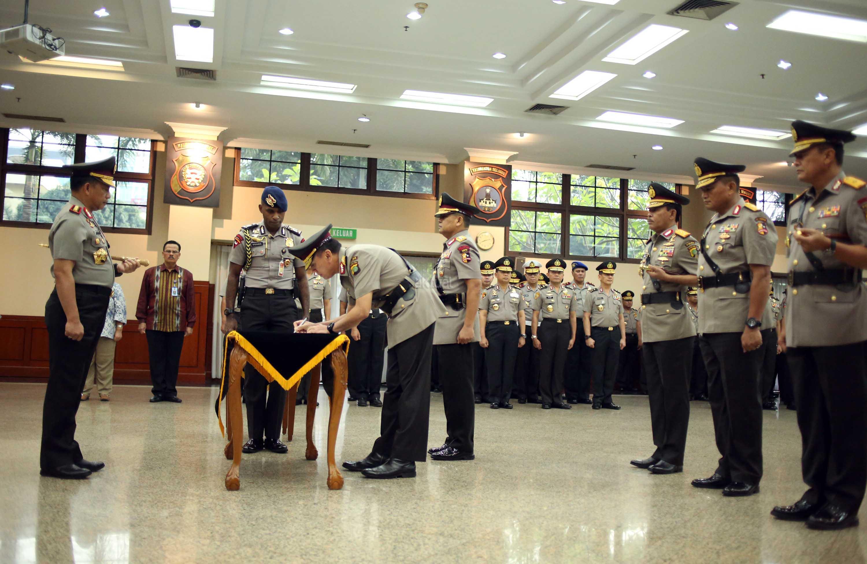 Irjen Idham Azis menandatangani dokumen serah terima jabatan disaksikan Kapolri Jenderal Tito Karnavian di Rupatama Mabes Polri, Rabu (26/7). Idham Azis dilantik sebagai Kapolda Metro Jaya menggantikan Irjen Mochamad Iriawan. AKTUAL/Tino Oktaviano