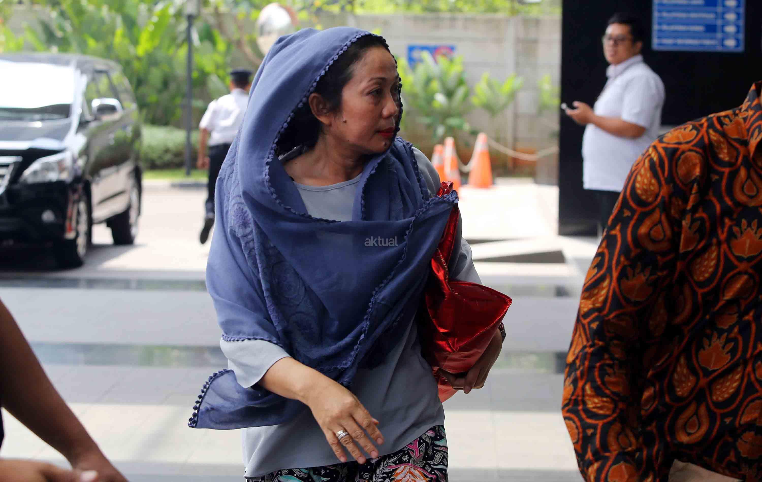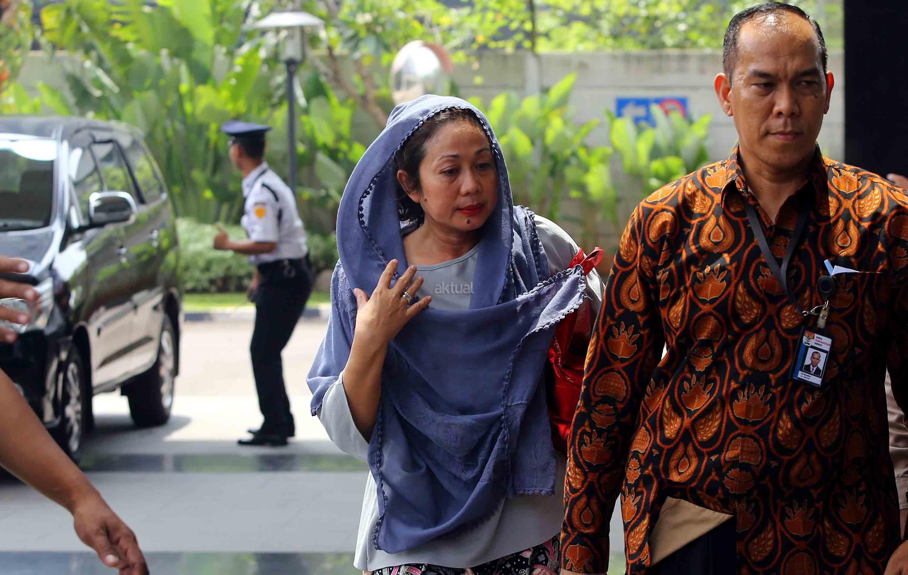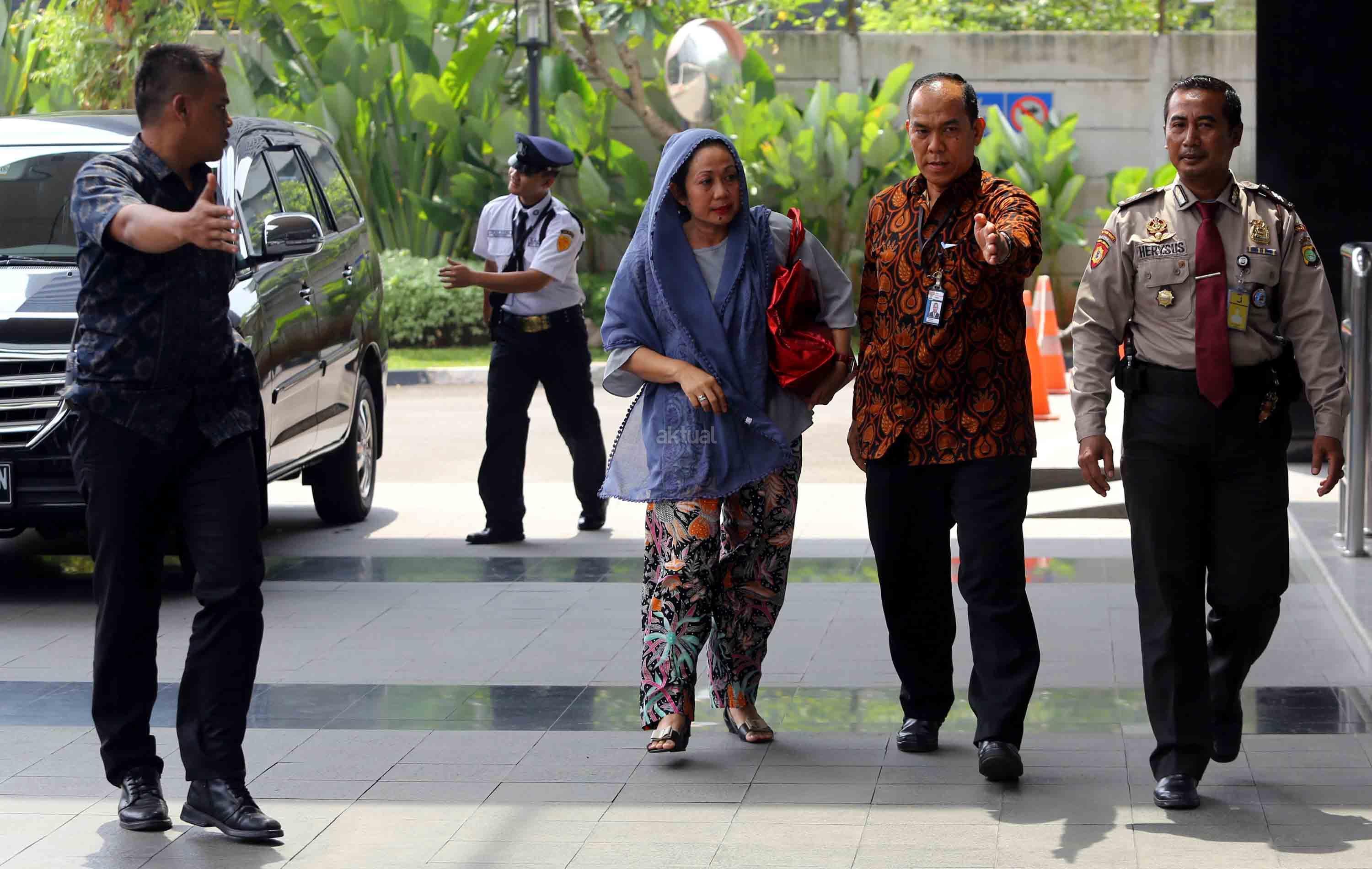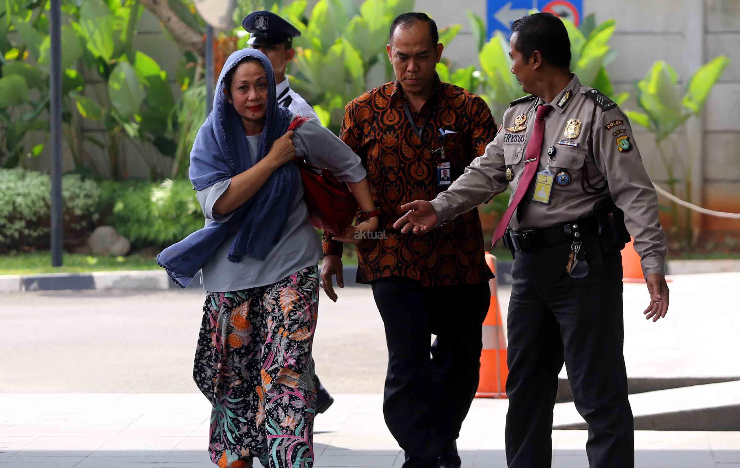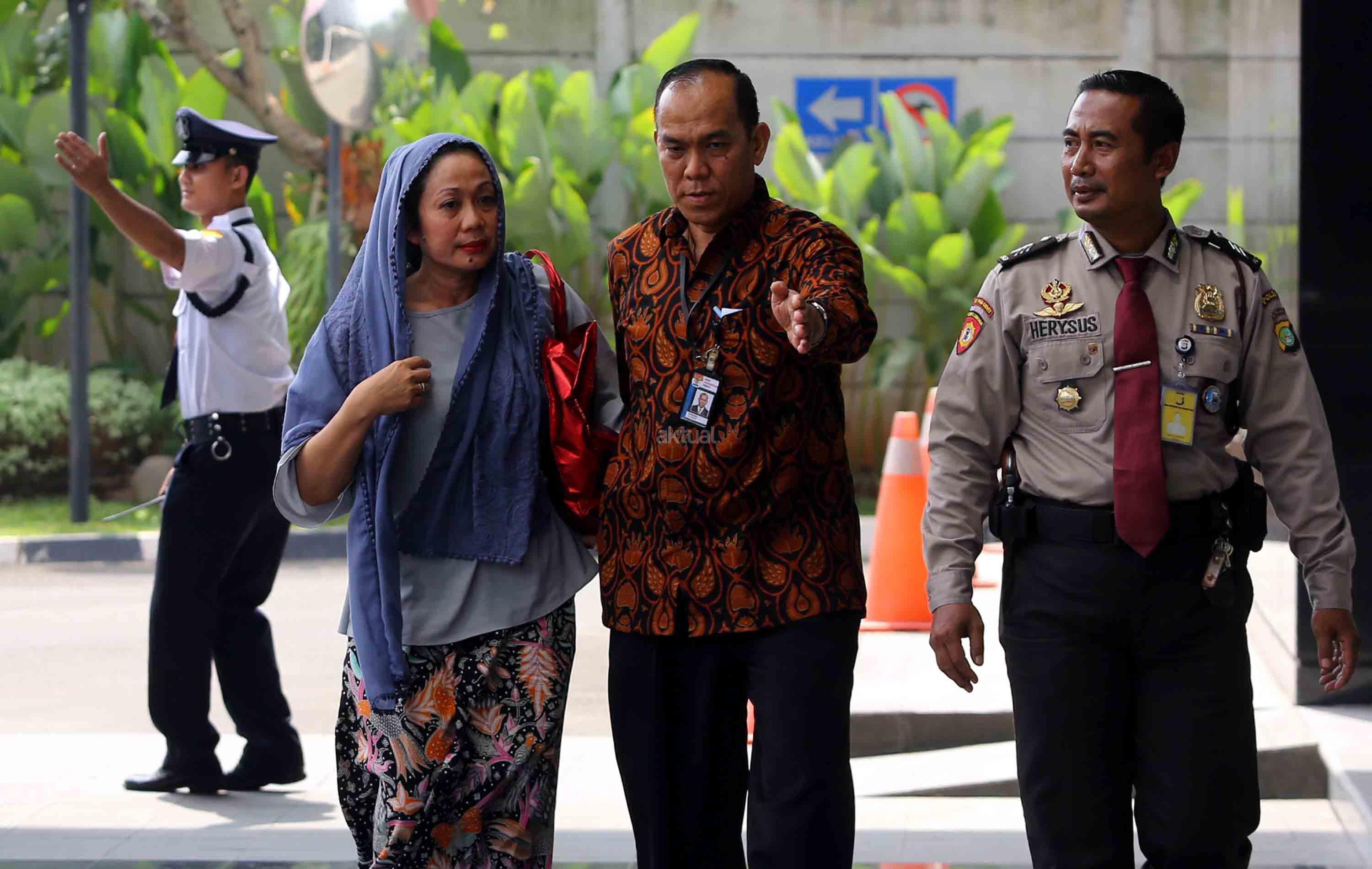 Istri Bupati Bengkulu Selatan Dirwan Mahmud, Heni Dirwan (tengah), digiring petugas saat tiba untuk menjalani pemeriksaan di gedung KPK, Jakarta, Rabu (16/5/18). KPK melakukan Operasi Tangkap Tangan (OTT) terhadap Bupati Bengkulu Selatan Dirwan Mahmud di kediamannya. Dari OTT tersebut turut terjaring istri dari Dirwan Mahmud, Heni Dirwan, wiraswasta JU, dan WA dengan barang bukti uang sekitar Rp100 juta. AKTUAL/Tino Oktaviano