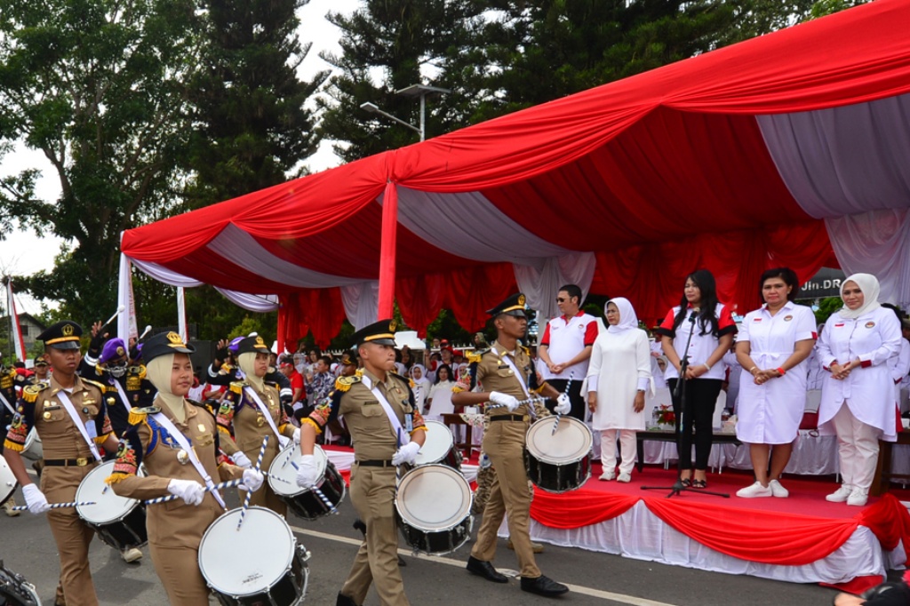 Ketua bidang Sosial Budaya Organisasi Aksi Solidaritas Era (OASE) Nora Tristyana Ryamizard Ryacudu (kedua kanan) & Ketua Dharma Wanita Persatuan (DWP) Kementerian Pertahanan RI Lia Hadiyan Sumintaatmadja (kanan) saat melepas Parade Bela Negara yang dilaksanakan di Tandano, Kabupaten Minahasa Sulawesi Utara, Senin (11/12/2017). Parade kegiatan Program Bela Negara ini diharapkan menjadi daya tangkal dalam menghadpi ancaman nasional yang dapat muncul dalam masyarakat. AKTUAL/HO