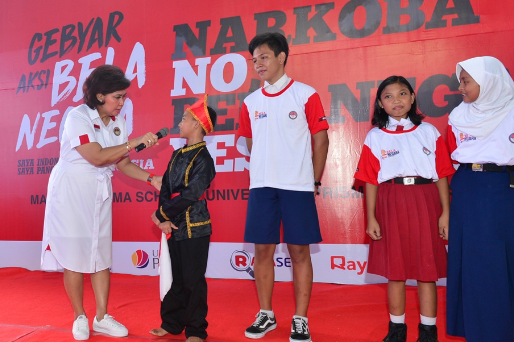 Ketua Bidang Sosial Budaya Organisasi Aksi Solidaritas Era (OASE) Nora Tristyana Ryamizard Ryacudu, bersama para Pelajar saat menghadiri Parade Bela Negara yang Dilaksanakan di Tandano, Kabupaten Minahasa, Sulawesi Utara, Senin (11/12/2017). Parade kegiatan Program Bela Negara ini diharapkan menjadi daya tangkal dalam menghadpi ancaman nasional yang dapat muncul dalam masyarakat. AKTUAL/HO