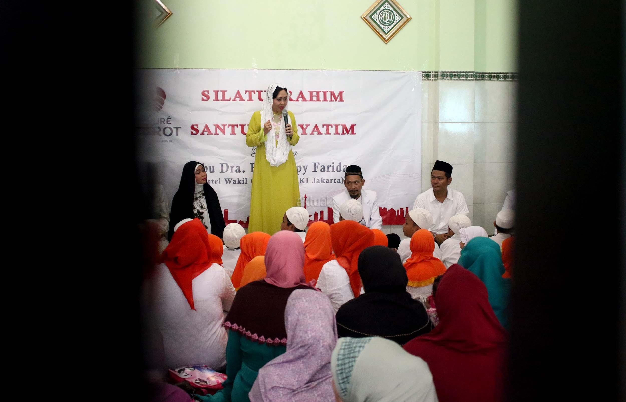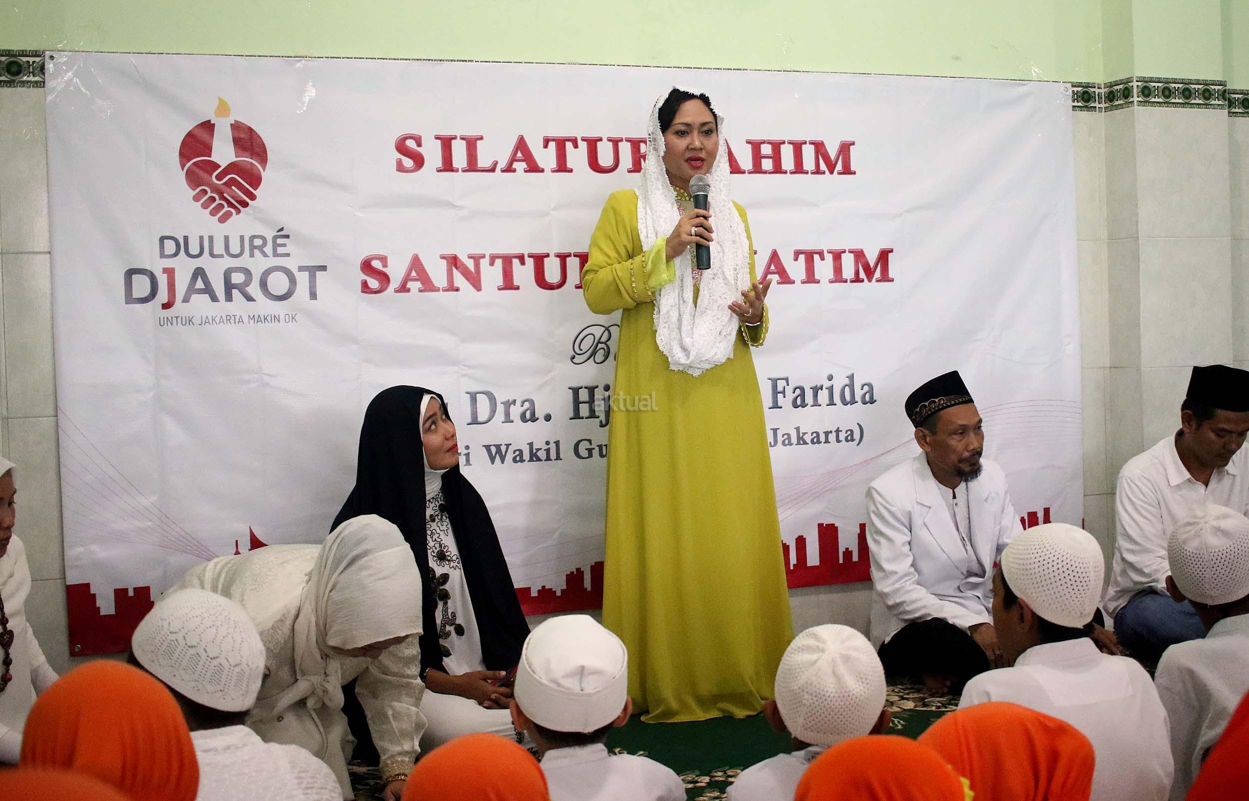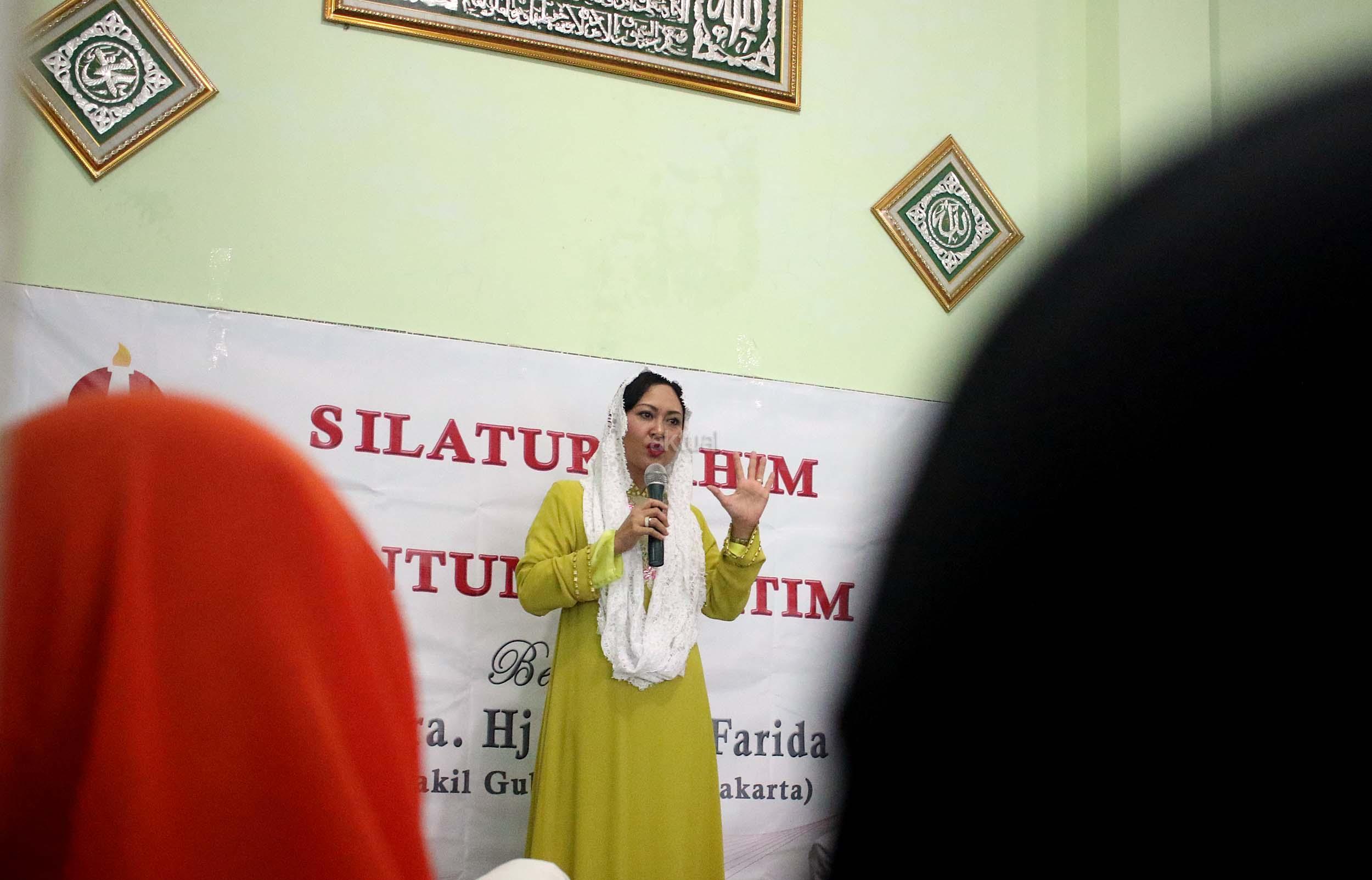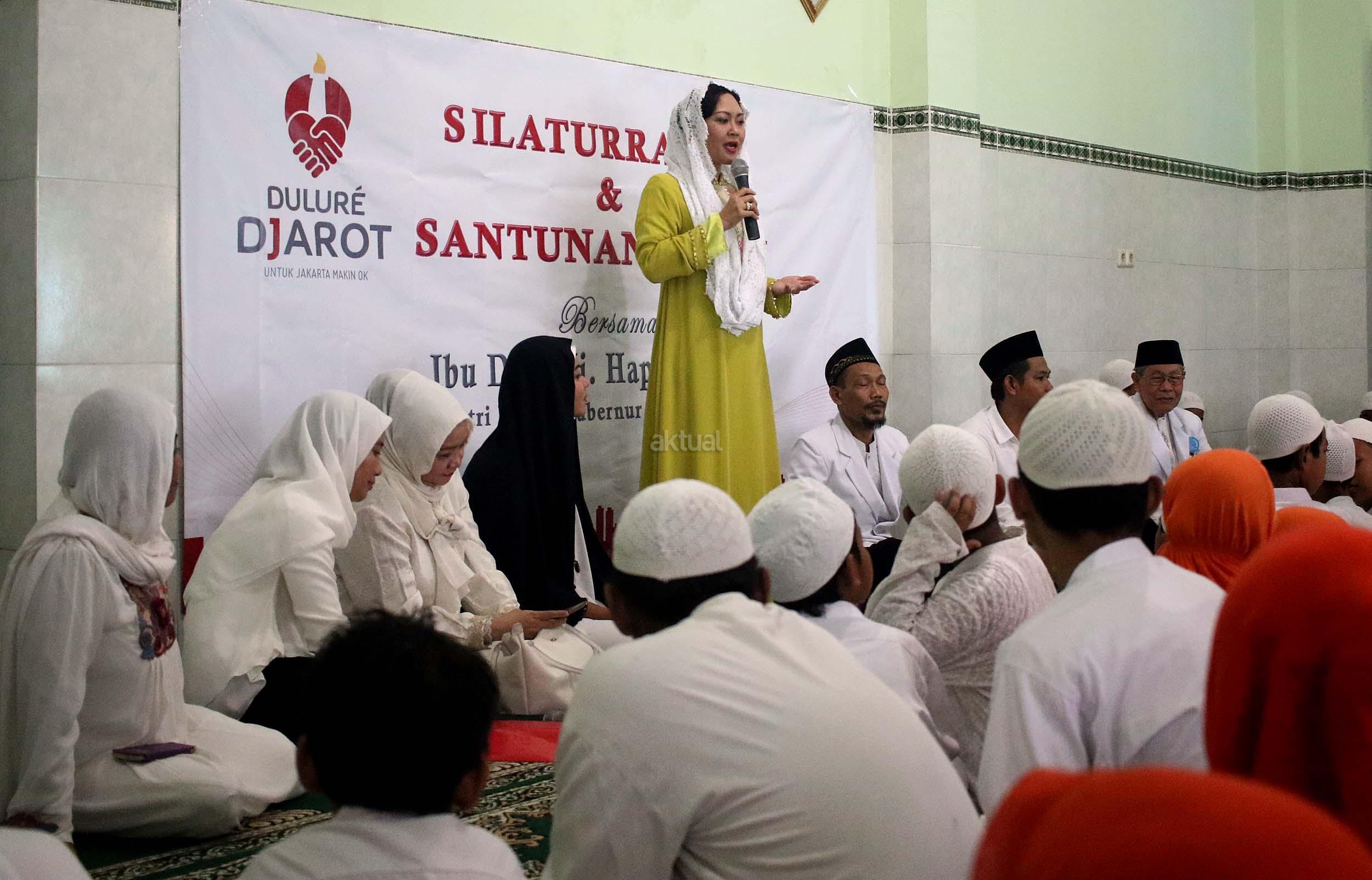 Istri wakil Gubernur DKI Jakarta Happy Farida Djarot (tengah) memberikan sambutan saat acara silahturahmi di yayasan Nurul Hikmah Halim di Jakarta, Rabu (12/10/2016). Dalam acara tersebut Happy Djarot juga menyempatkan diri untuk mendengarkan keluh kesah warga dan sekalian memberikan santunan kepada anak yatim.