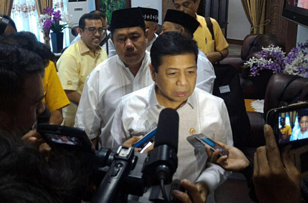 Ketua Umum Golkar, Setya Novanto, menjawab pertanyaan wartawan saat safari ramadan di Bengkulu, Jumat (24/8). Setya Novanto mengatakan kedatangannya ke Bengkulu juga untuk mengunjungi gubernur yang merupakan kader Partai Golkar guna melihat lebih jauh program-program yang sudah dan akan dilaksanakan. Bengkulu merupakan salah satu daerah yang perlu mendapatkan perhatian khusus, mengingat hingga saat ini masih terus berjuang mengejar ketertinggalan dari daerah lain. AKTUAL/HO