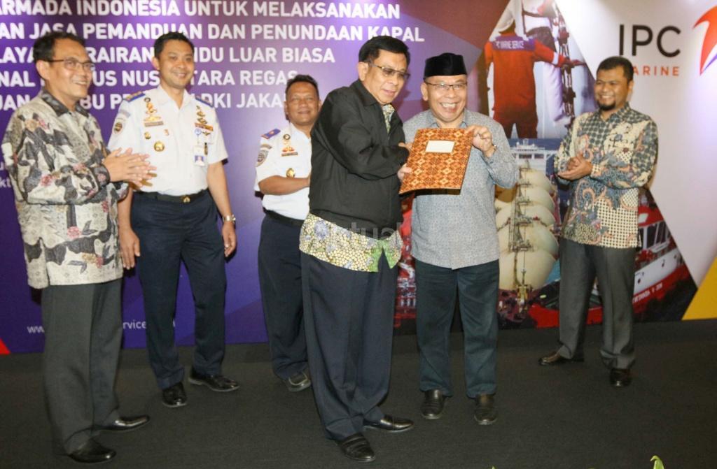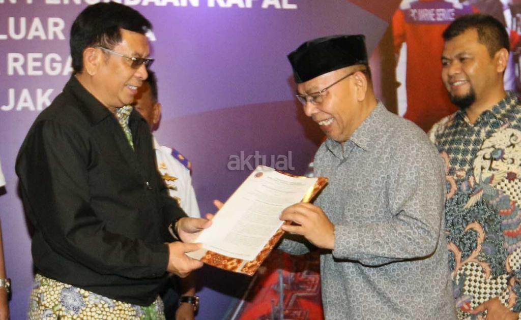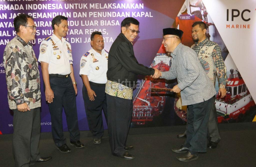 Dari kiri ke kanan, Direktur Komersial & Operasi PT Jasa Armada Indonesia Capt. Supardi, Subdit Pemanduan & Penundaan Kapal Kementerian Perhubungan Irnanta, KSOP Kepulauan Seribu Kementerian Perhubungan Syarief, Plt Dirjen Perhubungan Laut Kementrian Perhubungan Bay M Hasani, Direktur Utama PT Jasa Armada Indonesia Dawam Atmosudiro, Direktur Keuangan & SDM PT Jasa Armada Indonesia Herman Susilo saat hadir dalam pemberian izin kepada badan usaha pelabuhan di Jakarta, Selasa (24/10). PT Jasa Armada Indonesia untuk melaksanakan pelayanan jasa pemanduan dan penundaan kapal pada wilayah perairan pandu luar biasa di terminal khusus nusantara Regas, Kepulauan Seribu Provinsi DKI Jakarta. AKTUAL/Eko S Hilman