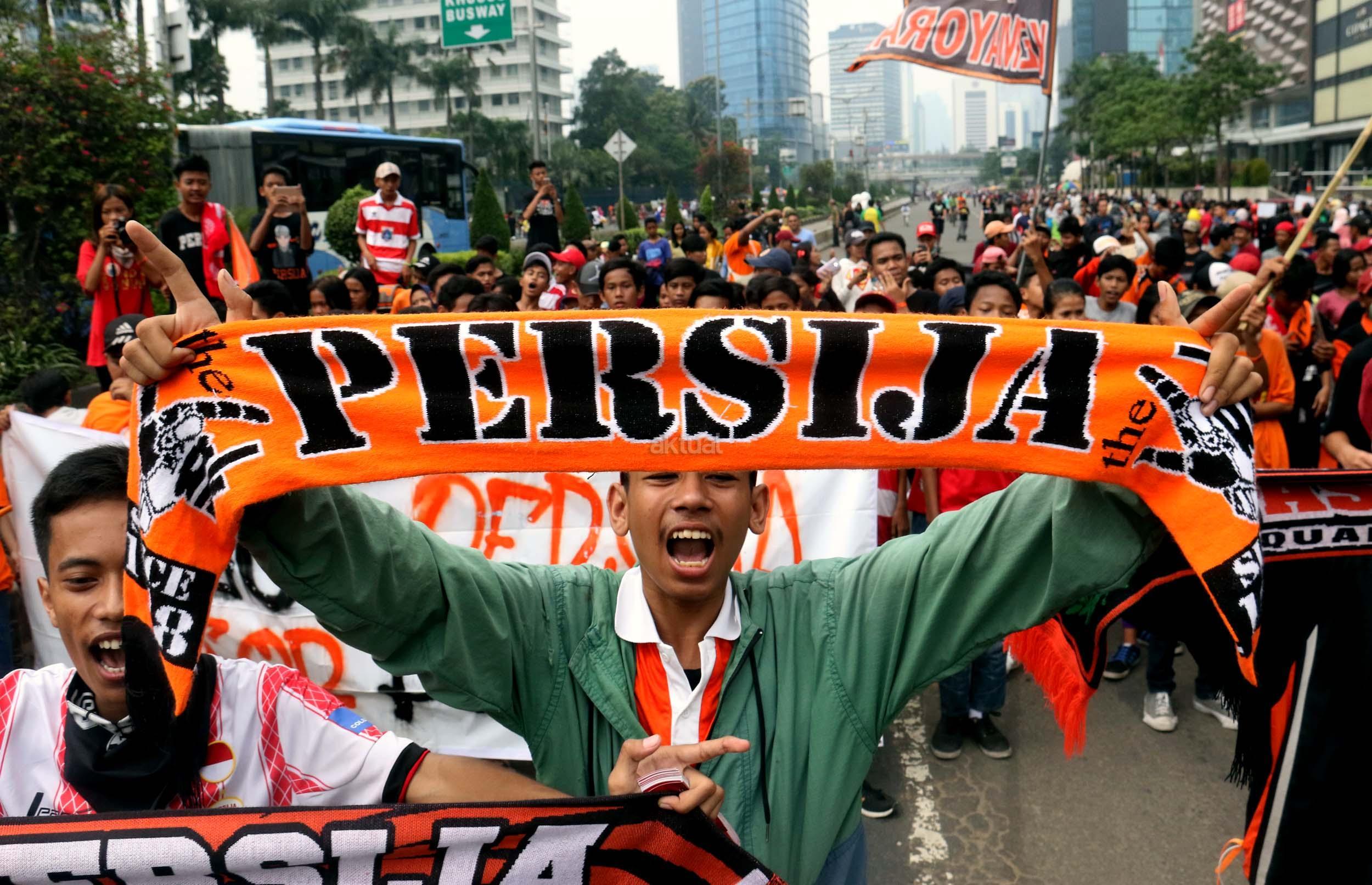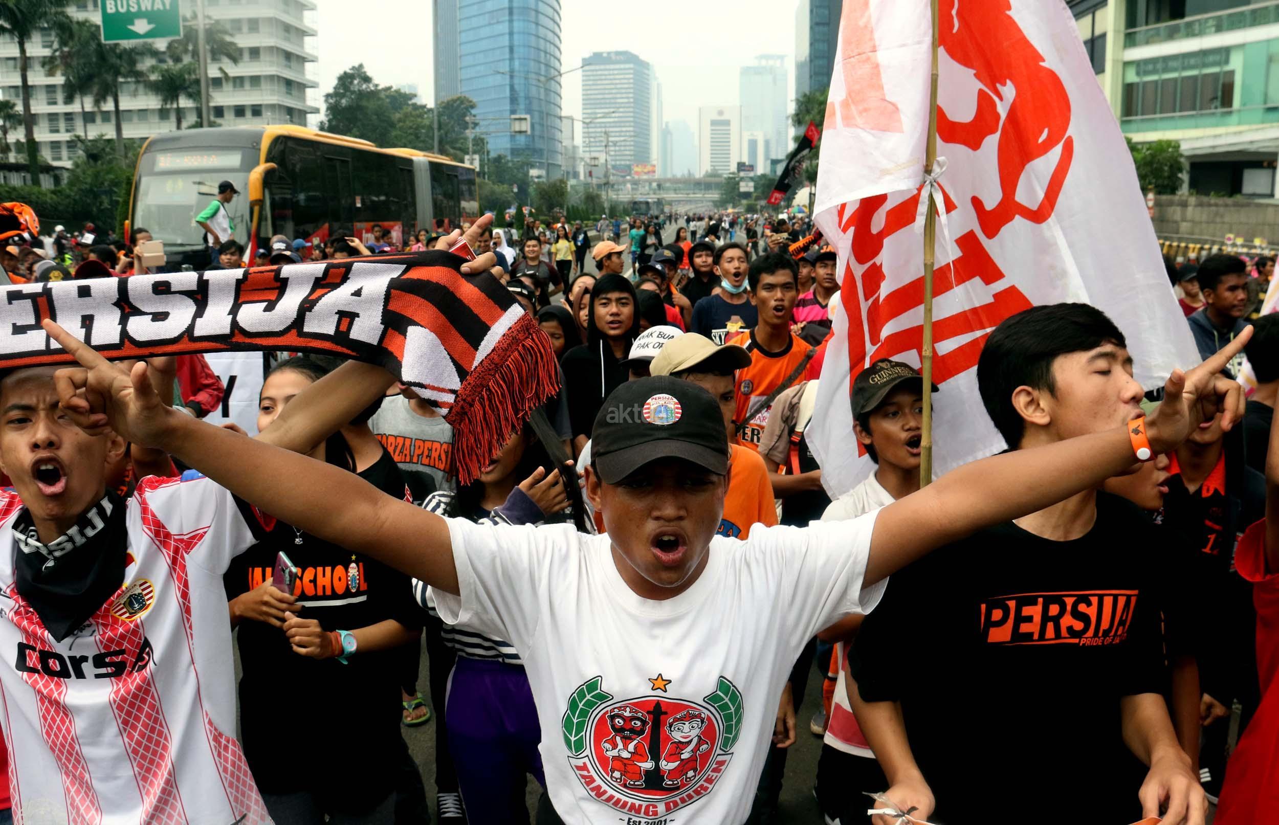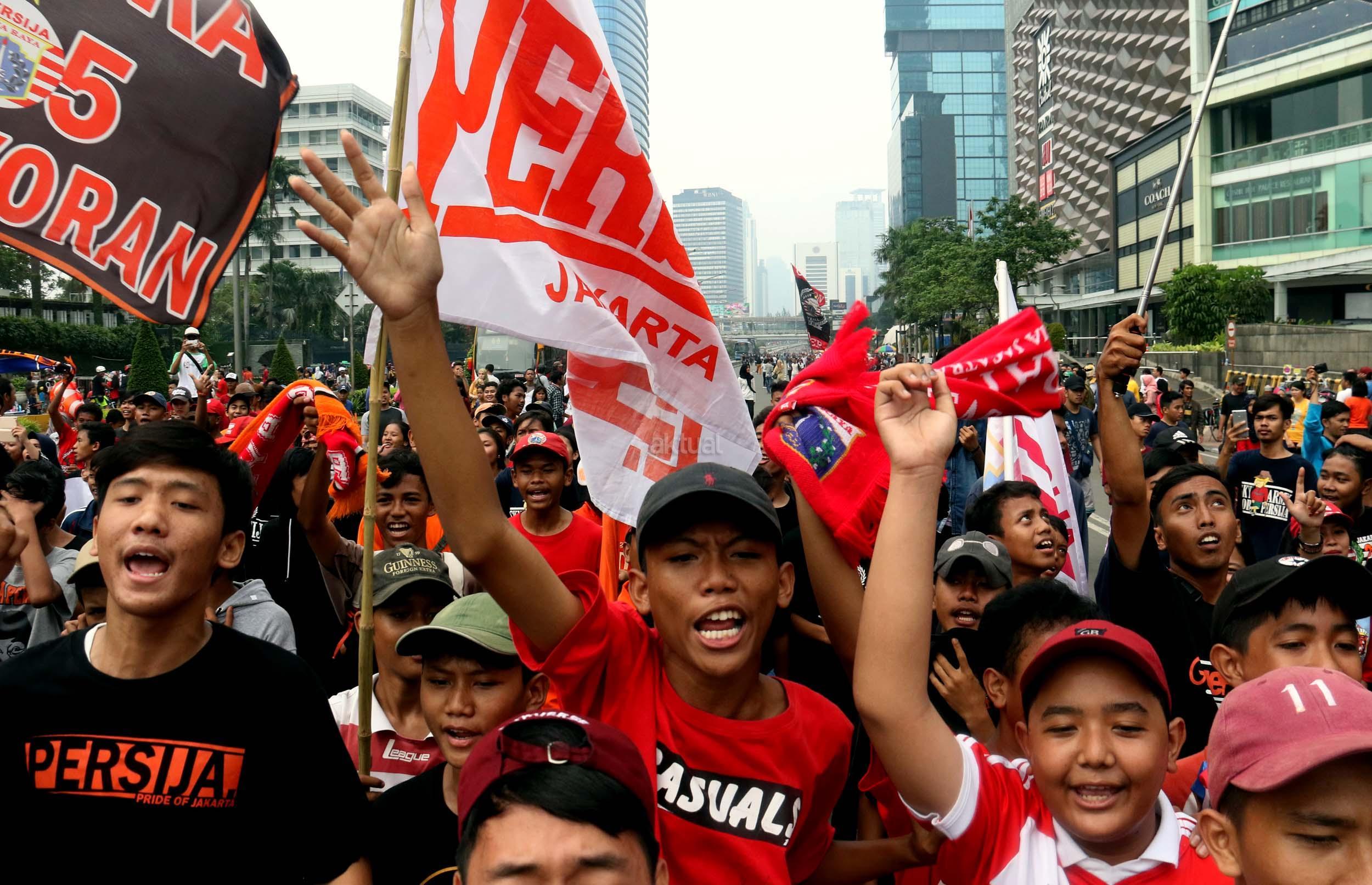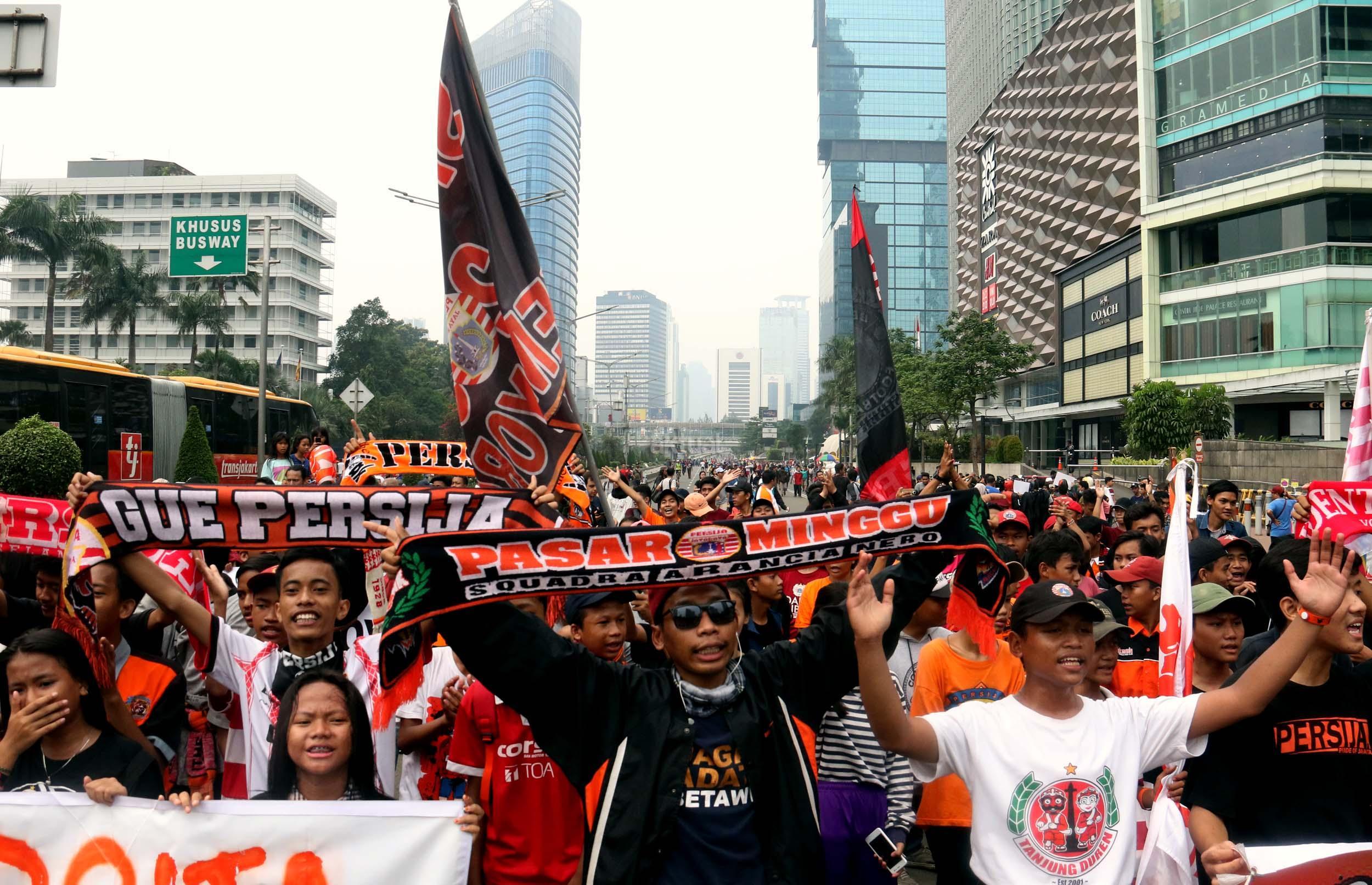 Sejumlah supporter Persija Jakarta The Jak menggelar aksi dukungan kepada klub kesayangannya di Jakarta, Minggu (16/4/2017). Mereka berharap Persija dapat menjuarai Liga 1 musim 2017. AKTUAL/Munzir