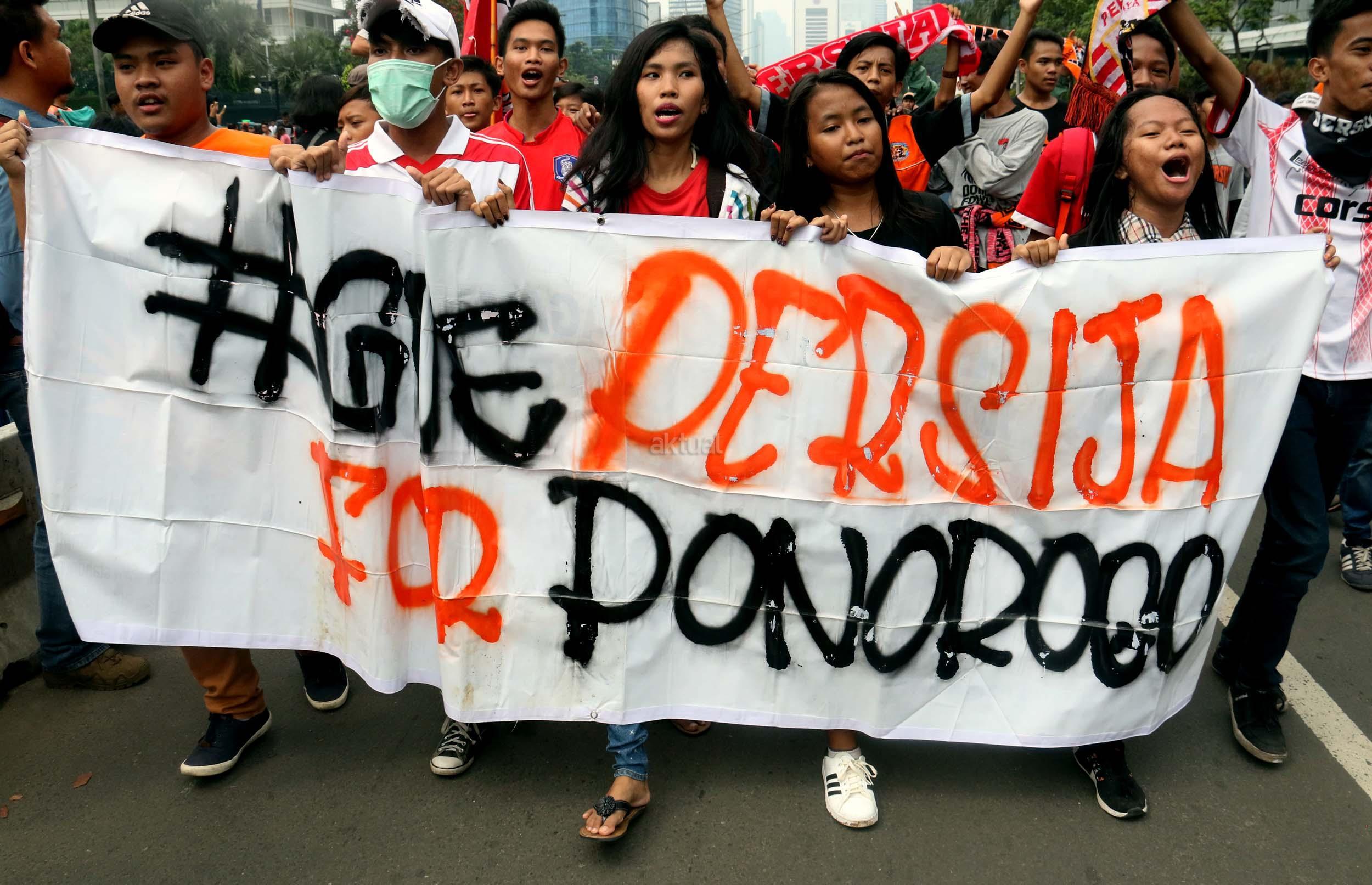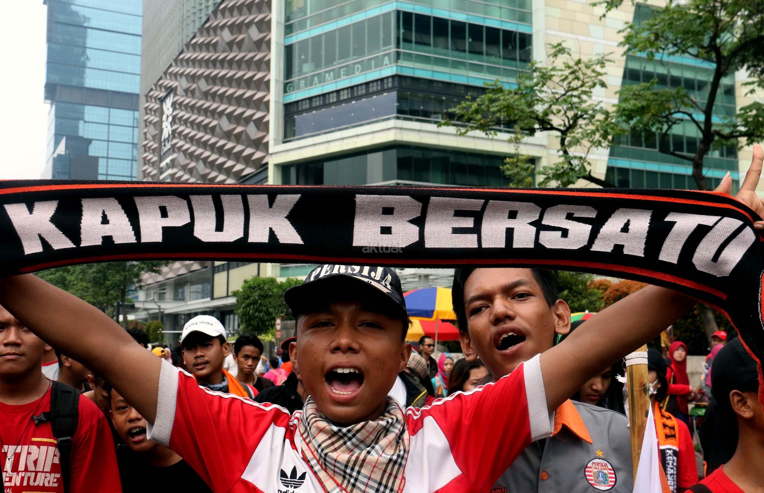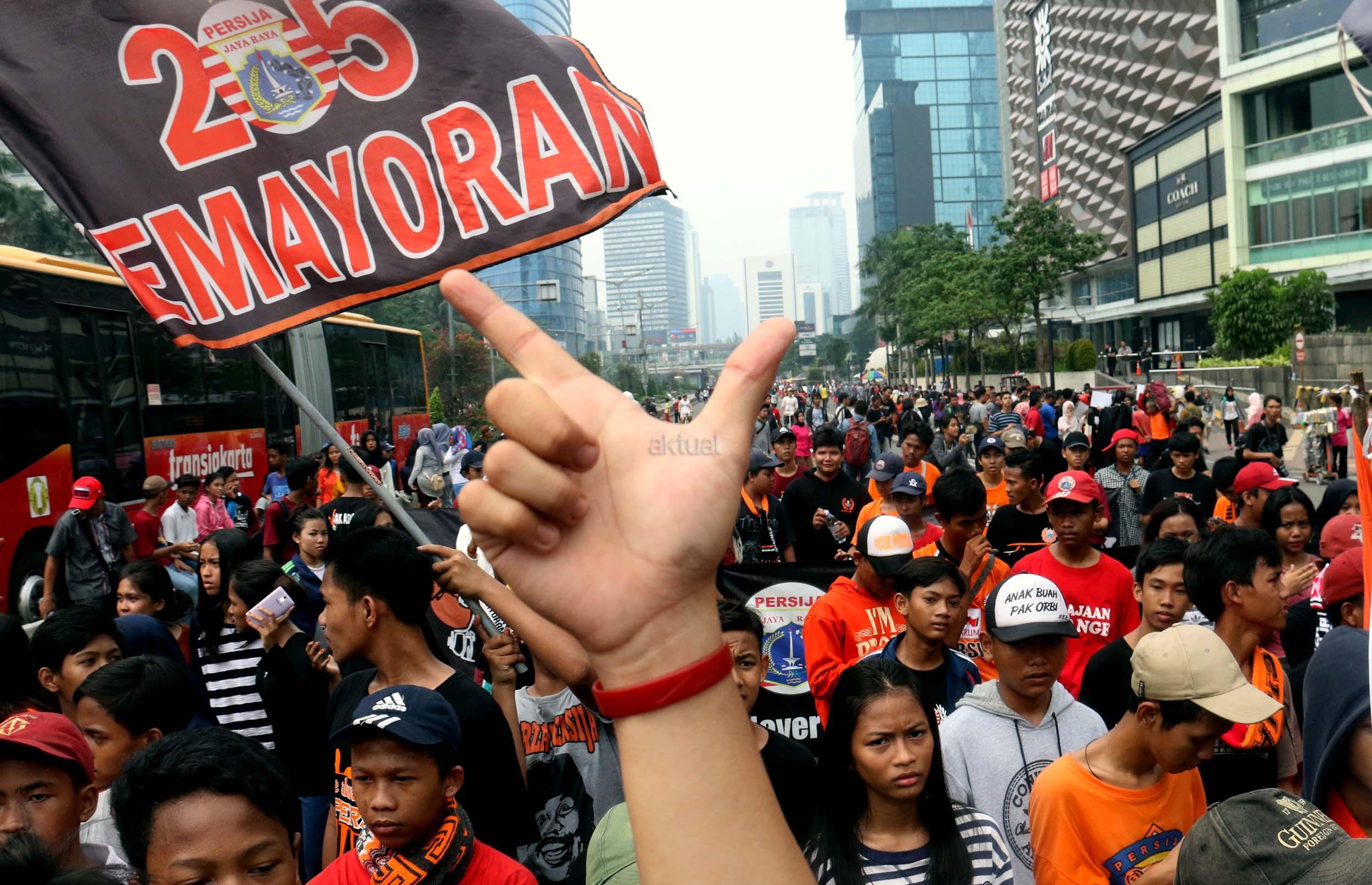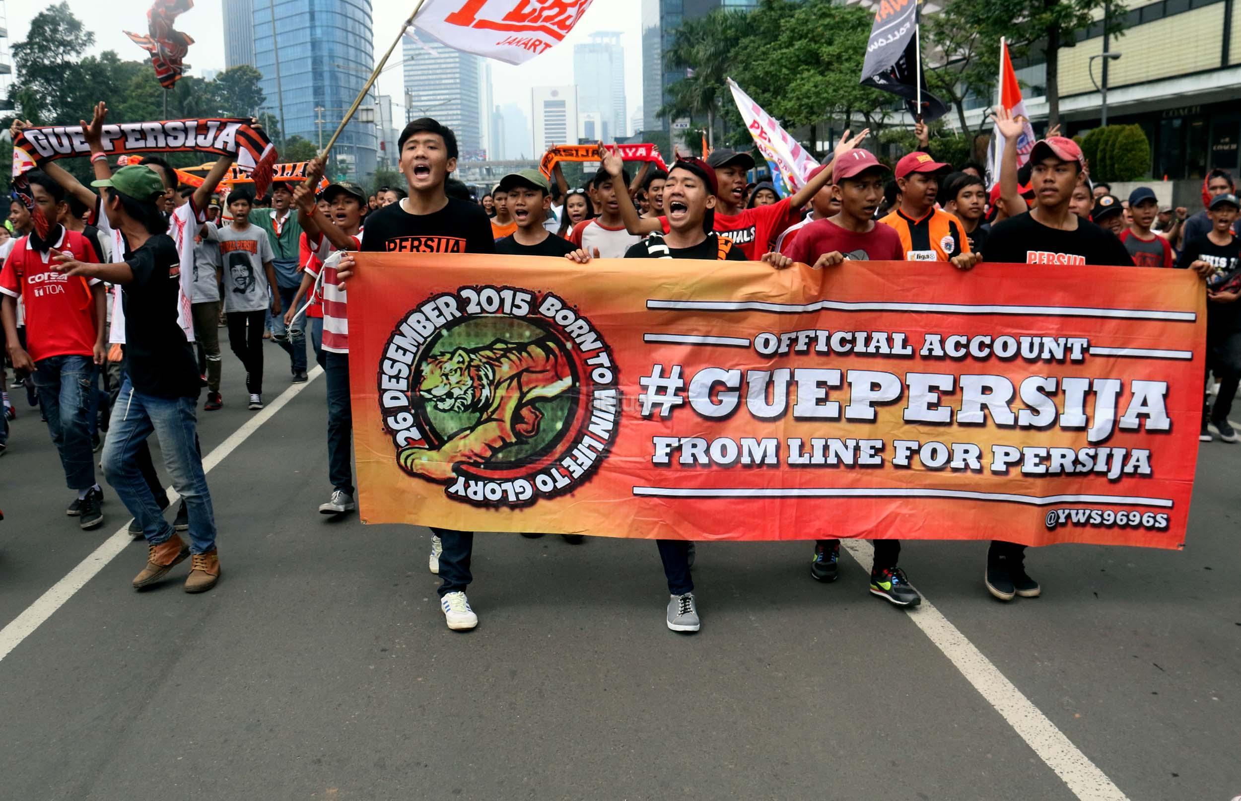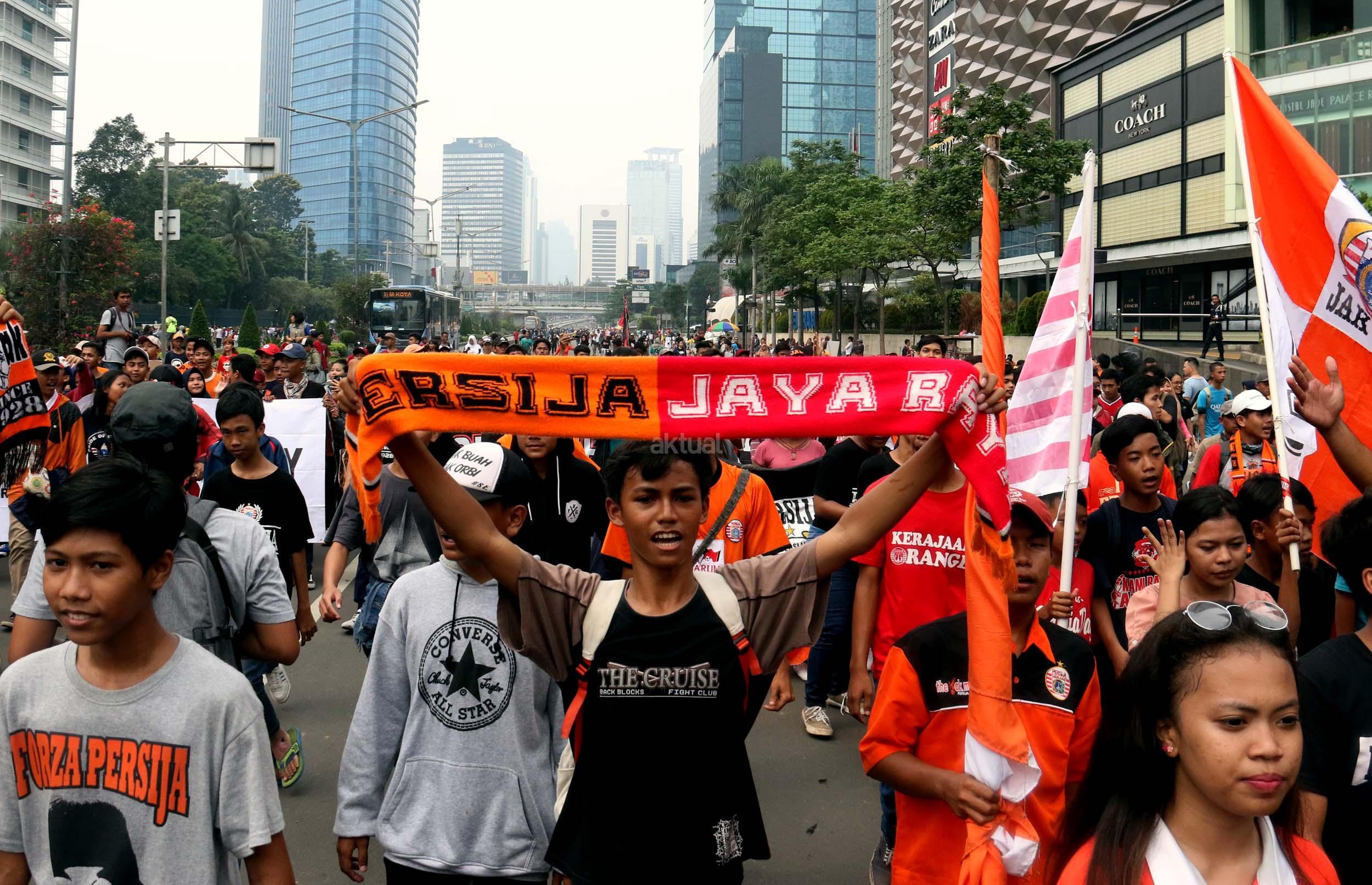 Sejumlah supporter Persija Jakarta The Jak menggelar aksi dukungan kepada klub kesayangannya di Jakarta, Minggu (16/4/2017). Mereka berharap Persija dapat menjuarai Liga 1 musim 2017. AKTUAL/Munzir
