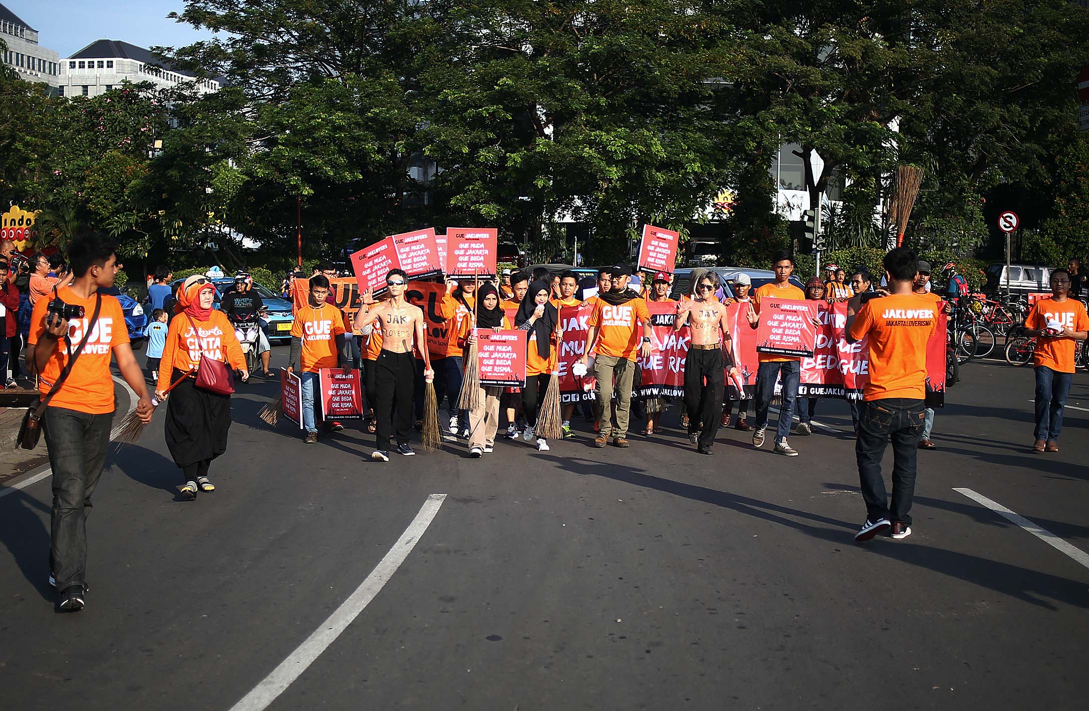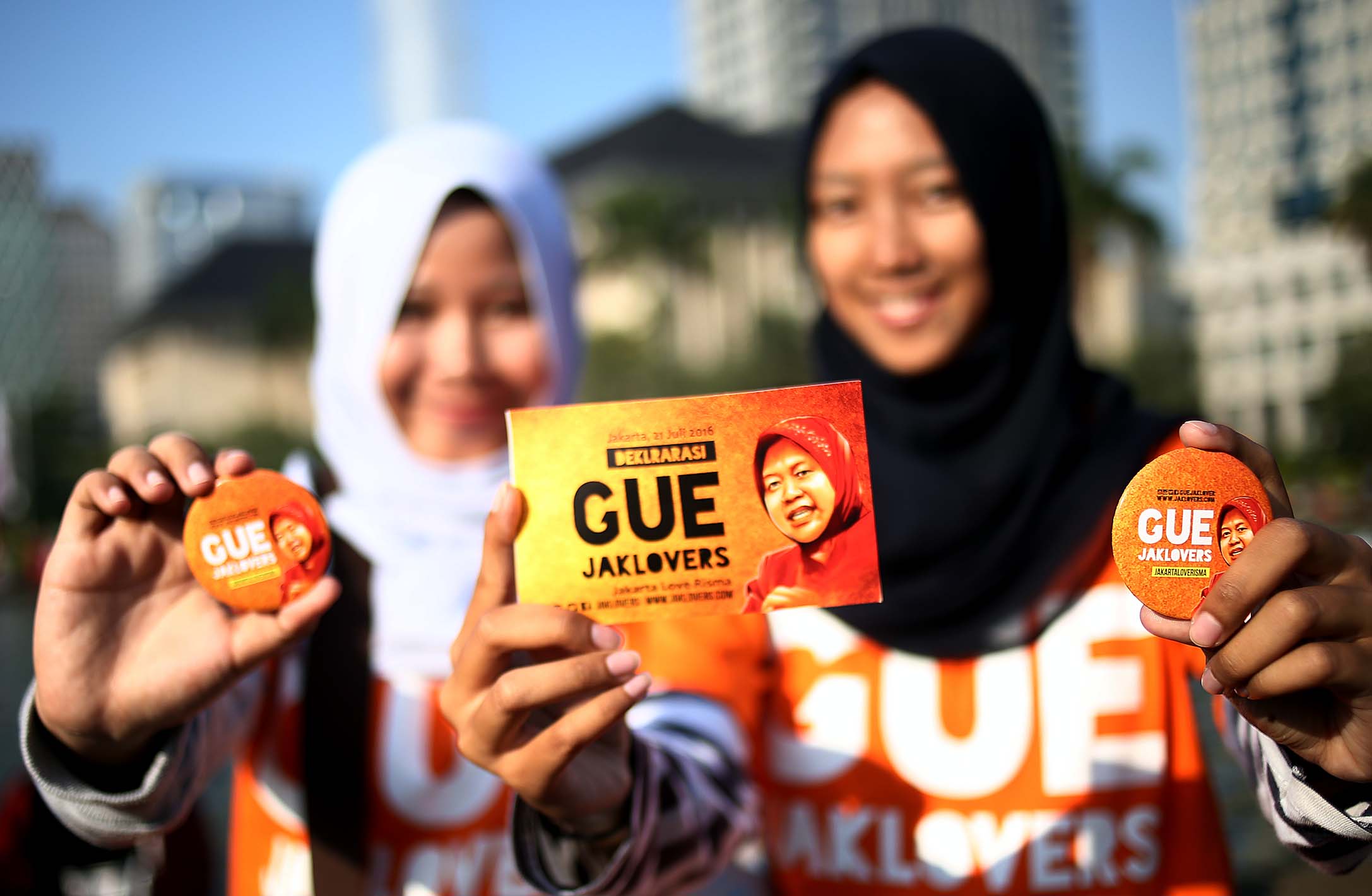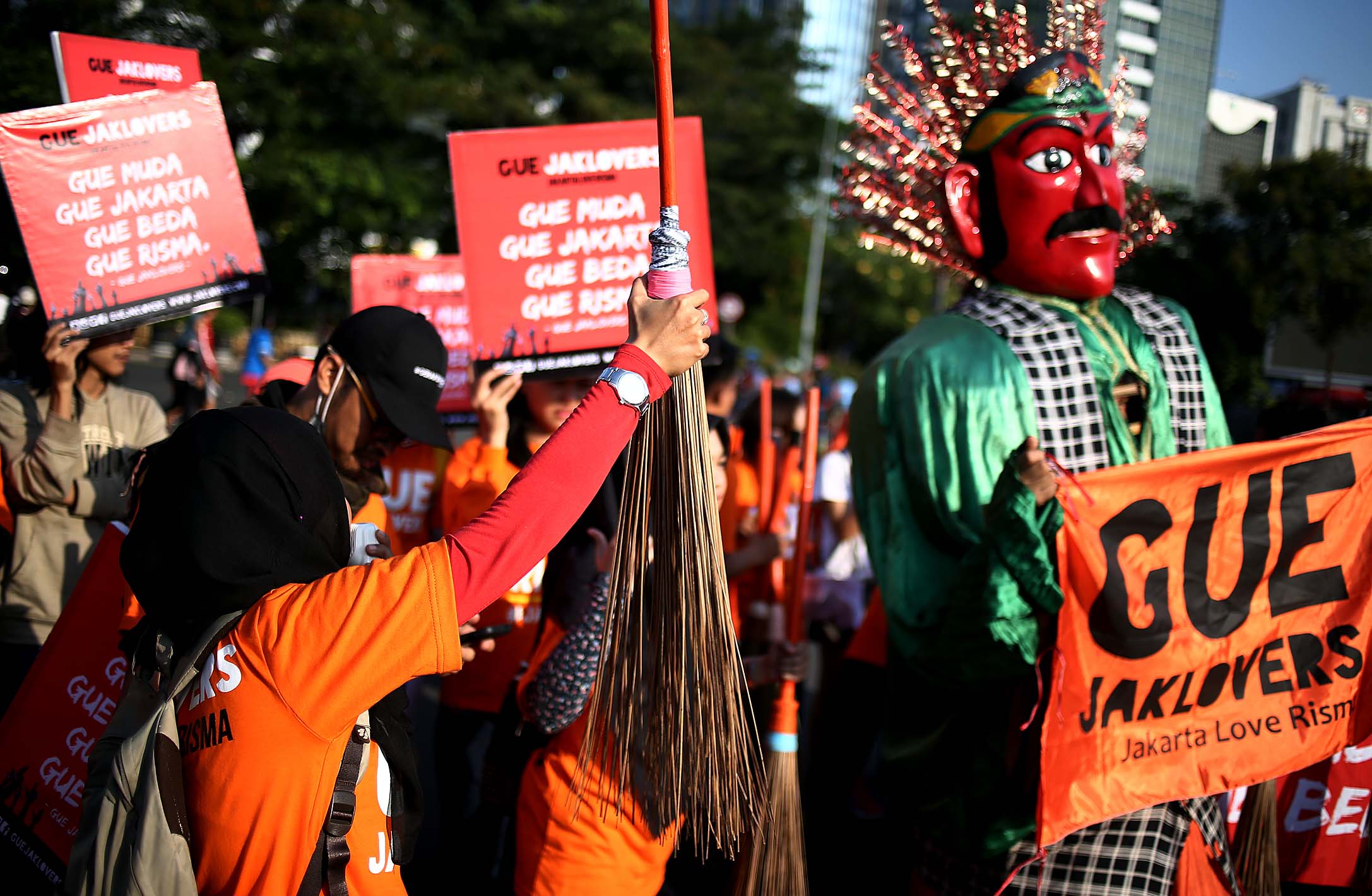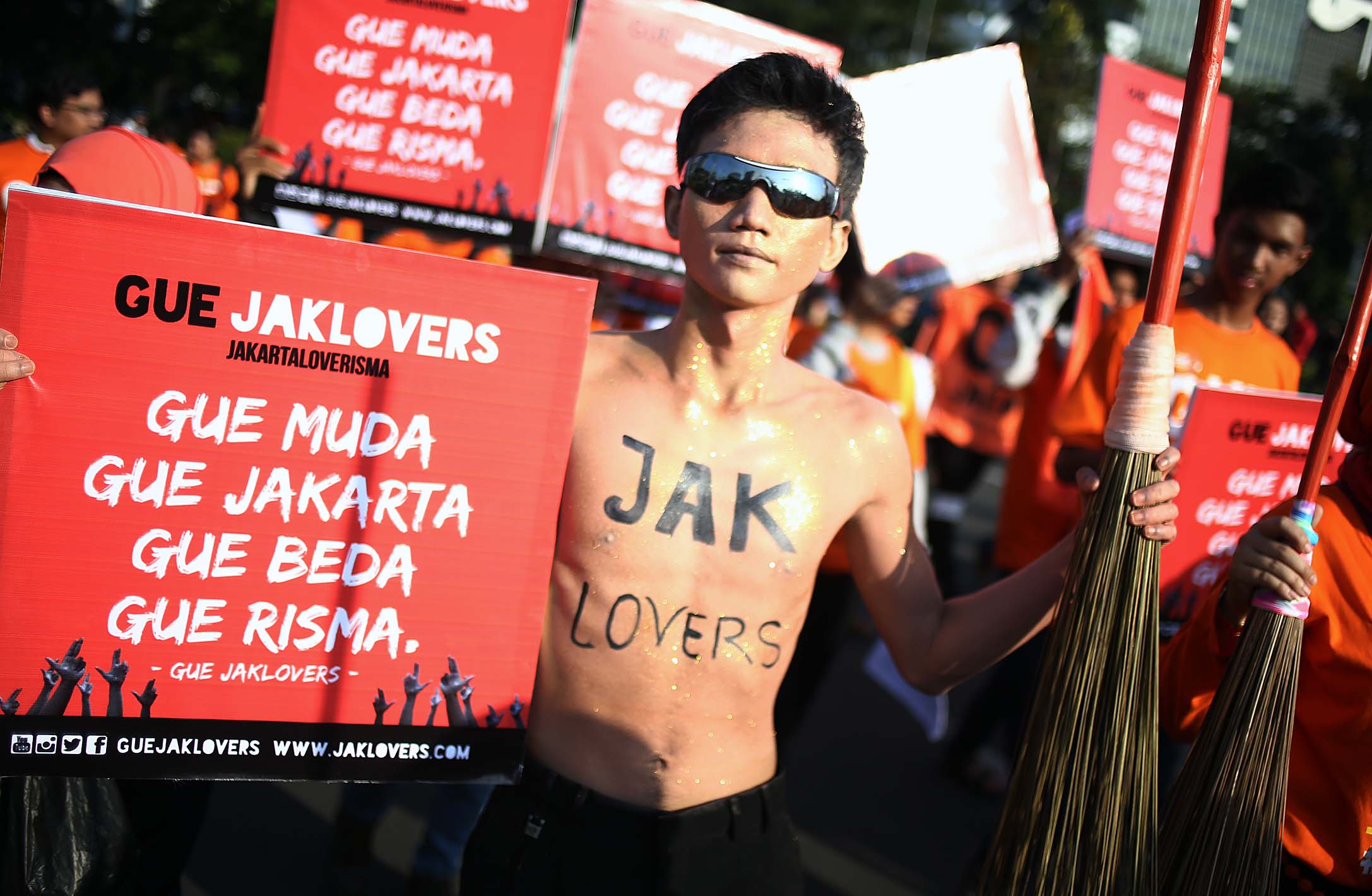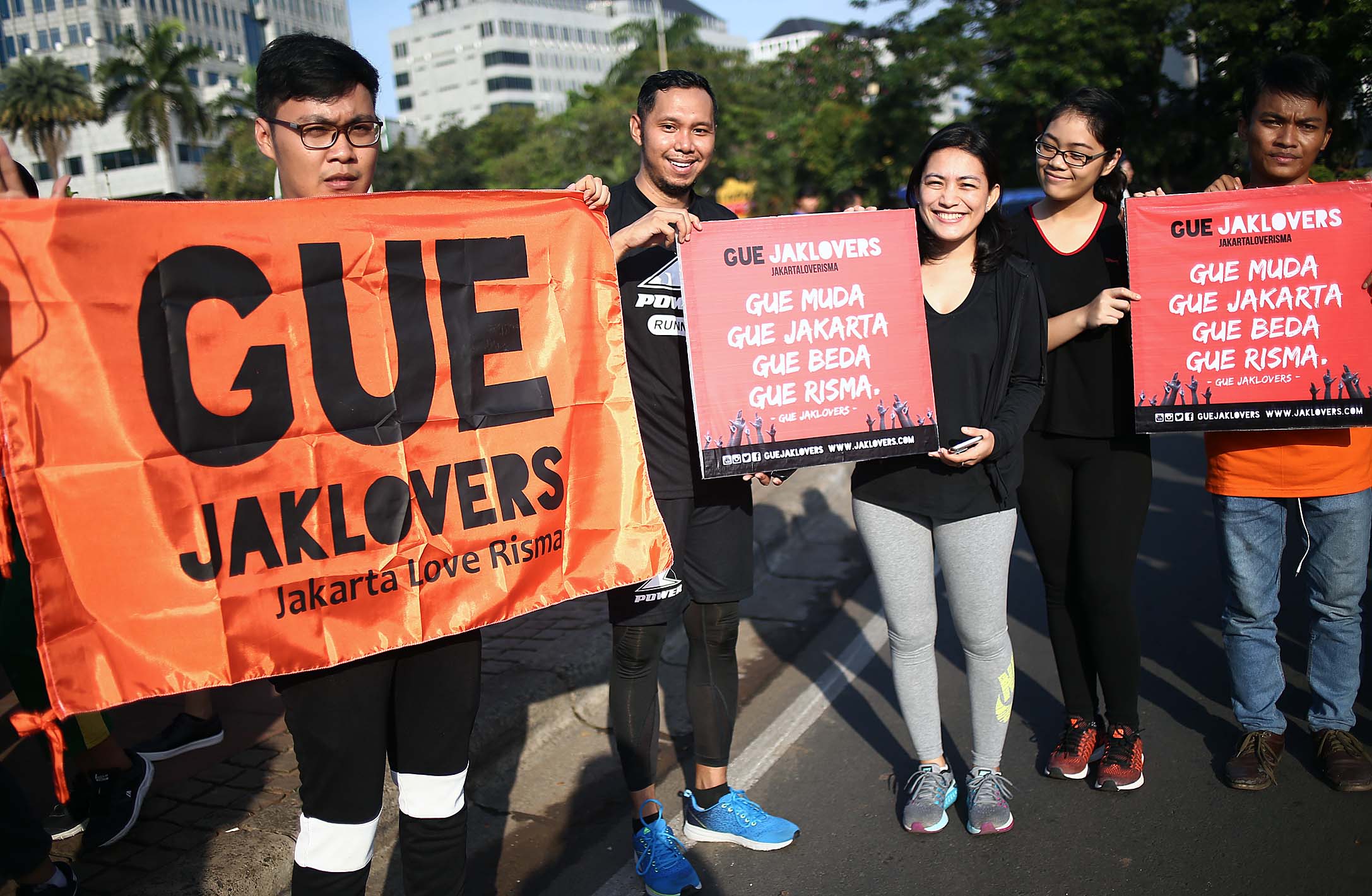 Ratusan anak muda yang tergabung dalam Jaklovers melakukan aksi simpatik mendukung Wali Kota Surabaya Tri Rismaharini maju sebagai calon gubernur (cagub) pada Pilkada DKI 2017, di Bundaran Patung Kuda, Jakarta , Minggu (31/7/2016). Para Jaklovers aksinya sambil membawa simbol sapu lidi.