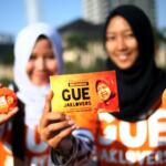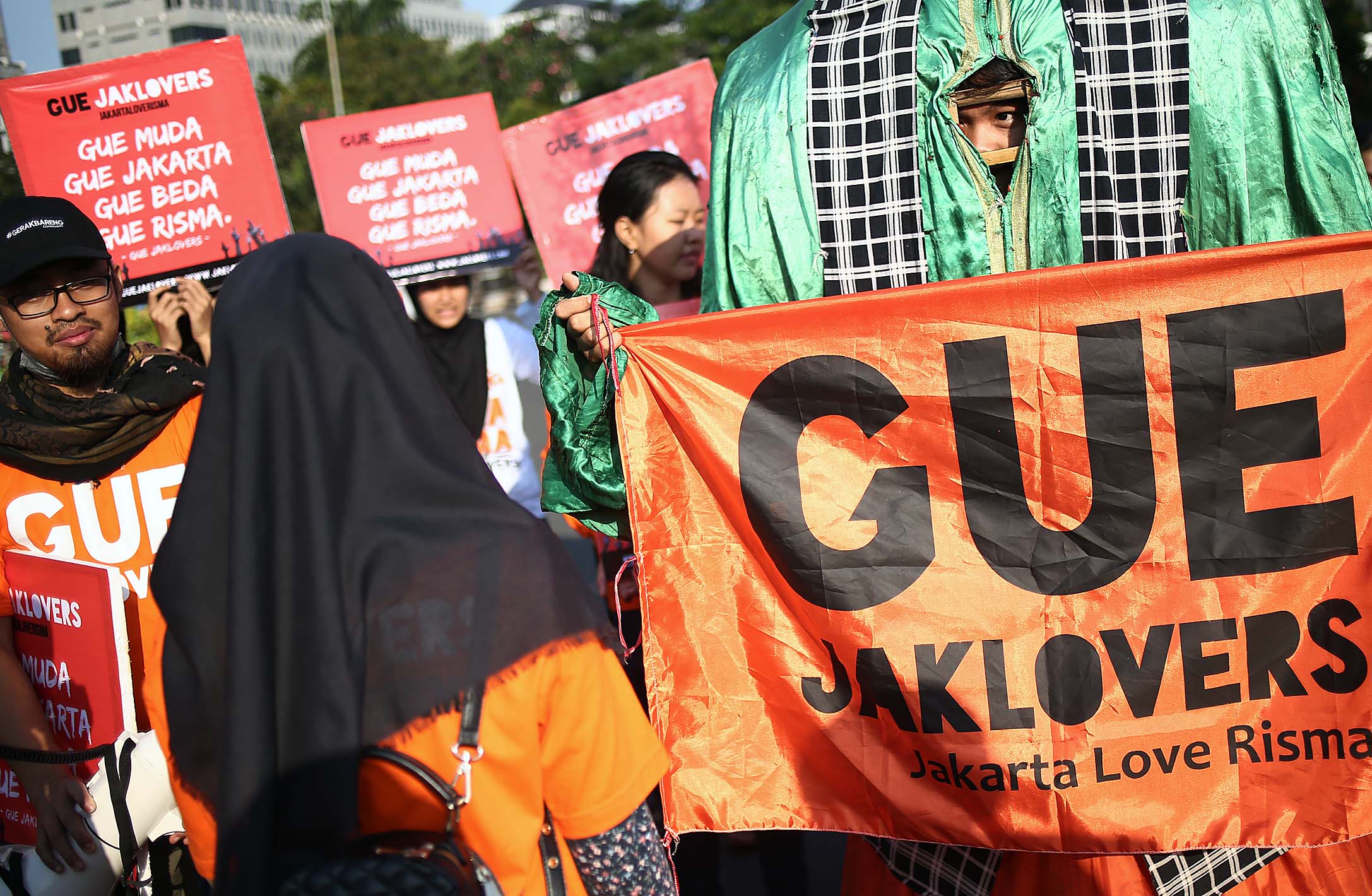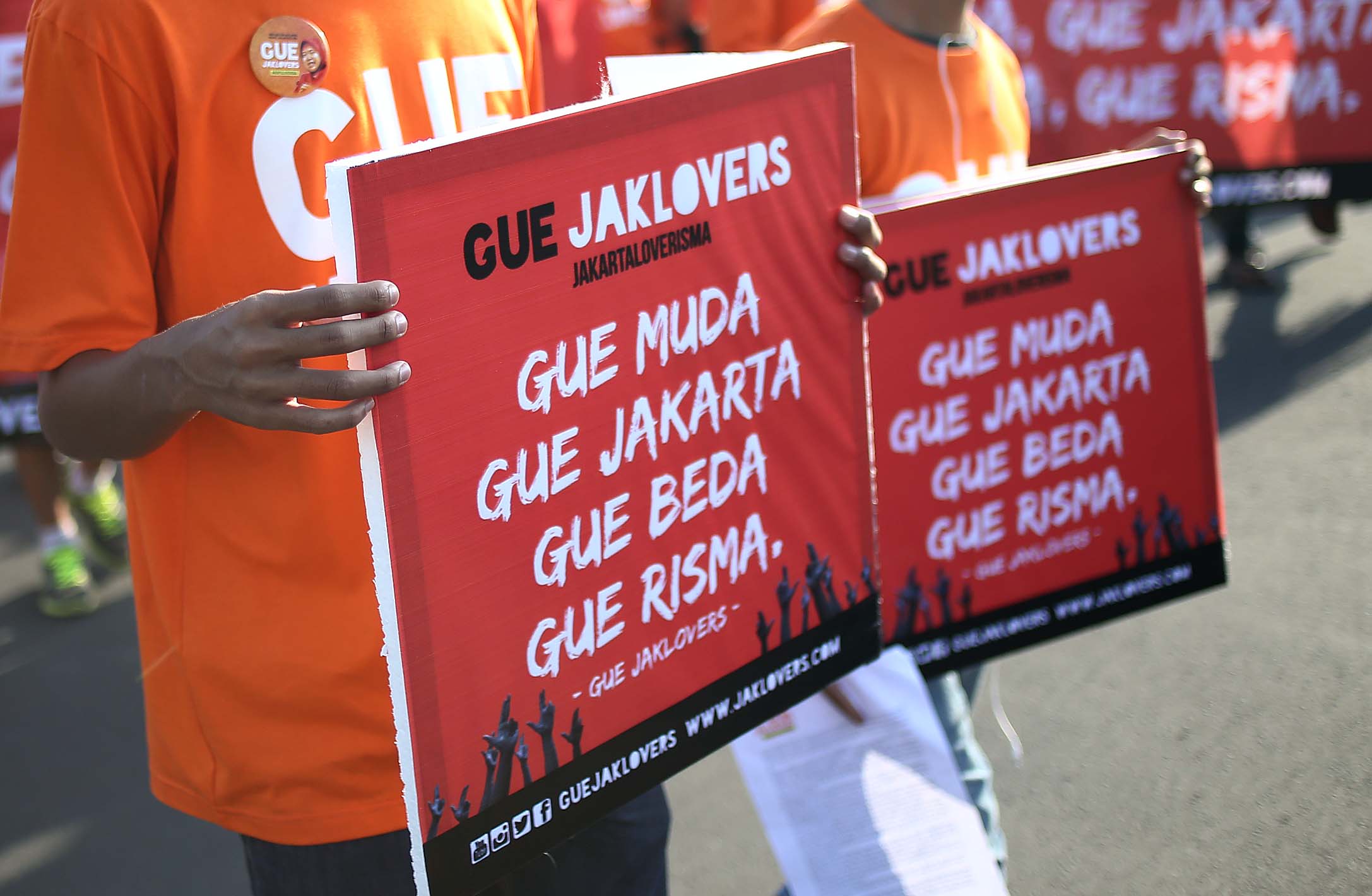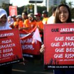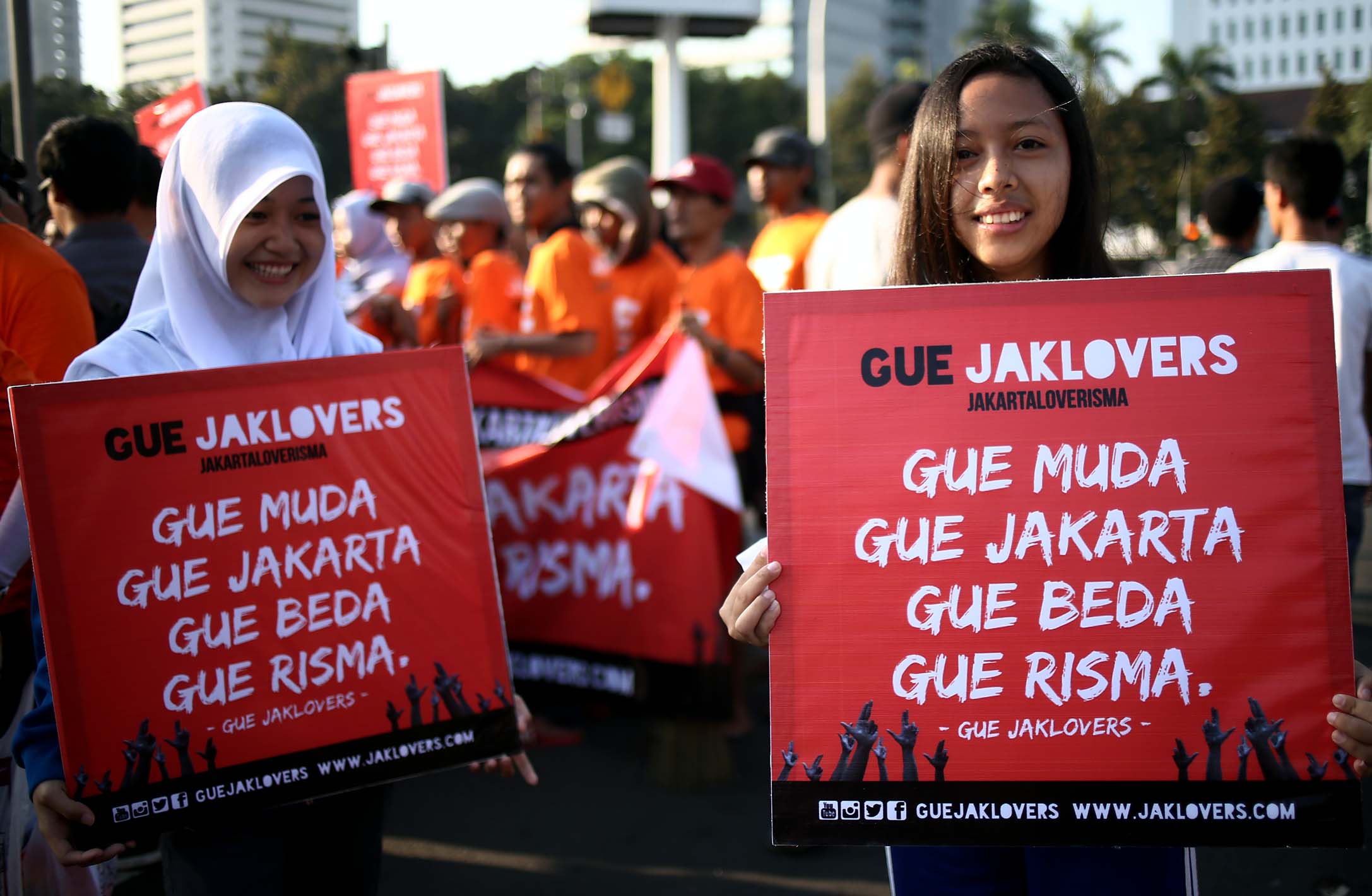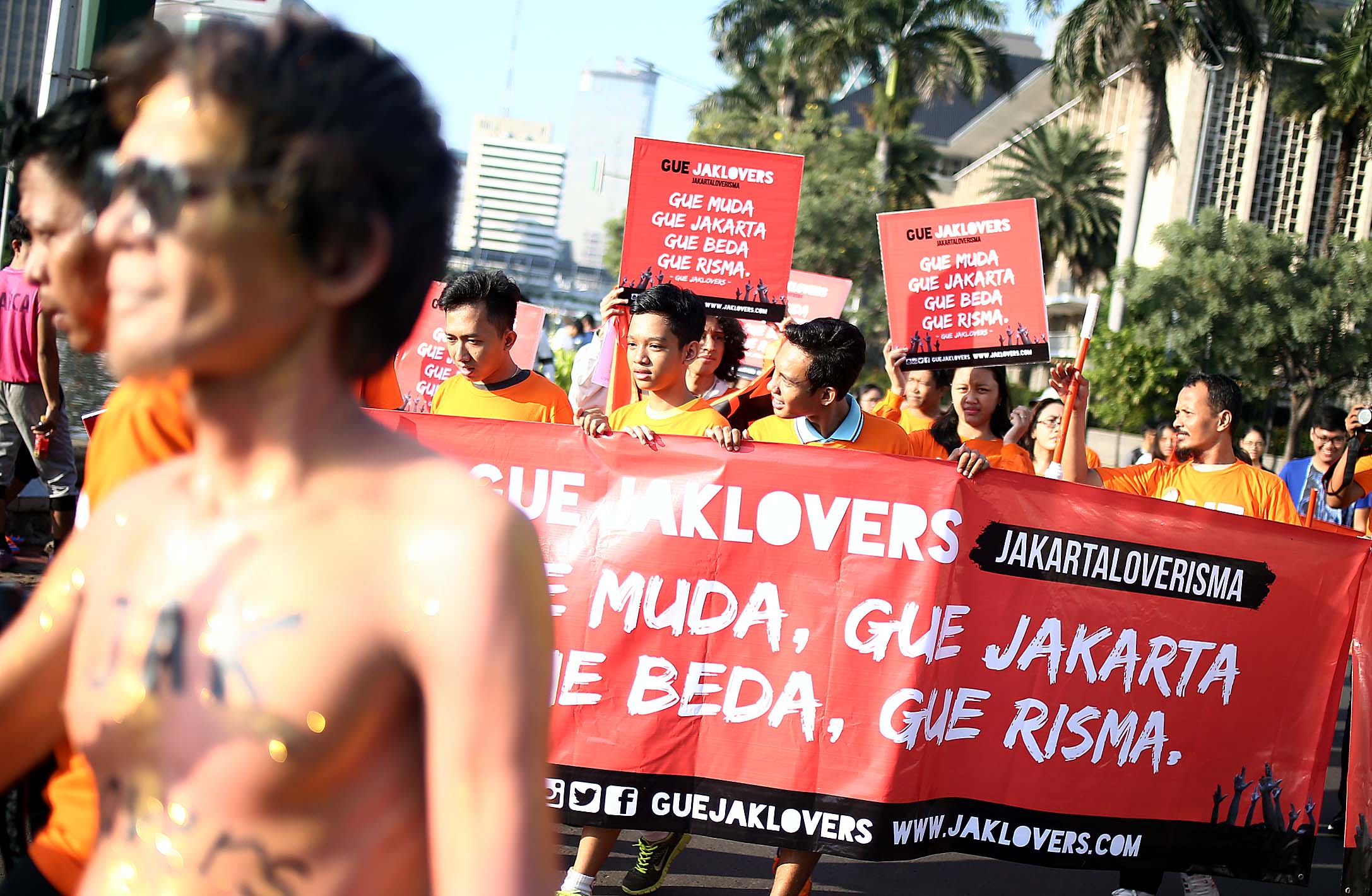 Ratusan anak muda yang tergabung dalam Jaklovers melakukan aksi simpatik mendukung Wali Kota Surabaya Tri Rismaharini maju sebagai calon gubernur (cagub) pada Pilkada DKI 2017, di Bundaran Patung Kuda, Jakarta , Minggu (31/7/2016). Para Jaklovers aksinya sambil membawa simbol sapu lidi.