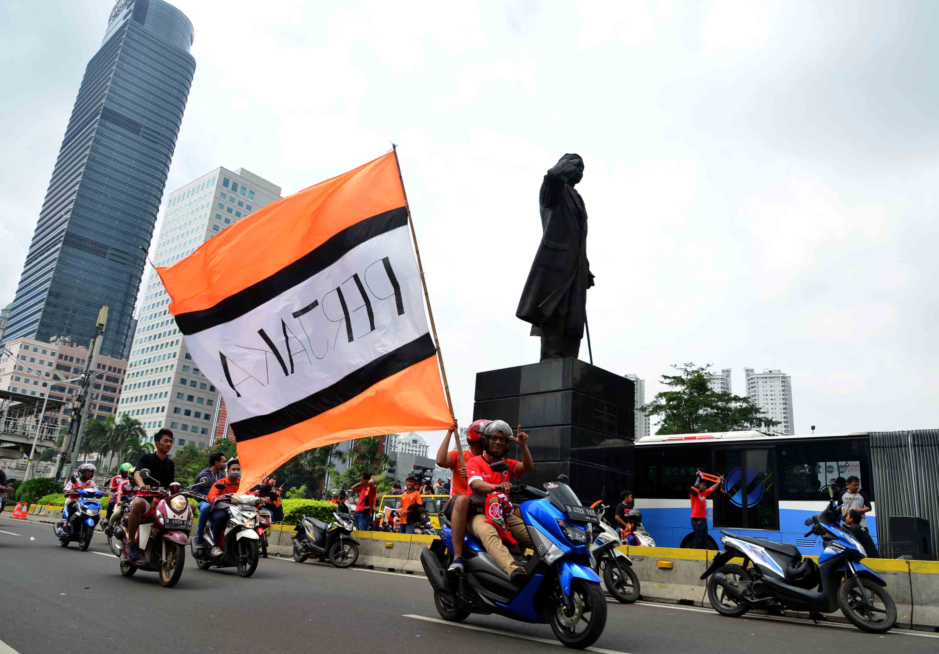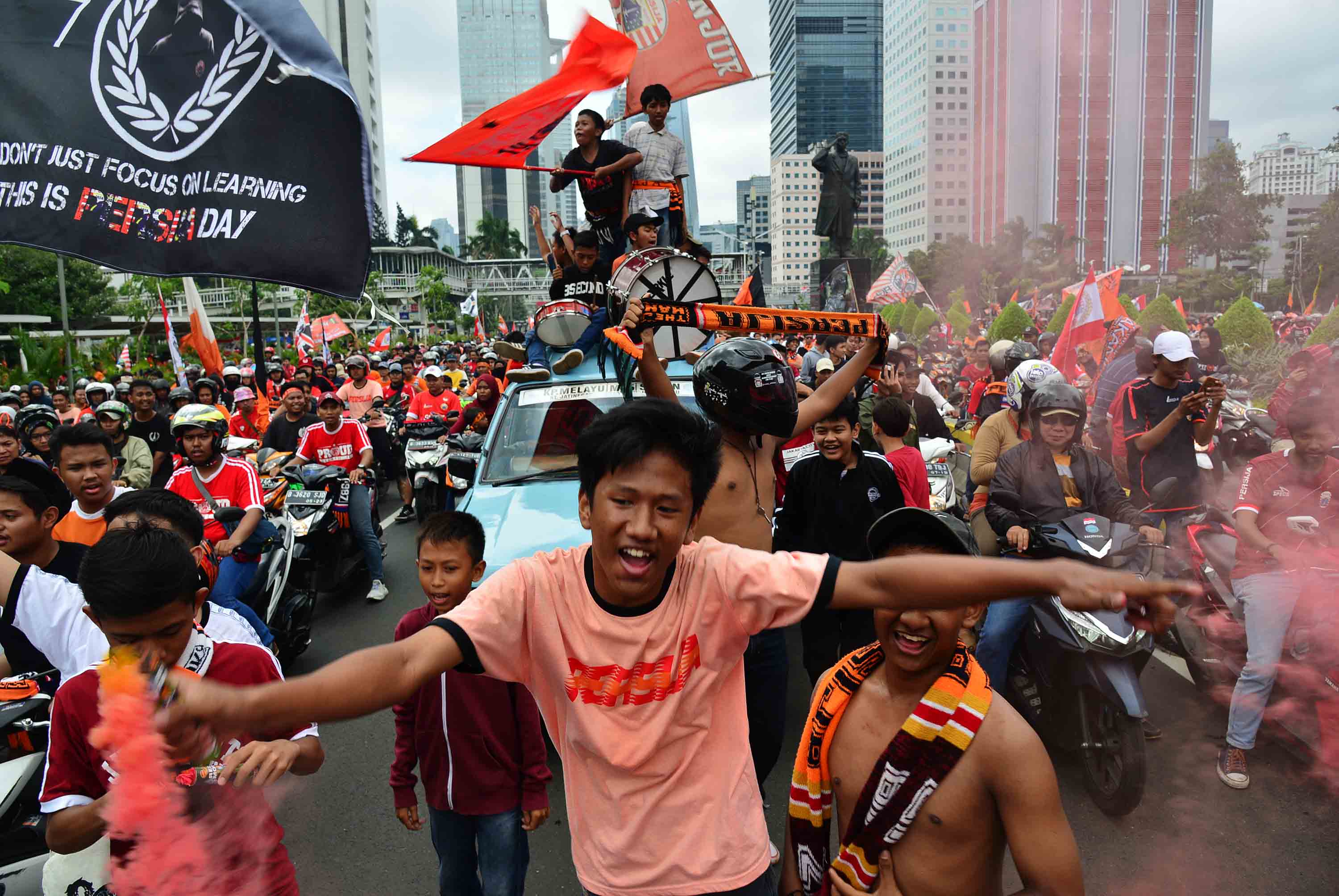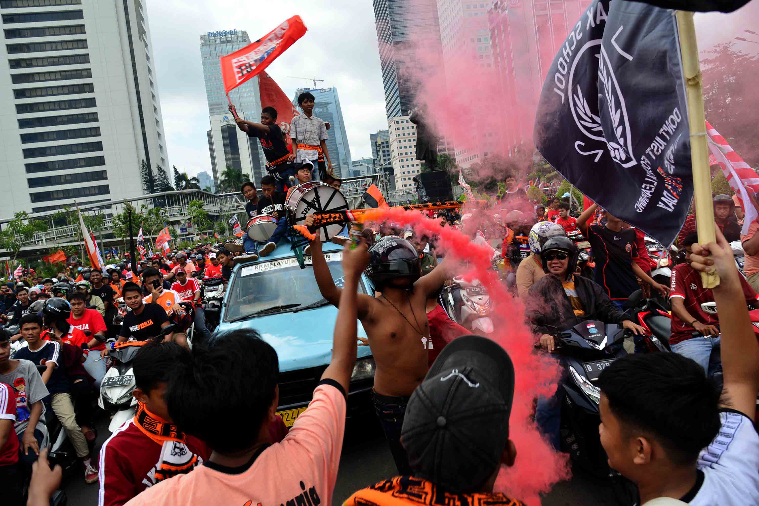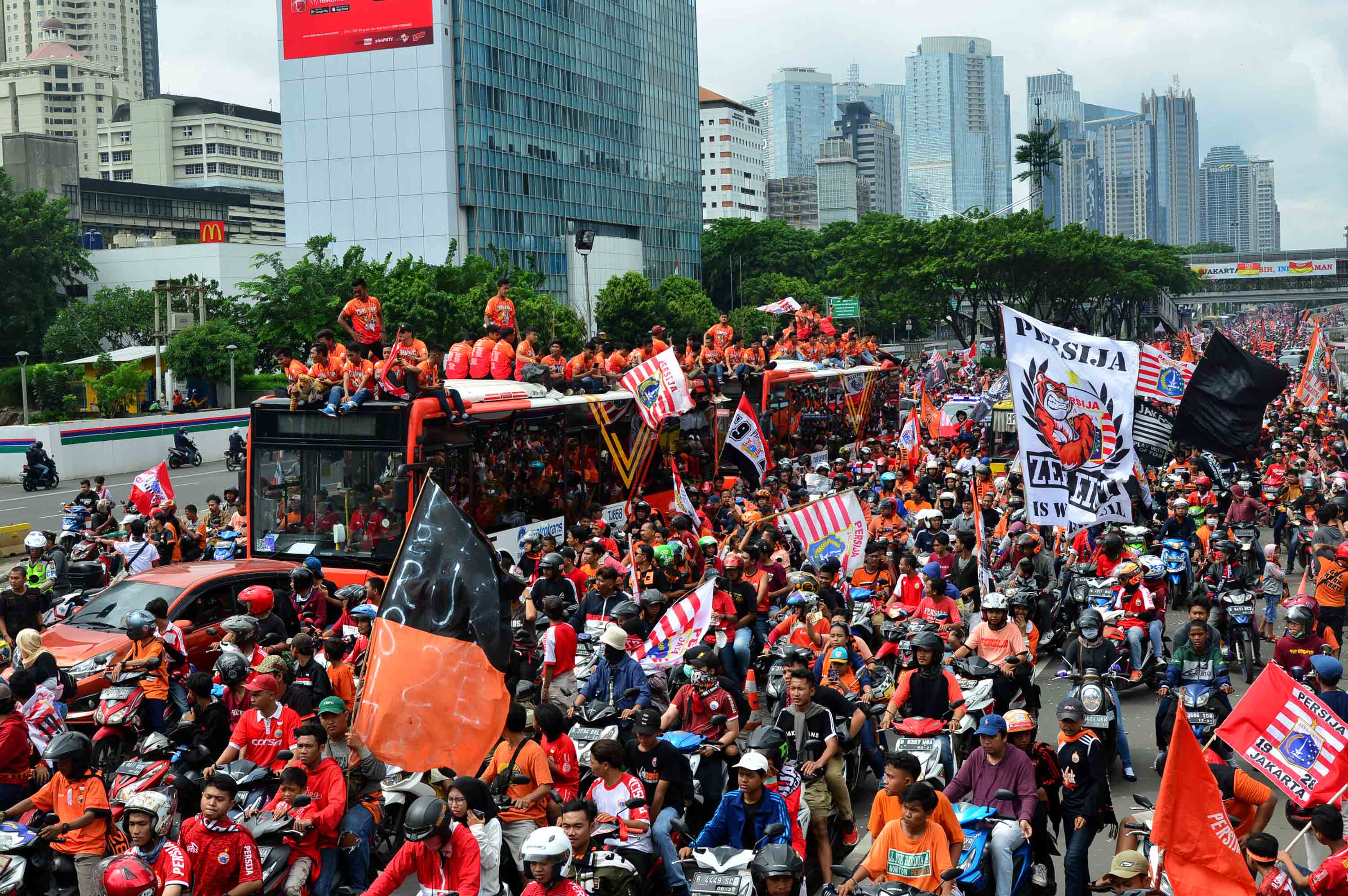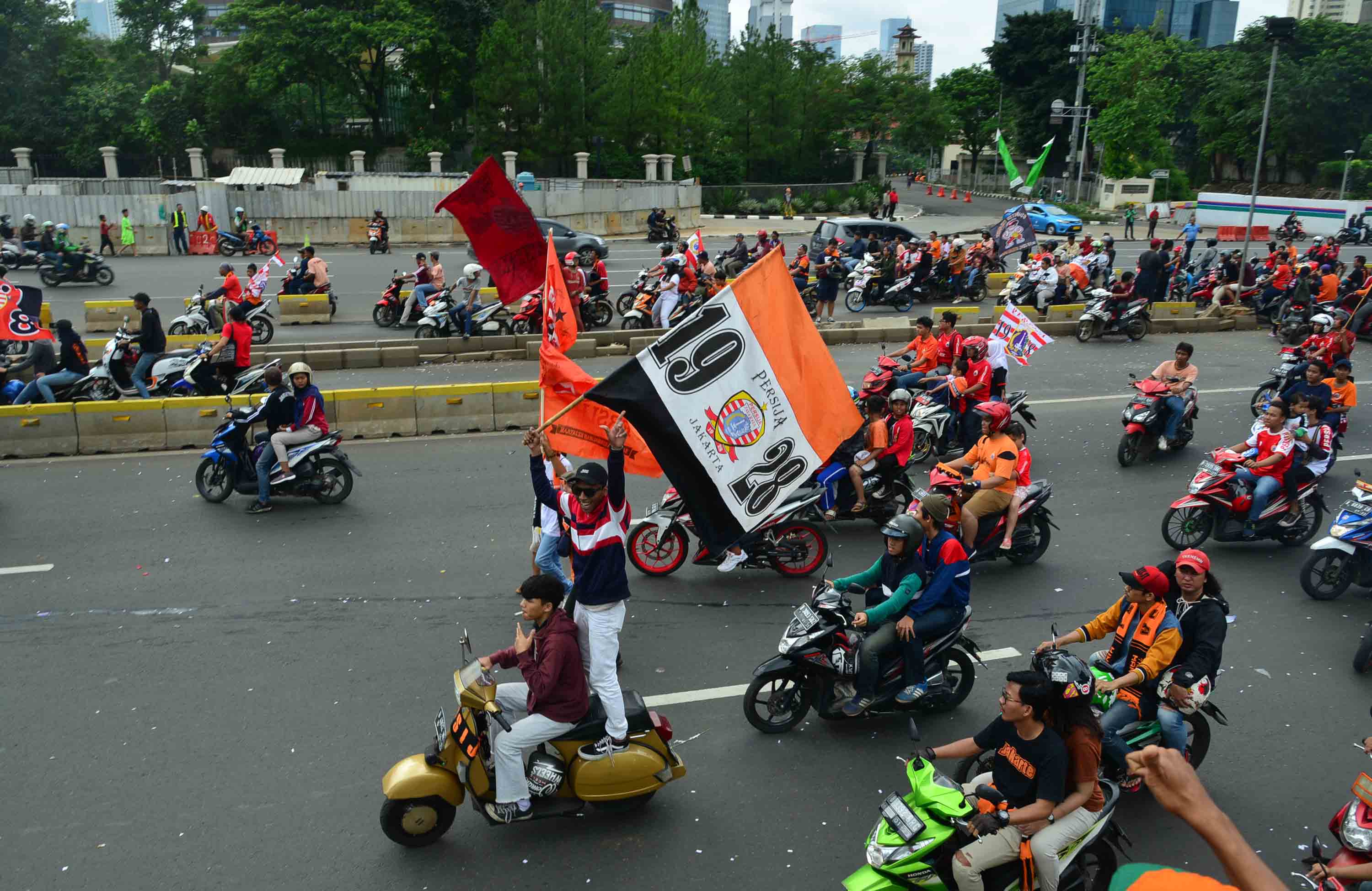 Sejumlah The Jakmania saat melakukan konvoi Persija jakarta Juara Liga 1 2018 di sepanjang jalan Sudirman - Thamrin, Jakarta, Sabtu (15/12).  Kemenangan tim Persija Jakarta saat mengalahkan Mitra Kukar pada Liga 1 2018 beberapa waktu lalu, menjadi momen bersejarah bagi seluruh masyarakat Ibukota karena setelah 17 tahun lamanya Persija tak mengangkat trofi Liga Indonesia. AKTUAL/Tino Oktaviano