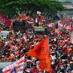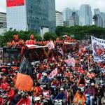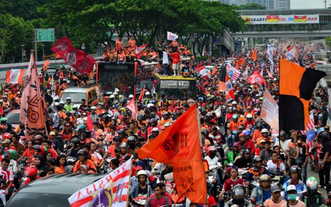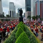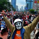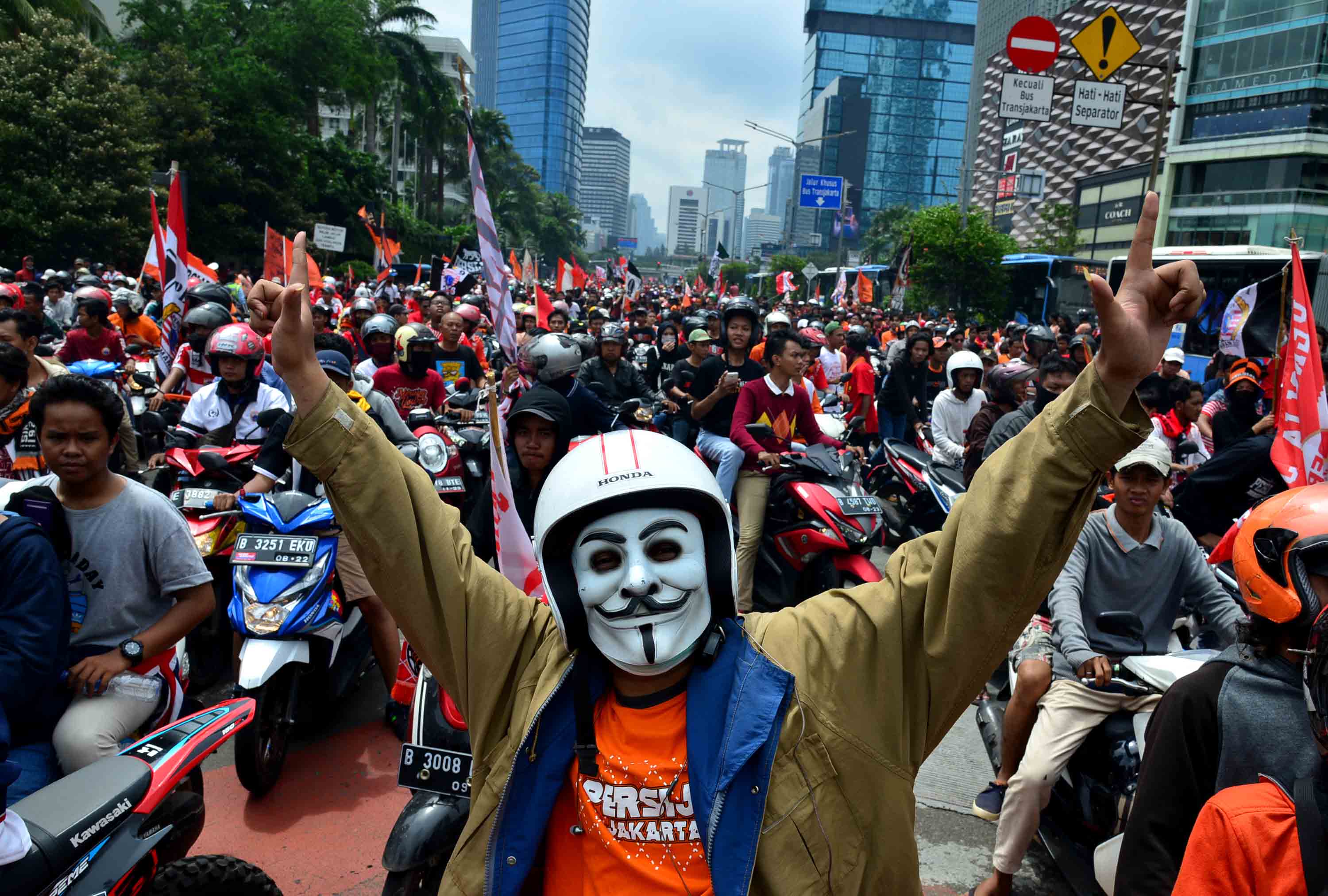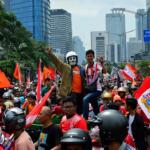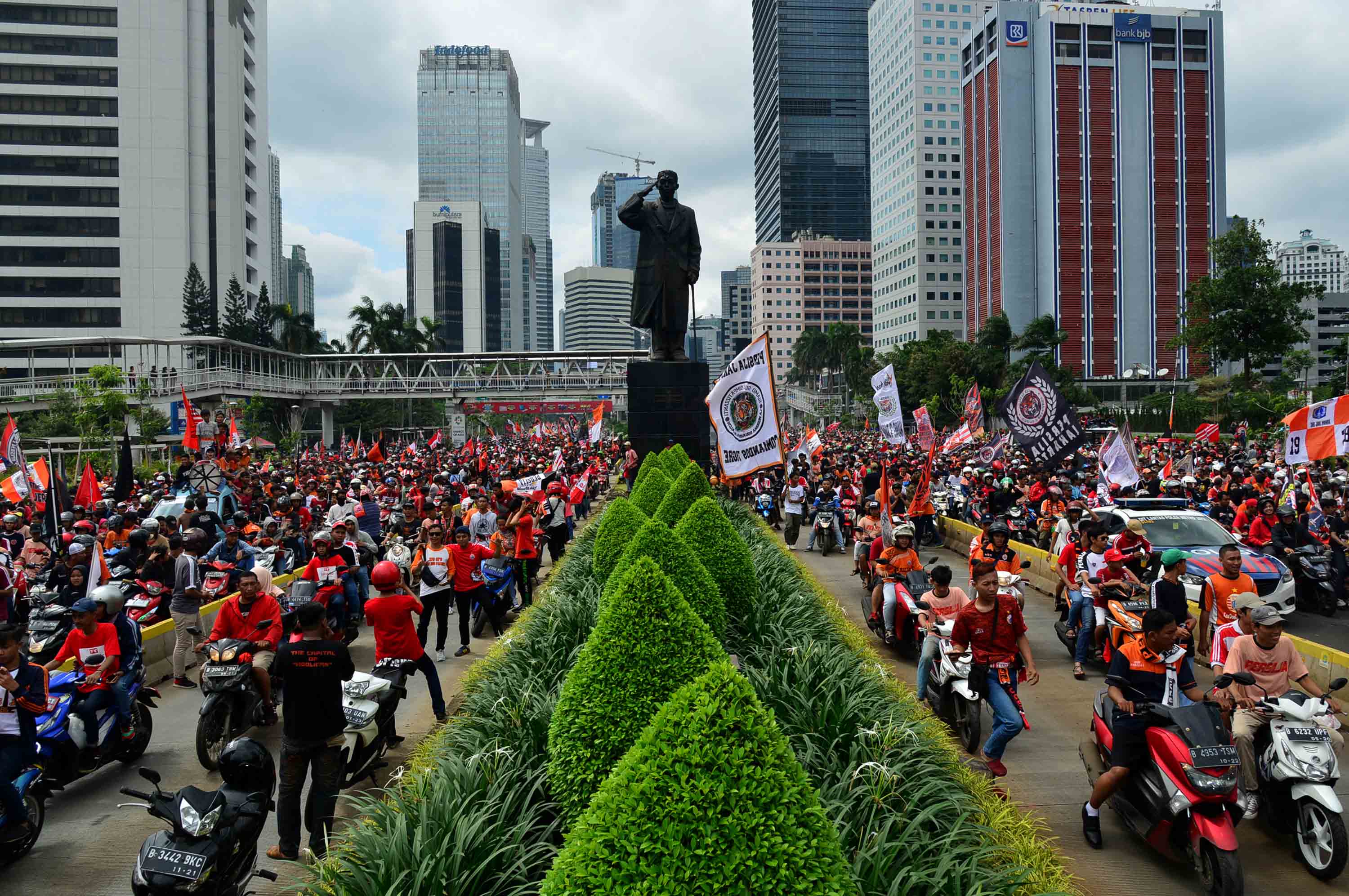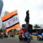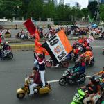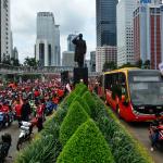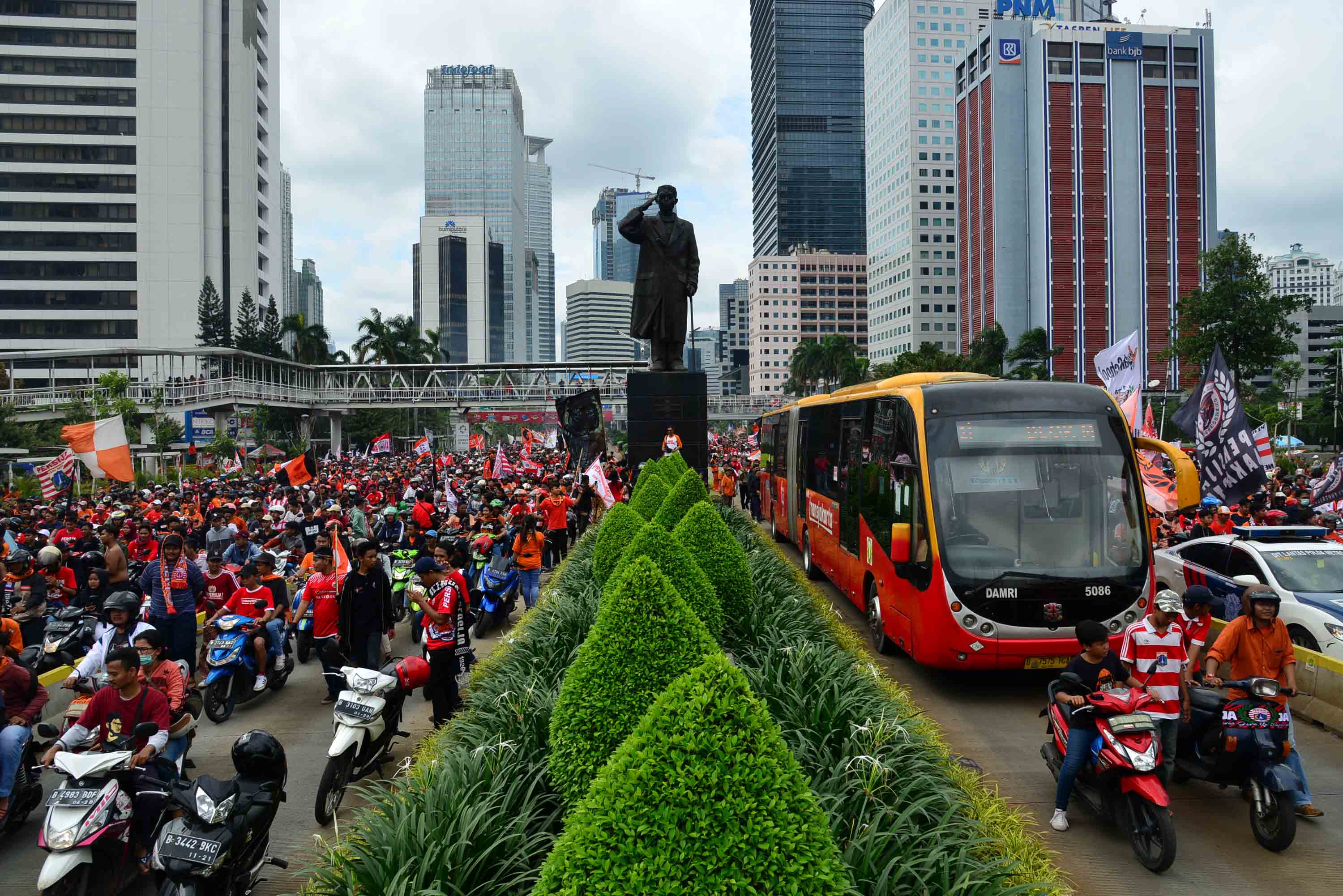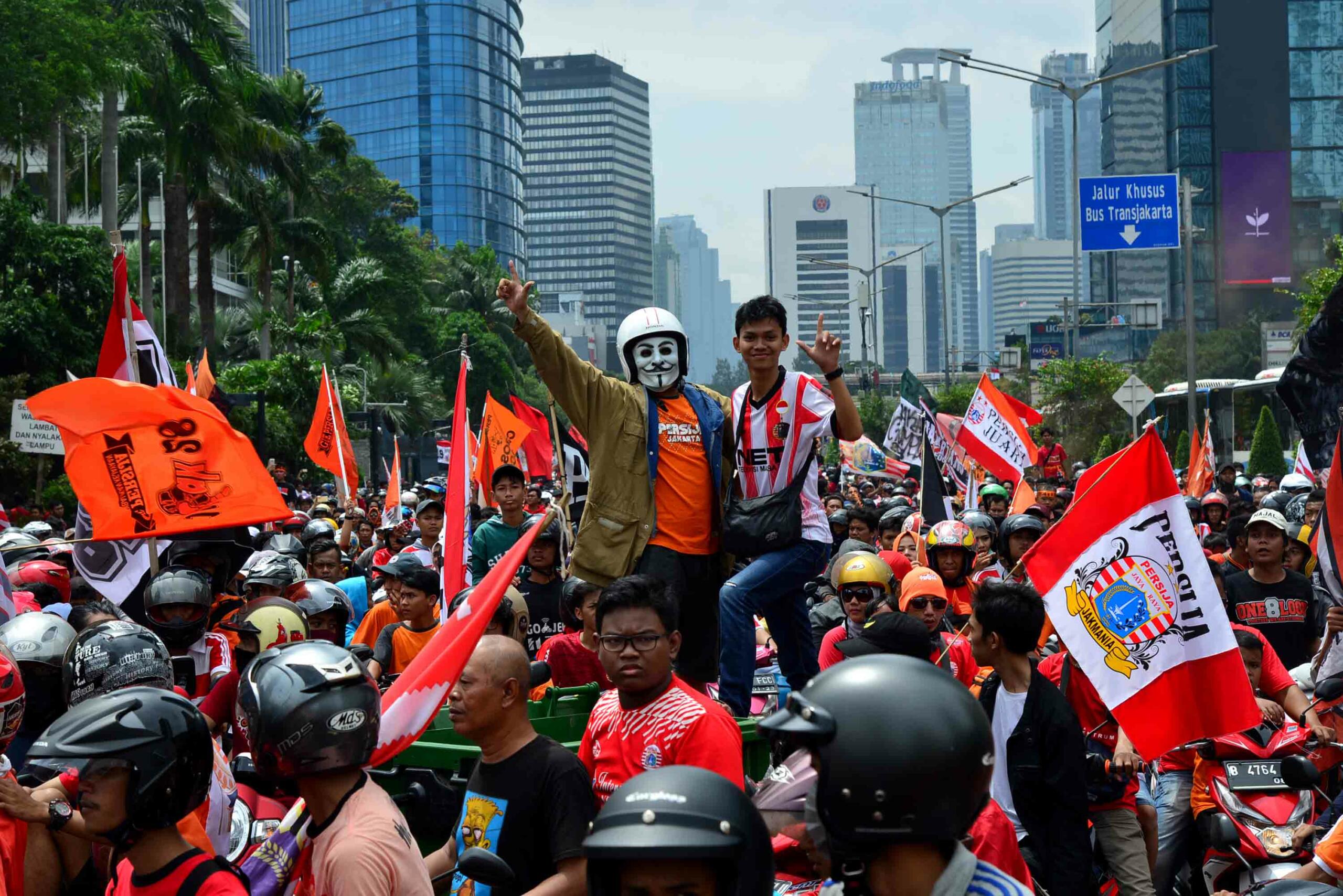 Sejumlah The Jakmania saat melakukan konvoi Persija jakarta Juara Liga 1 2018 di sepanjang jalan Sudirman - Thamrin, Jakarta, Sabtu (15/12).  Kemenangan tim Persija Jakarta saat mengalahkan Mitra Kukar pada Liga 1 2018 beberapa waktu lalu, menjadi momen bersejarah bagi seluruh masyarakat Ibukota karena setelah 17 tahun lamanya Persija tak mengangkat trofi Liga Indonesia. AKTUAL/Tino Oktaviano