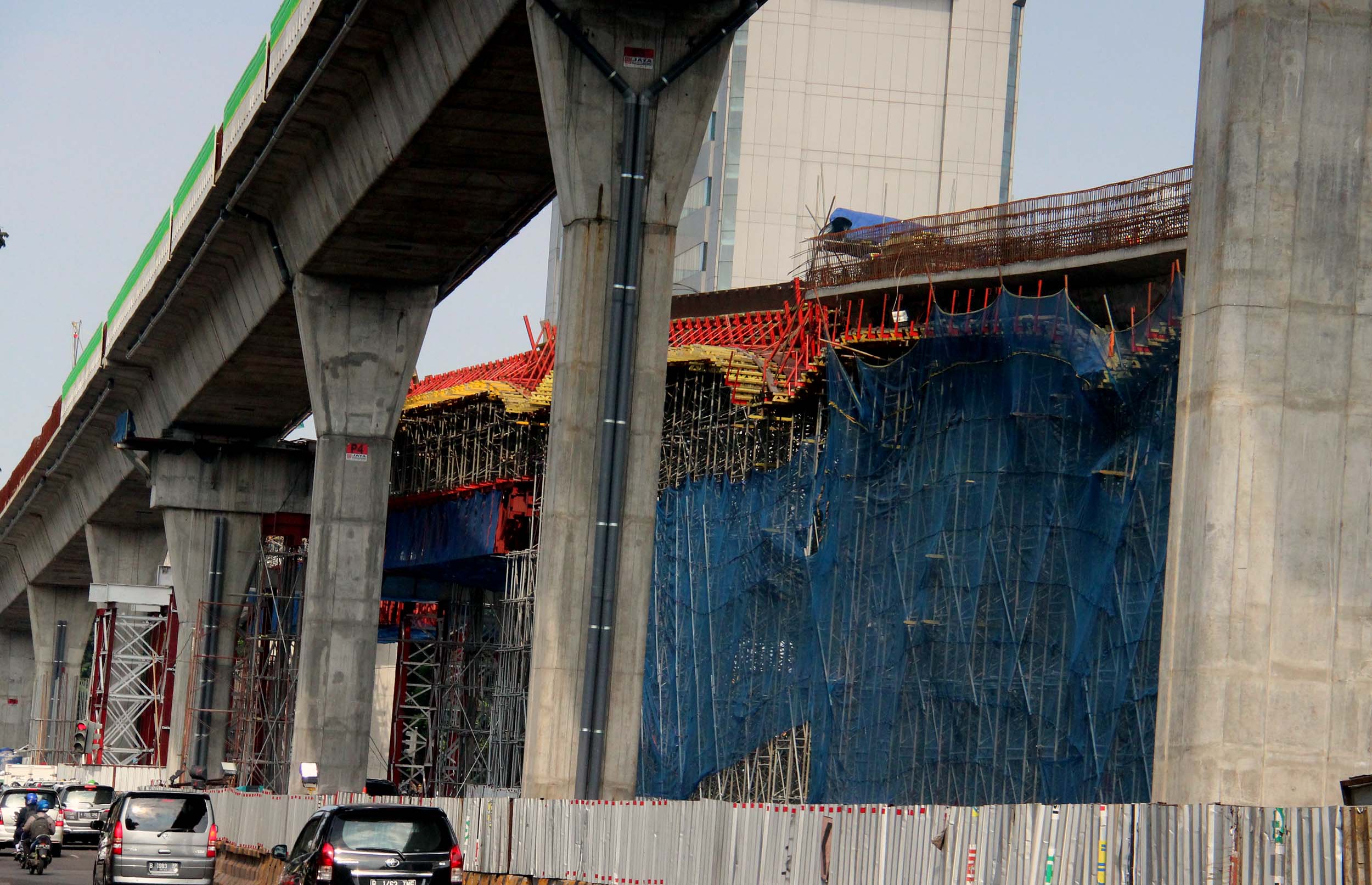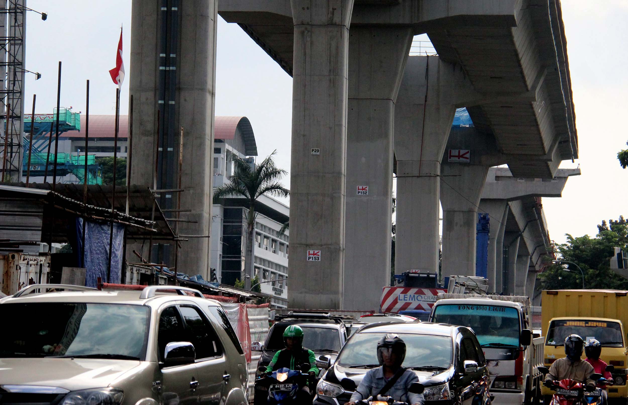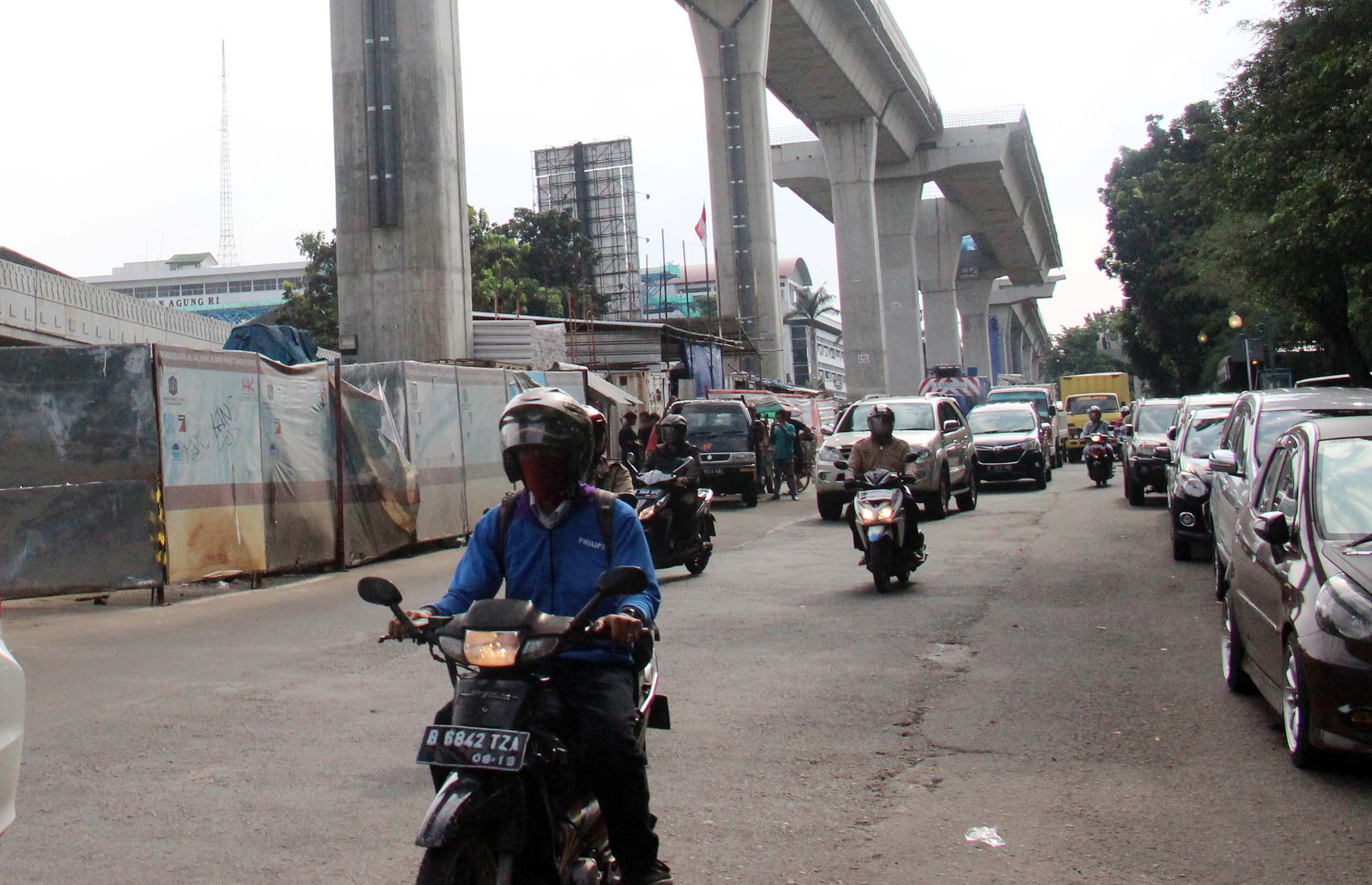 Kendaraan bermotor melintas di bawah JLNT Busway Ciledug-Tendean, di Jalan. Trunojoyo, Jakarta Selatan, Jumat (9/9/2016). Hingga awal September, pembangunan jalan layang khusus bus Transjakarta Koridor XIII Ciledug-Kapten P Tendean telah rampung 22 persen. Pengerjaan ini melebihi target yang ditetapkan yakni sebesar 18 persen.