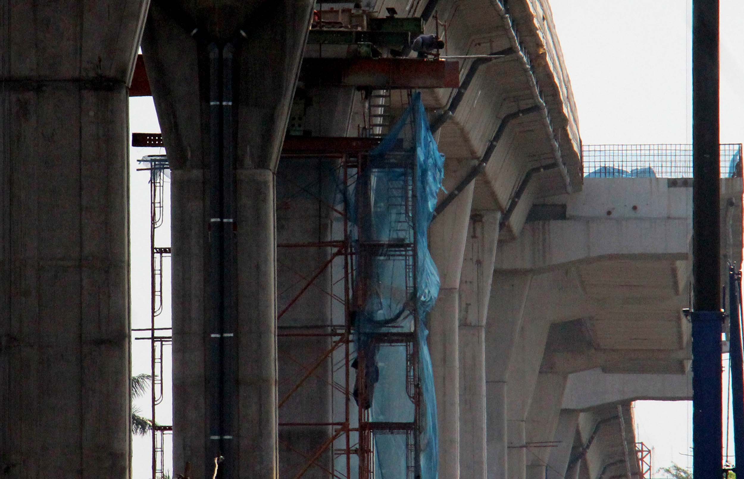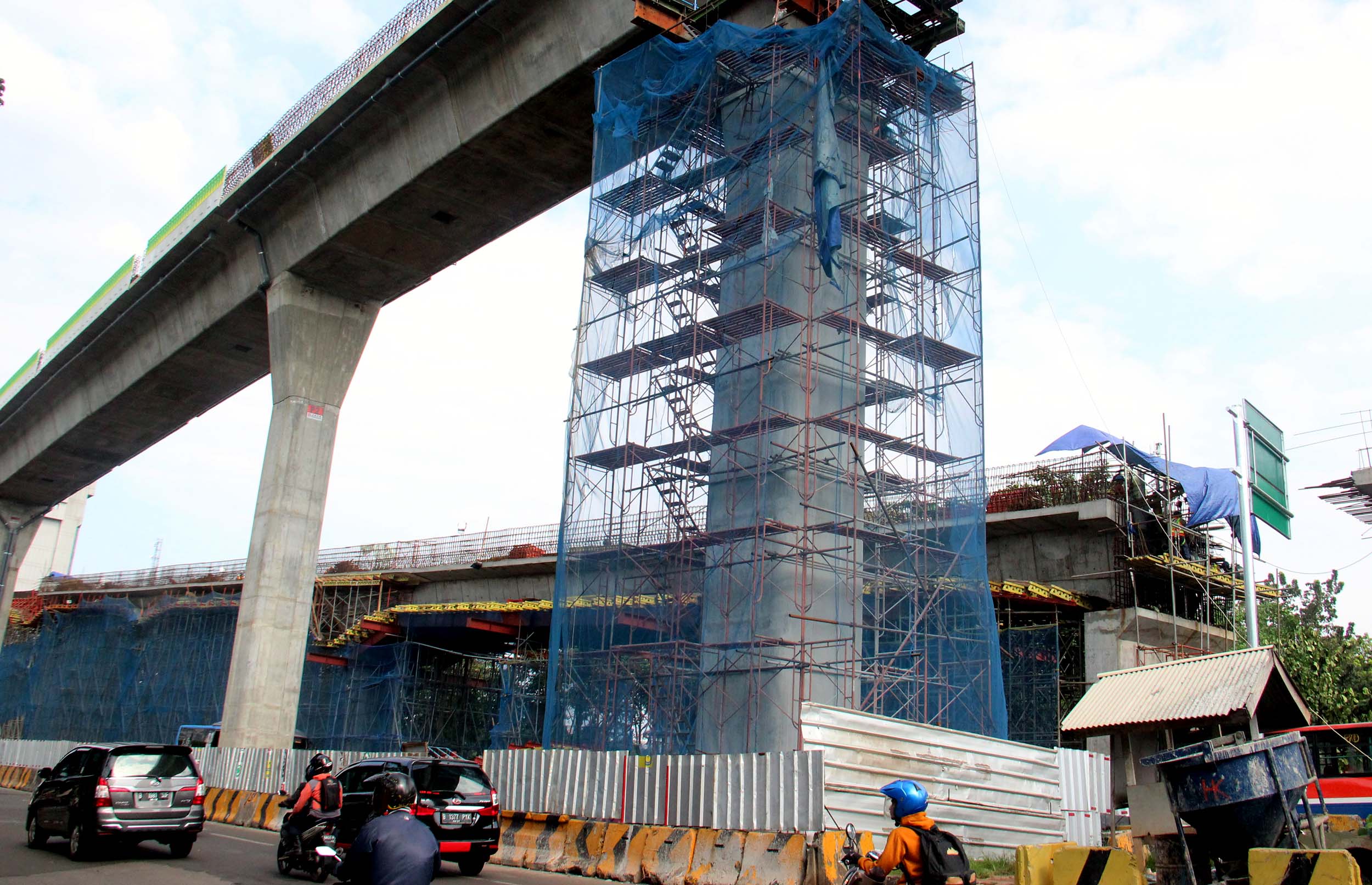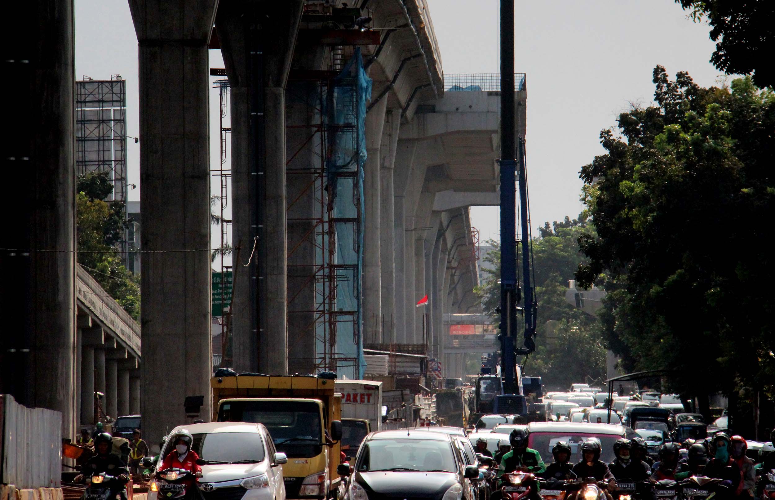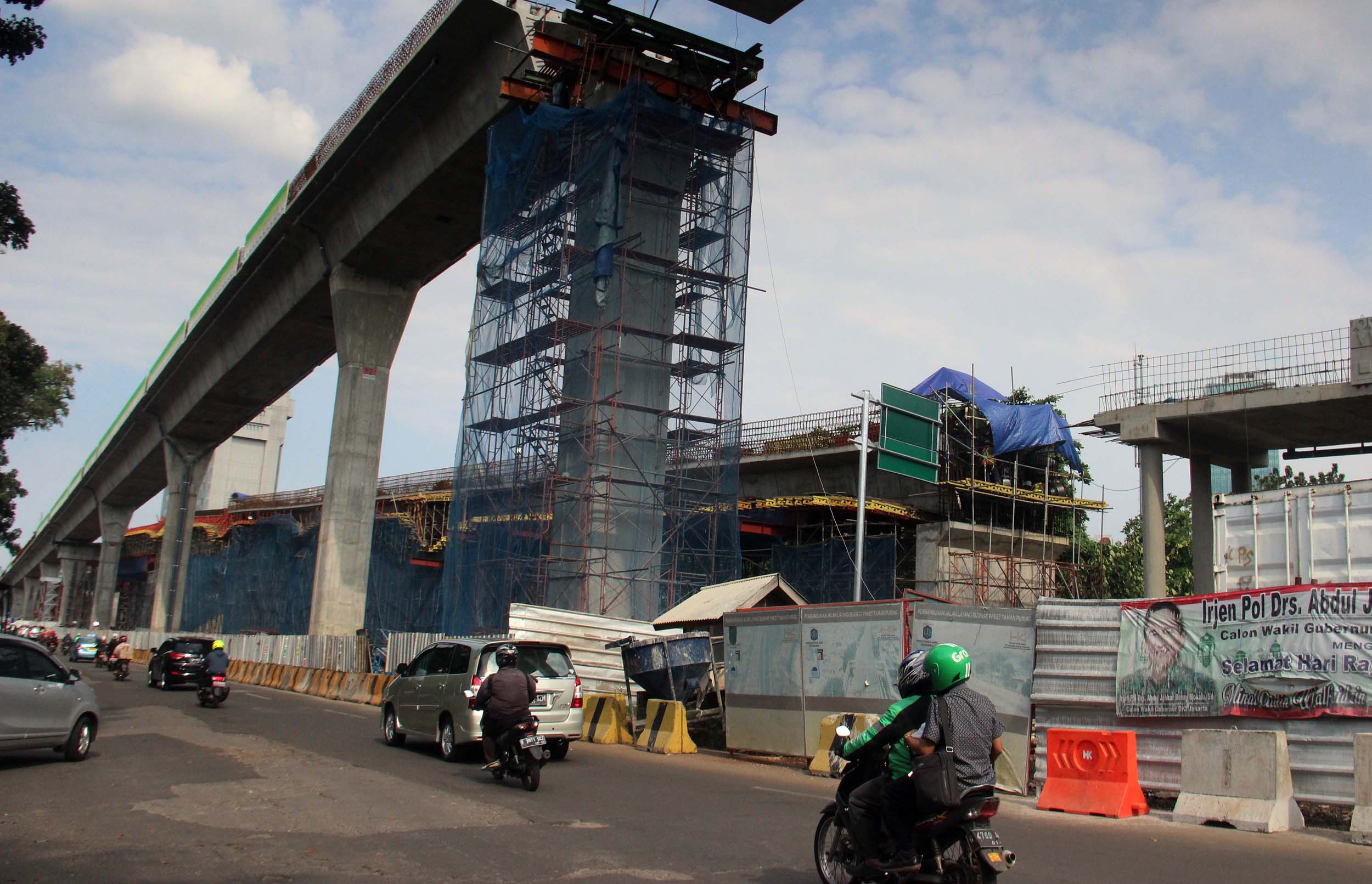 Kendaraan bermotor melintas di bawah JLNT Busway Ciledug-Tendean, di Jalan. Trunojoyo, Jakarta Selatan, Jumat (9/9/2016). Hingga awal September, pembangunan jalan layang khusus bus Transjakarta Koridor XIII Ciledug-Kapten P Tendean telah rampung 22 persen. Pengerjaan ini melebihi target yang ditetapkan yakni sebesar 18 persen.