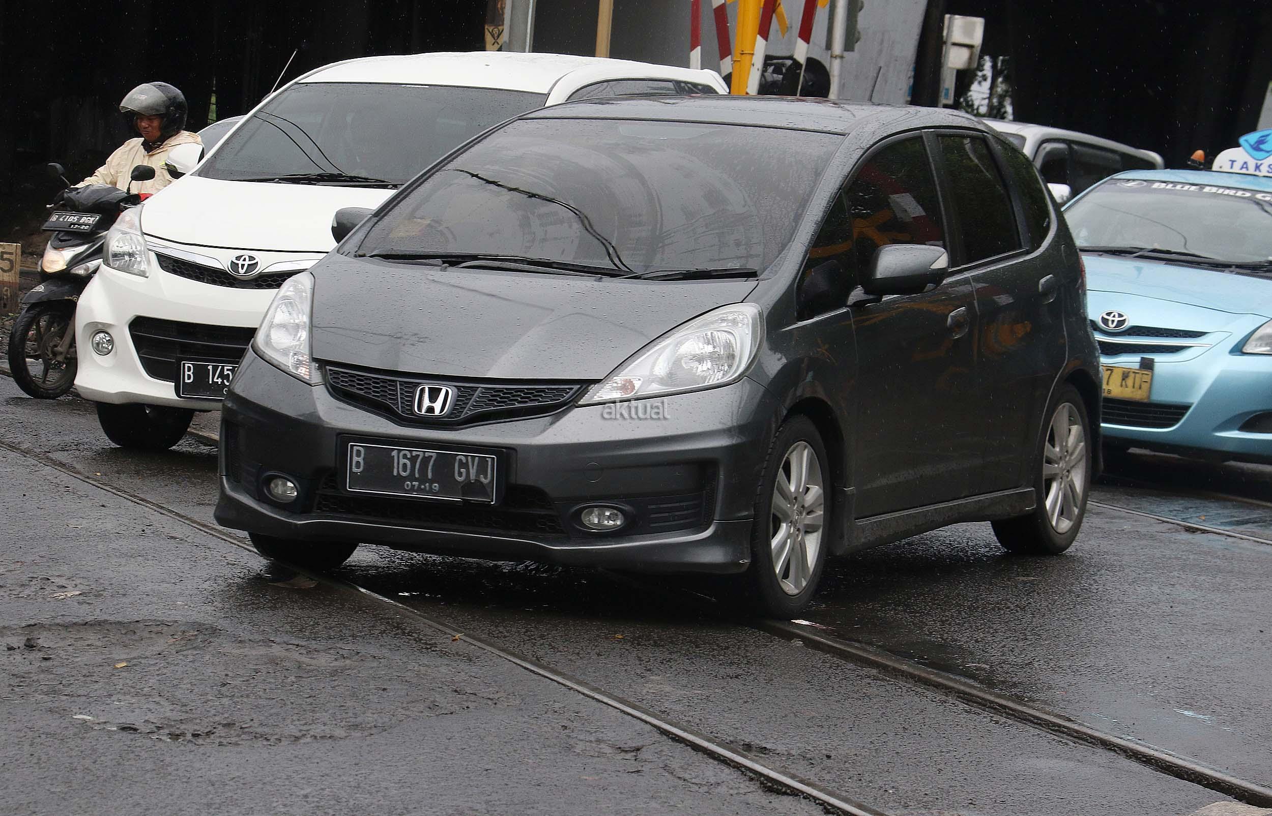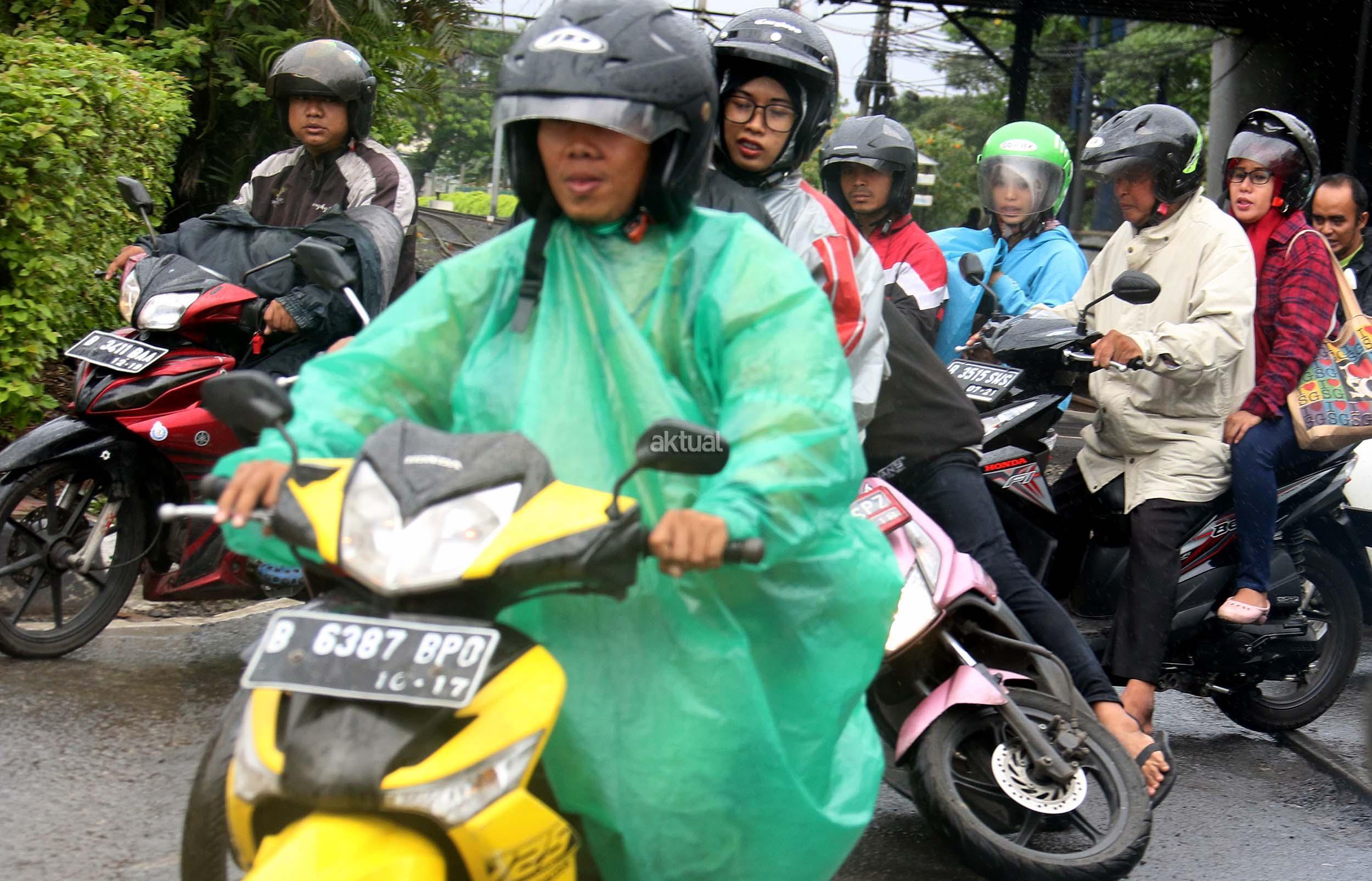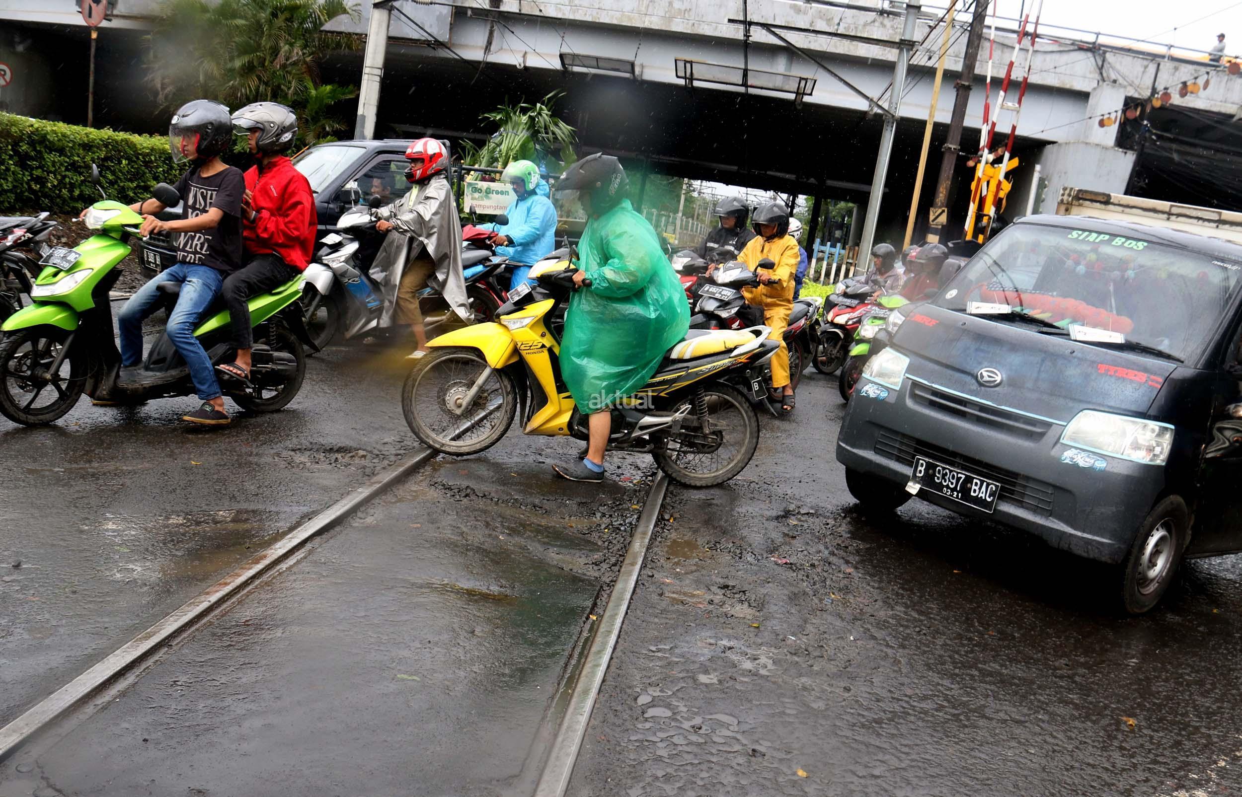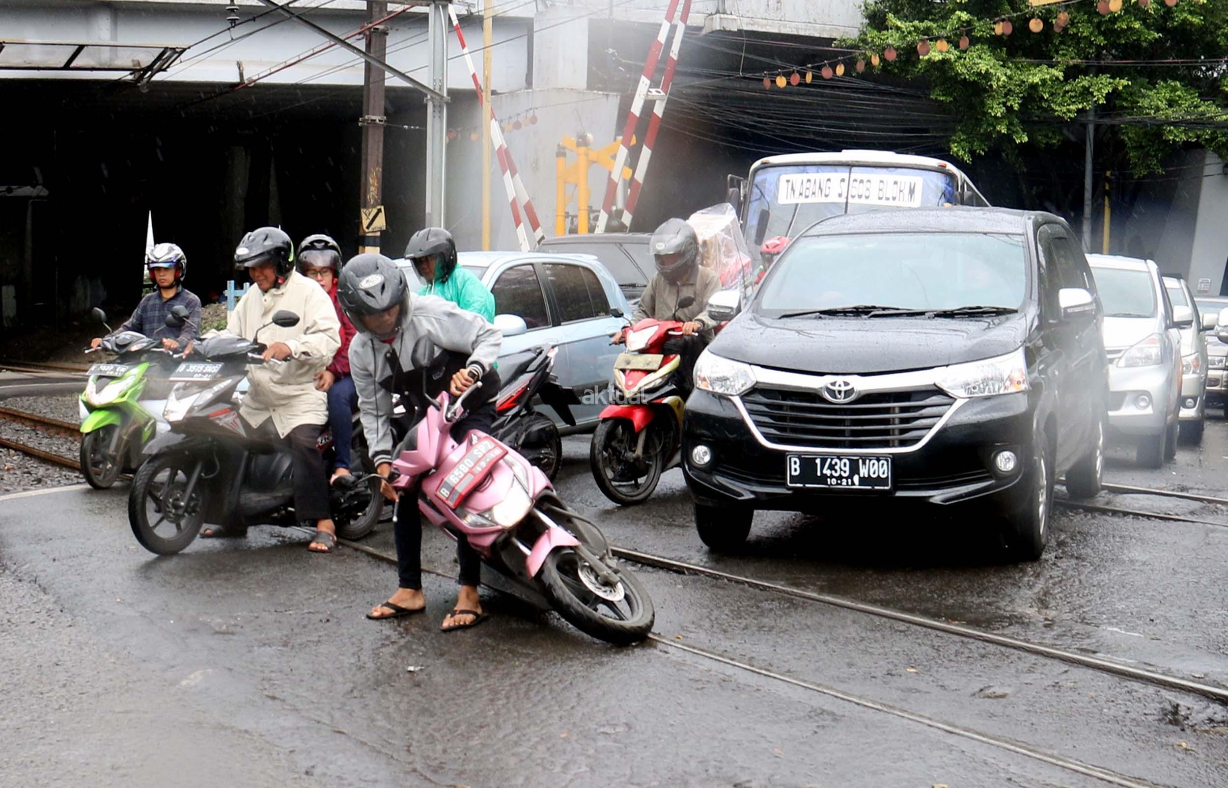 Pengendara motor jatuh saat melilntas di pelintasan rel kereta api ,Slipi, Jakarta, Senin (5/12/2016).Perlintasan rel Kereta Api Slipi rusak akibatnya selain kemacetan terjadi, pengendara sepeda motor sering menjadi korban. Kerusakan itu berupa aspal yang rusak hingga membuat lubang dan sepeda motor sering tergelincir dan jatuh. AKTUAL/Munzir