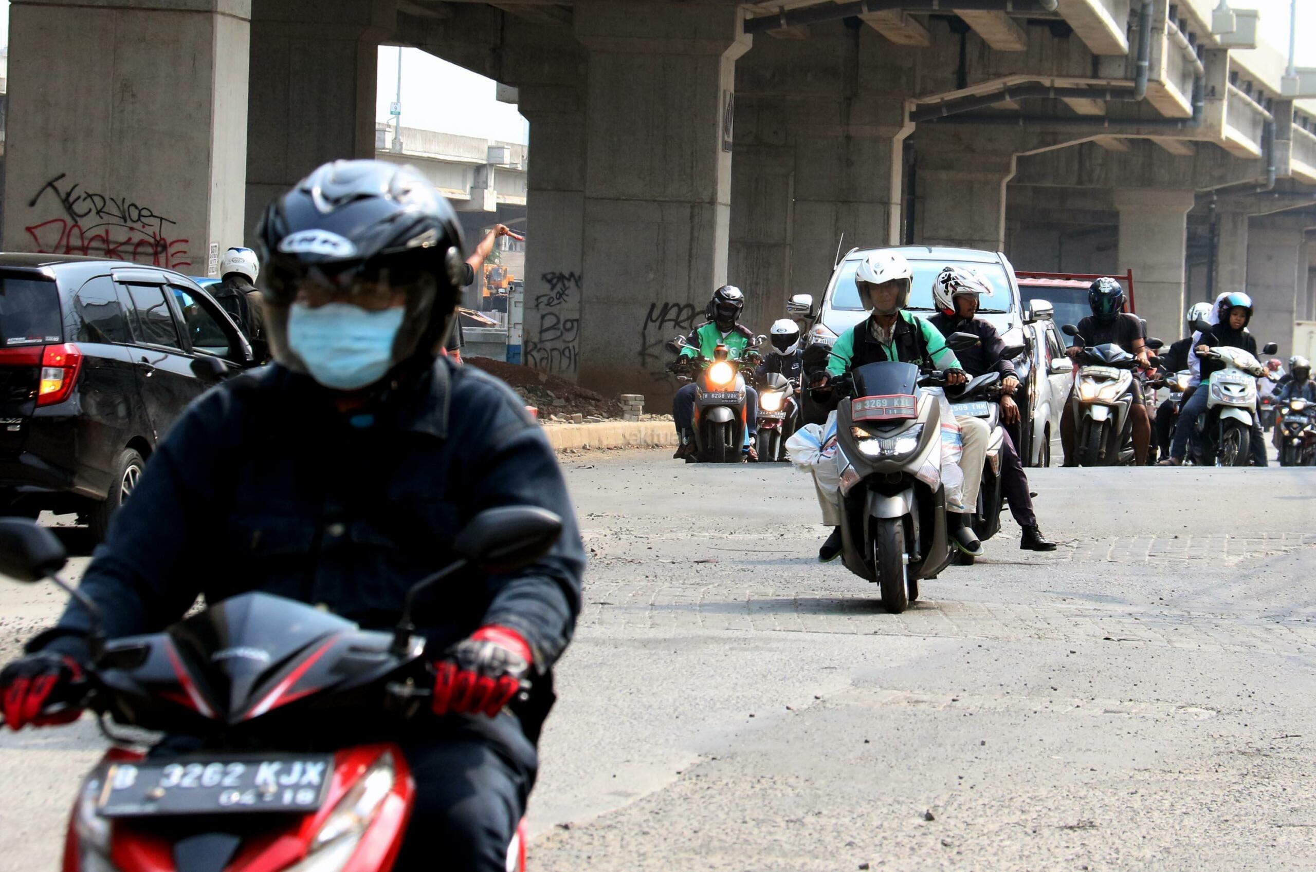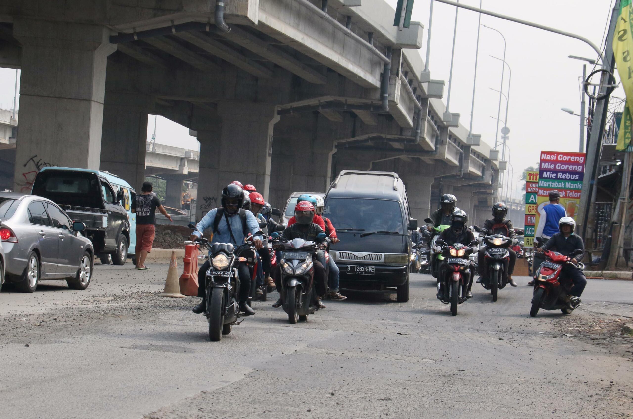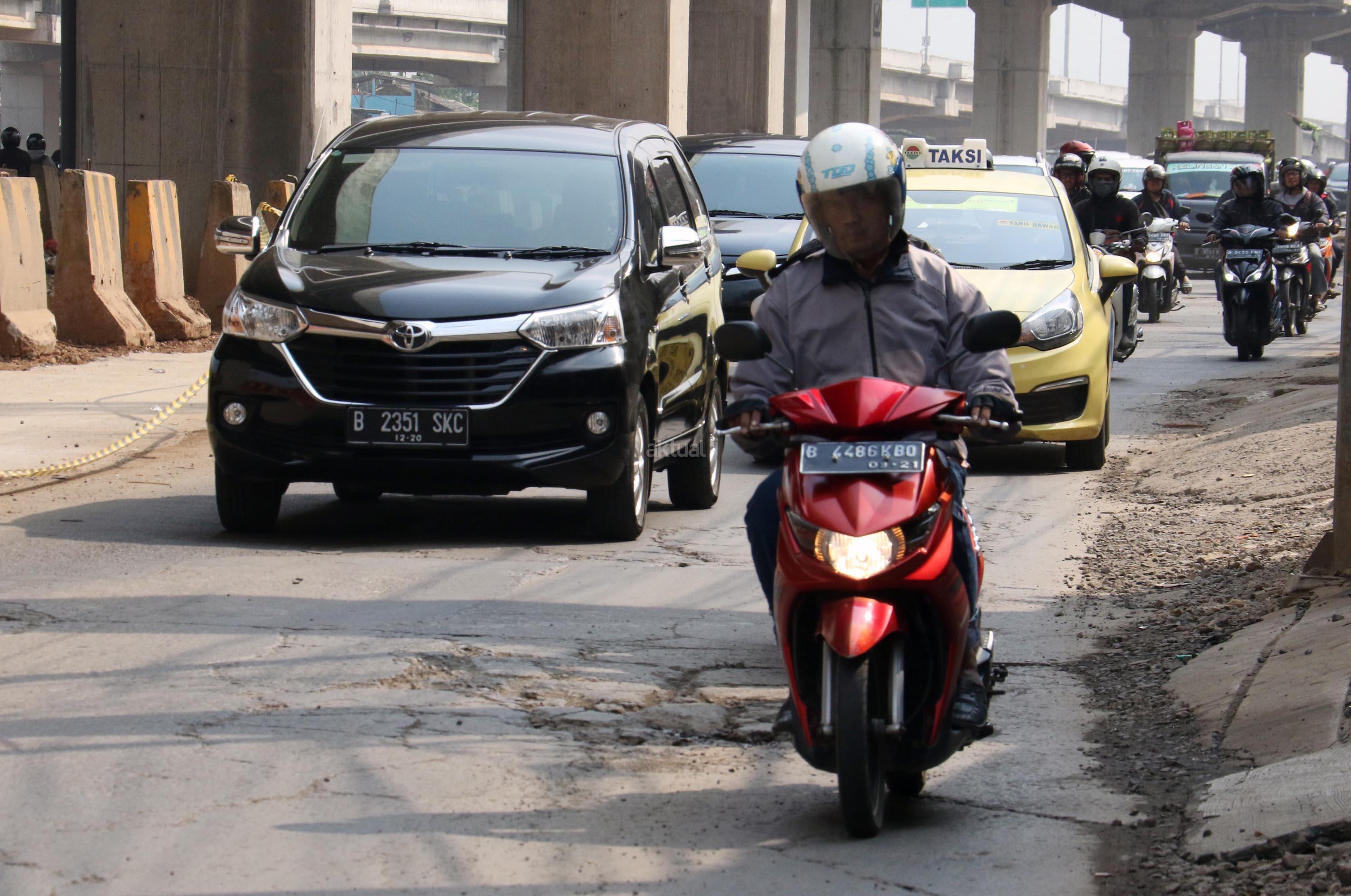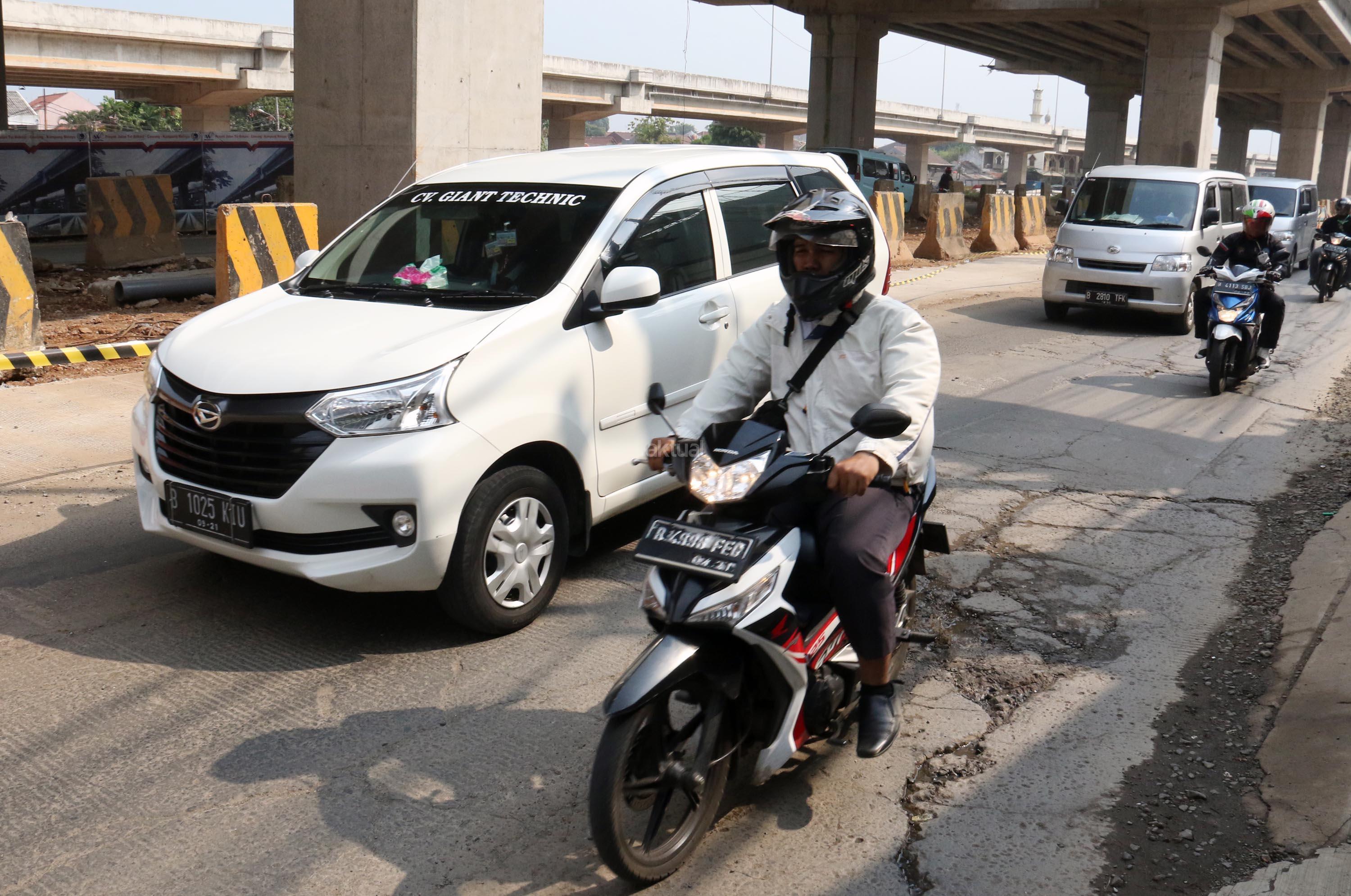 Pengendara bermotor menghindar jalan yang berlubang di jalan Raya Kalimalang, Bekasi, Rabu (21/6/2017). Menteri Perhubungan, Budi Karya Sumadi mengimbau kepada seluruh pemudik yang menggunakan sepeda motor untuk melewati jalur Pulogadung menuju Kota Bekasi dikarenakan jalur Kalimalang yang menghubungkan Kota Bekasi dan Jakarta jalannya yang masih berlubang imbas dari jalan layang Becakayu, dirasa cukup membahayakan bagi para pemudik. AKTUAL/Munzir
