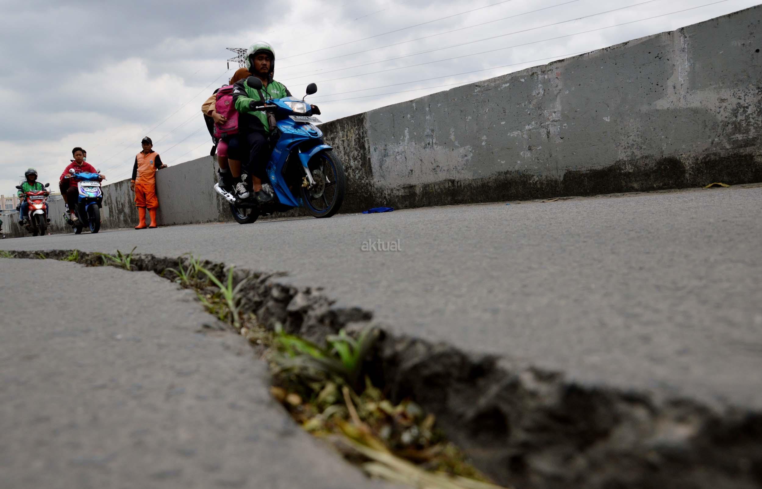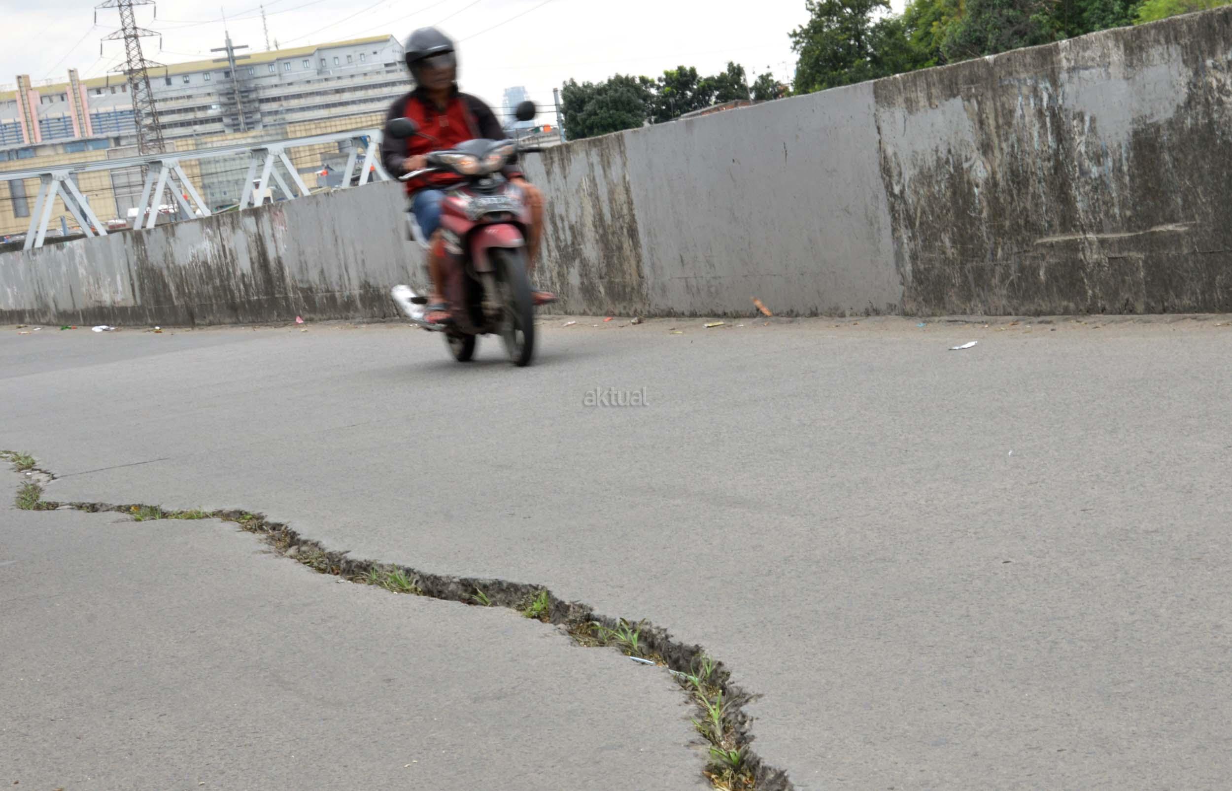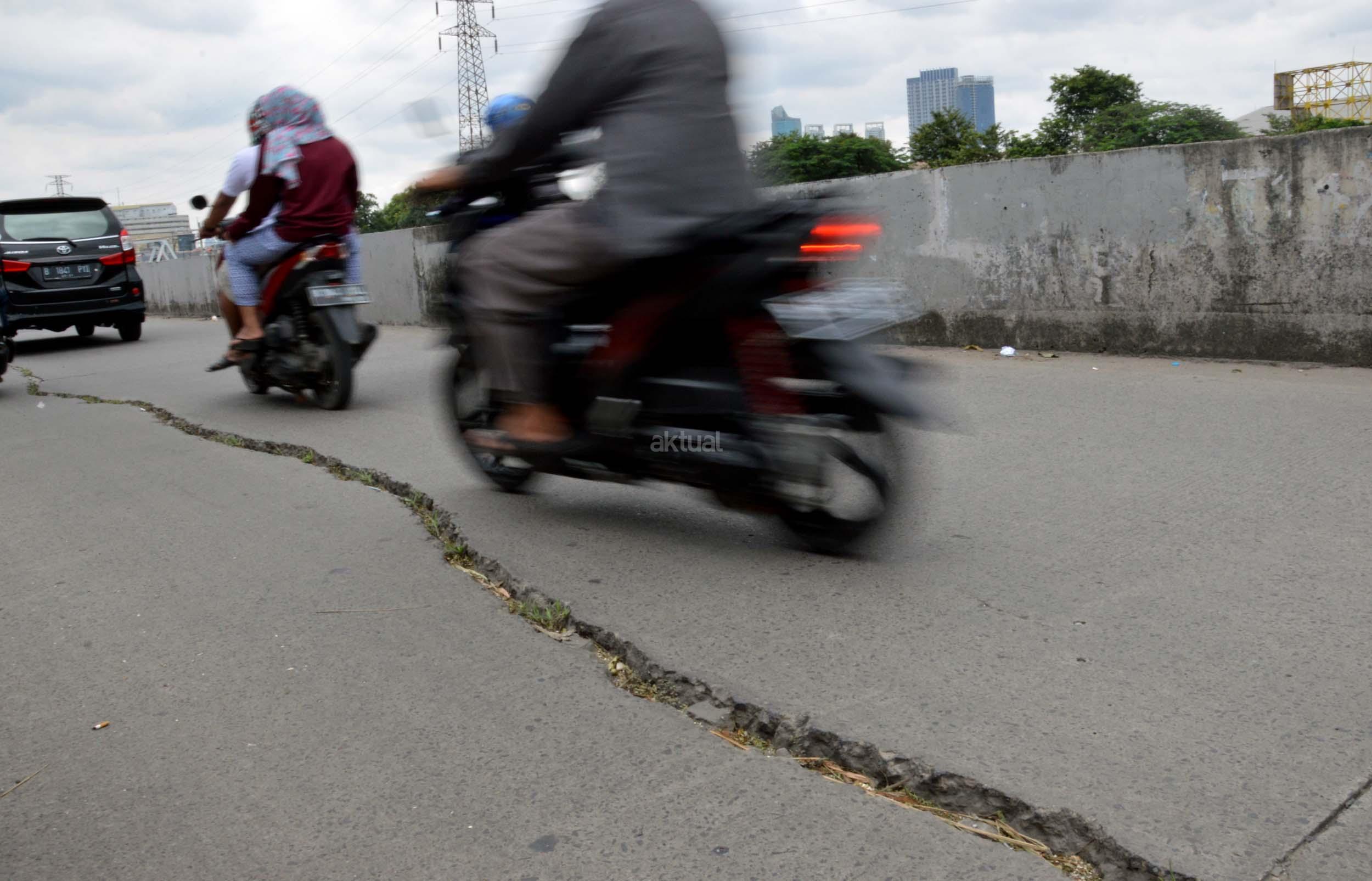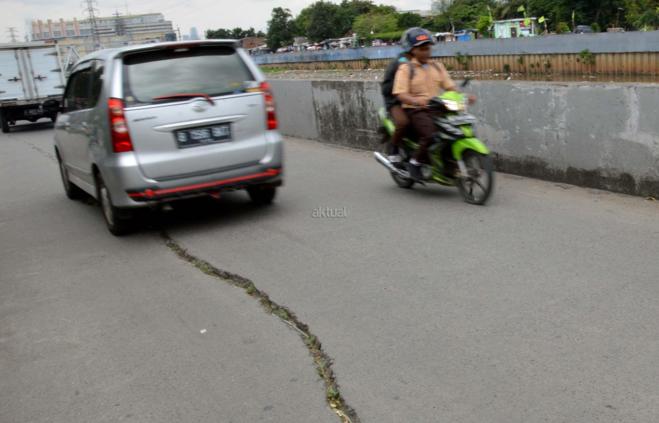 Sejumlah kendaraan melintasi jalan yang mengalami keretakan di kawasan Kali Anyar, Tambora, Jakarta Barat, Rabu (7/12/2016). Retaknya jalan yang sudah lama terjadi ini diakibatkan pergeseran tanah karena berada di bantaran Sungai Banjir kanal Barat (BKB), hal ini bisa membahayakan para warga yang sering melintas di jalan tersebut. Perlunya dinas terkait untuk memperbaiki jalan tersebut agar tidak terjadi kecelakaan. AKTUAL/Munzir