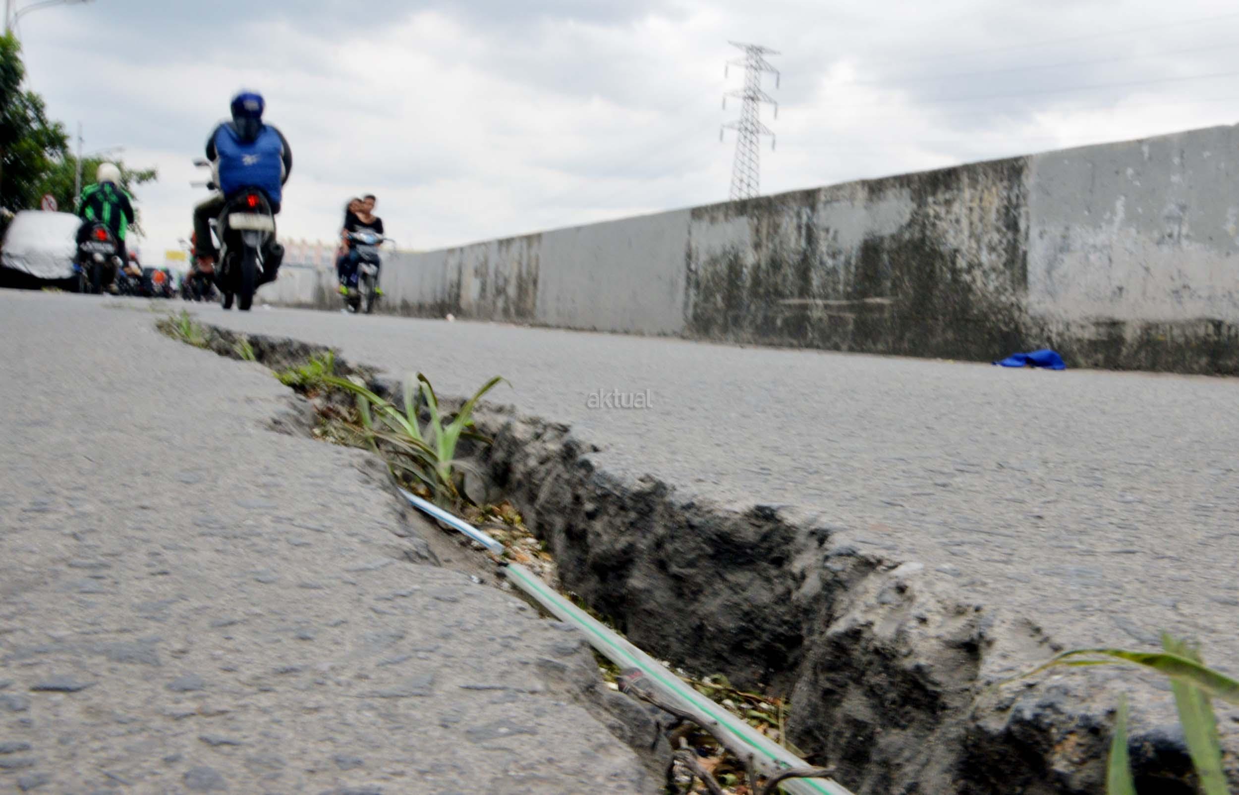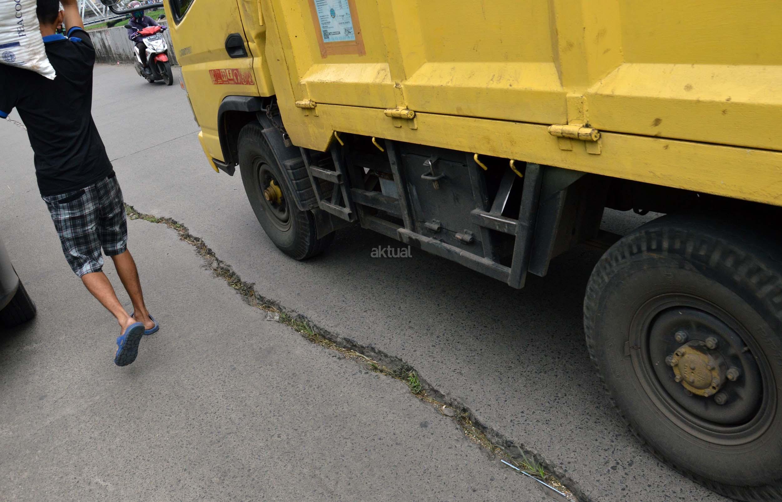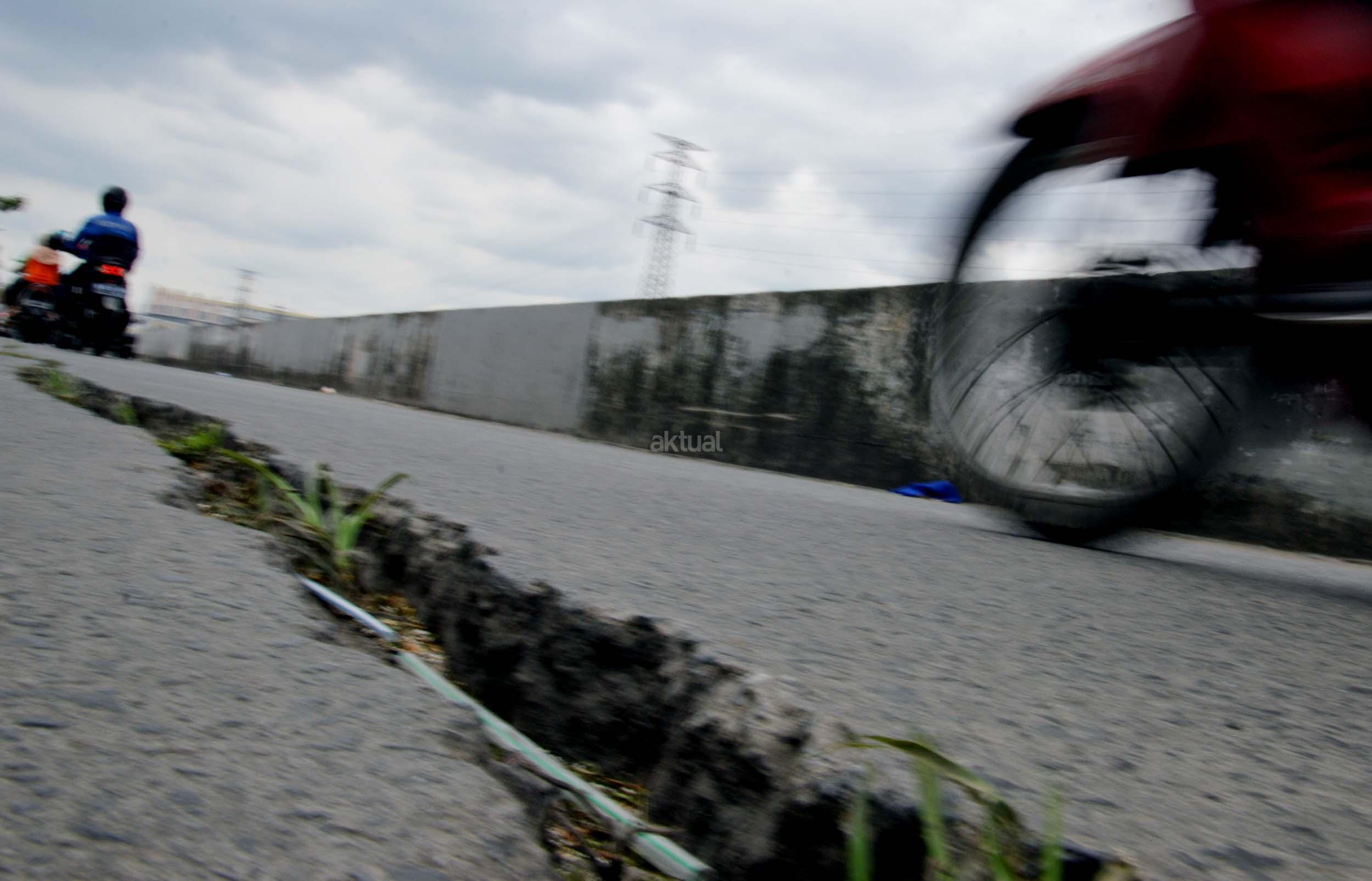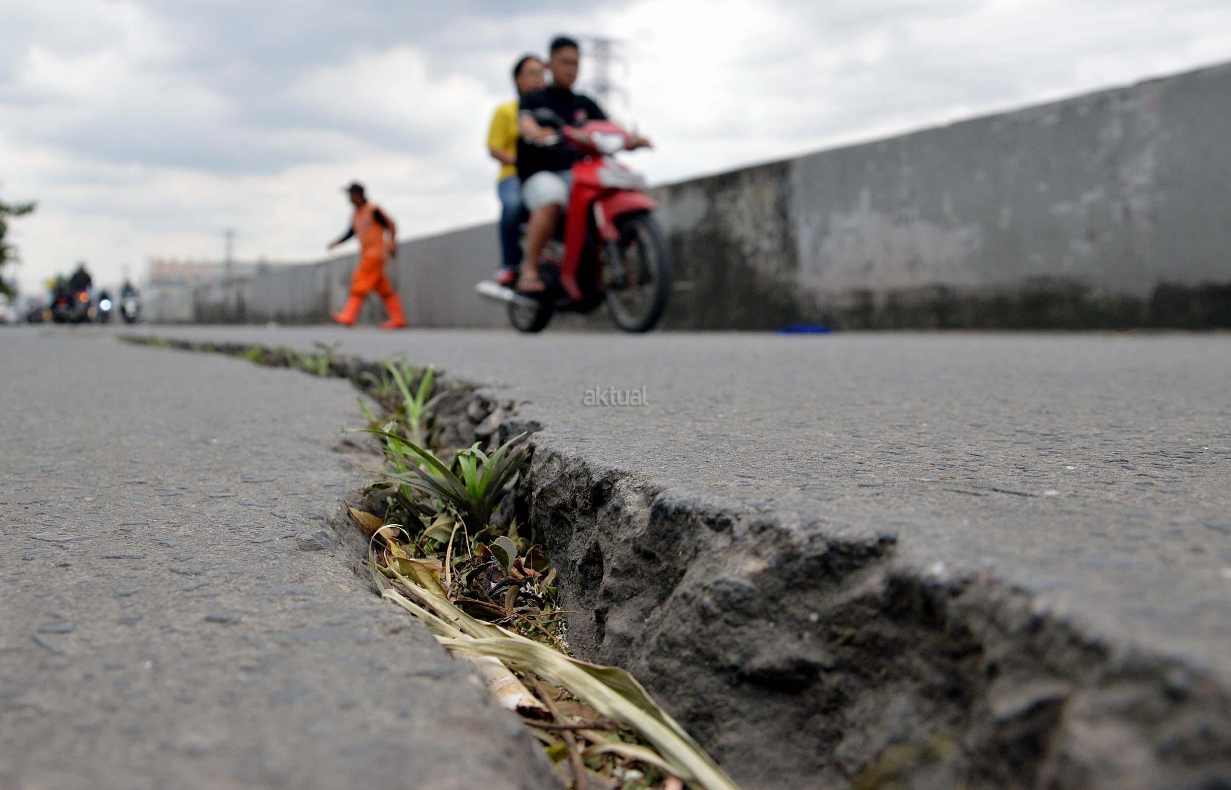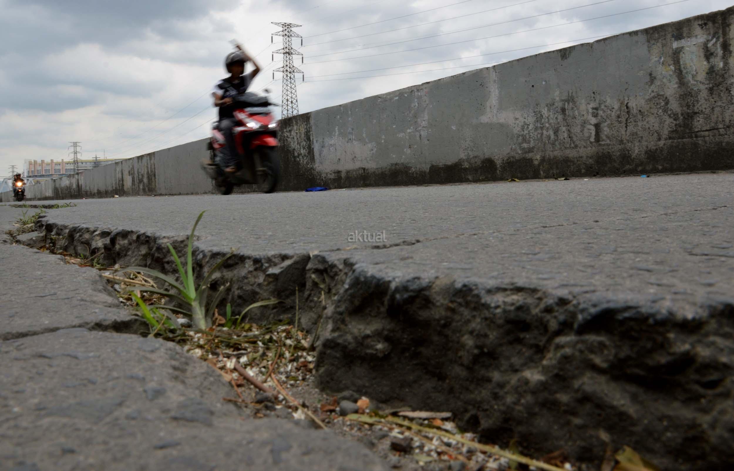 Sejumlah kendaraan melintasi jalan yang mengalami keretakan di kawasan Kali Anyar, Tambora, Jakarta Barat, Rabu (7/12/2016). Retaknya jalan yang sudah lama terjadi ini diakibatkan pergeseran tanah karena berada di bantaran Sungai Banjir kanal Barat (BKB), hal ini bisa membahayakan para warga yang sering melintas di jalan tersebut. Perlunya dinas terkait untuk memperbaiki jalan tersebut agar tidak terjadi kecelakaan. AKTUAL/Munzir