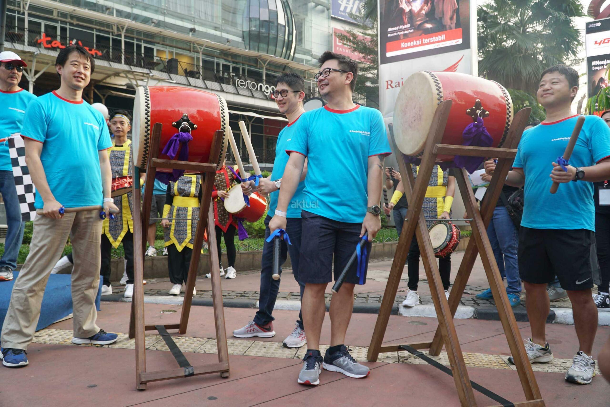 (dari kiri ke kanan ) para jajaran direksi Panin Daichi Life Presiden Direkur, Fadjar Gunawan, Direktur, Koichi Nisyiyama, Vice Presiden Director, Simon Ismanto, Direktur, Andrew Bain, VP Director, Masayuki Tanaka saat simbolis melakukan kegiatan aksi jalan sehat di jakarta, Minggu (23/7). Kegiatan dalam rangka HUT ke-43 Perseroan itu diikuti kurang lebih 1000 peserta yang terdiri atas karyawan, keluarga dan mitra bisnis yang mendonasikan Rp10 ribu untuk dana sosial dari setiap kilometer rute yang ditempuh.Terkait dengan aspek kesehatan, Panin Dai ichi Life juga terus membuktikan komitmennya dalam hal pembayaran klaim kesehatan.Pada periode 1 Januari 2016 hingga 30 Juni 2017,Panin Dai-ichi Life telah membayarkan sebanyak lebih dari 18.500 klaim kesehatan dengan nilai lebih dari Rp 93 miliar. AKTUAL/Eko S Hilman