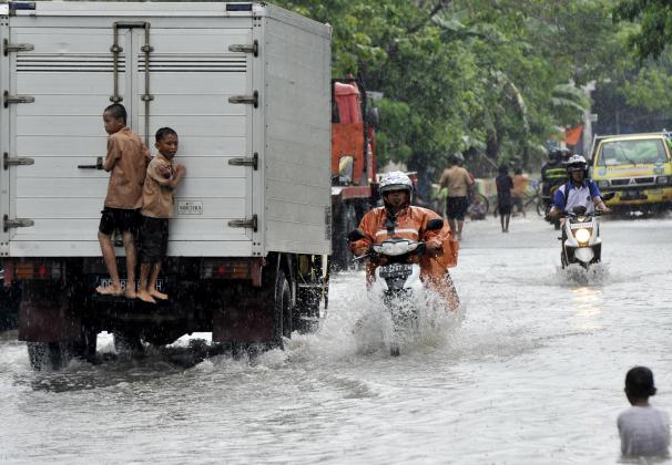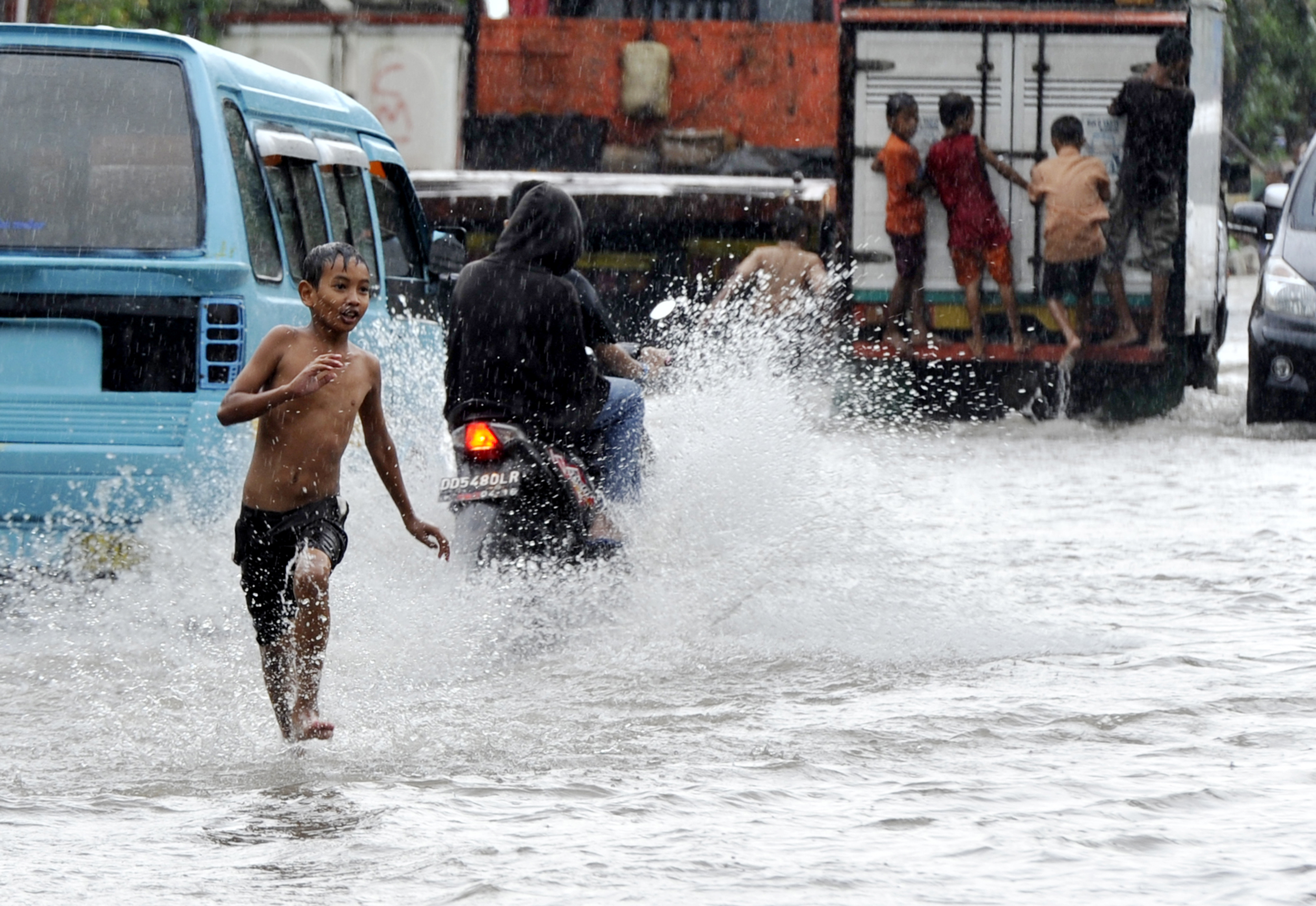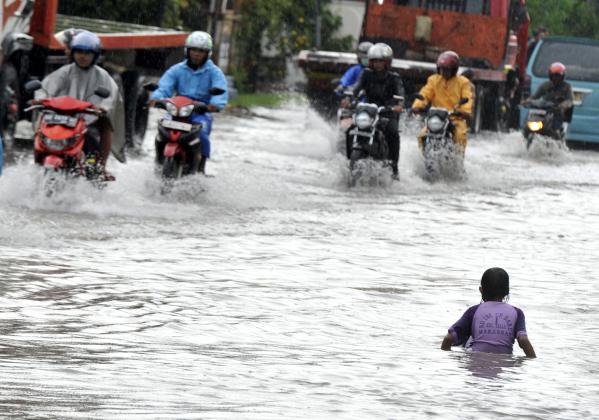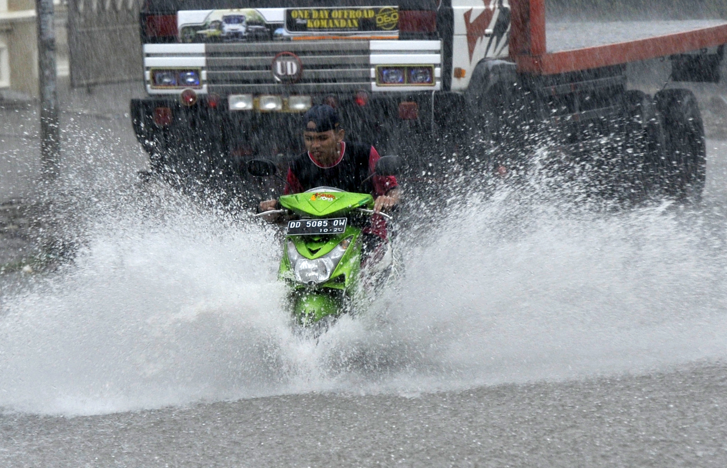 Pengendara berusaha menerobos genangan air di Kelurahan Ujung Pandang Baru, Kecamatan Tallo, Makassar, Sulawesi Selatan, Sabtu (27/2). Sejumlah ruas jalan di Makassar tergenang air hujan akibat sistem drainase yang kurang memadai sehingga mengakibatkan kemacetan. ANTARA FOTO/Yusran Uccang/foc/16.