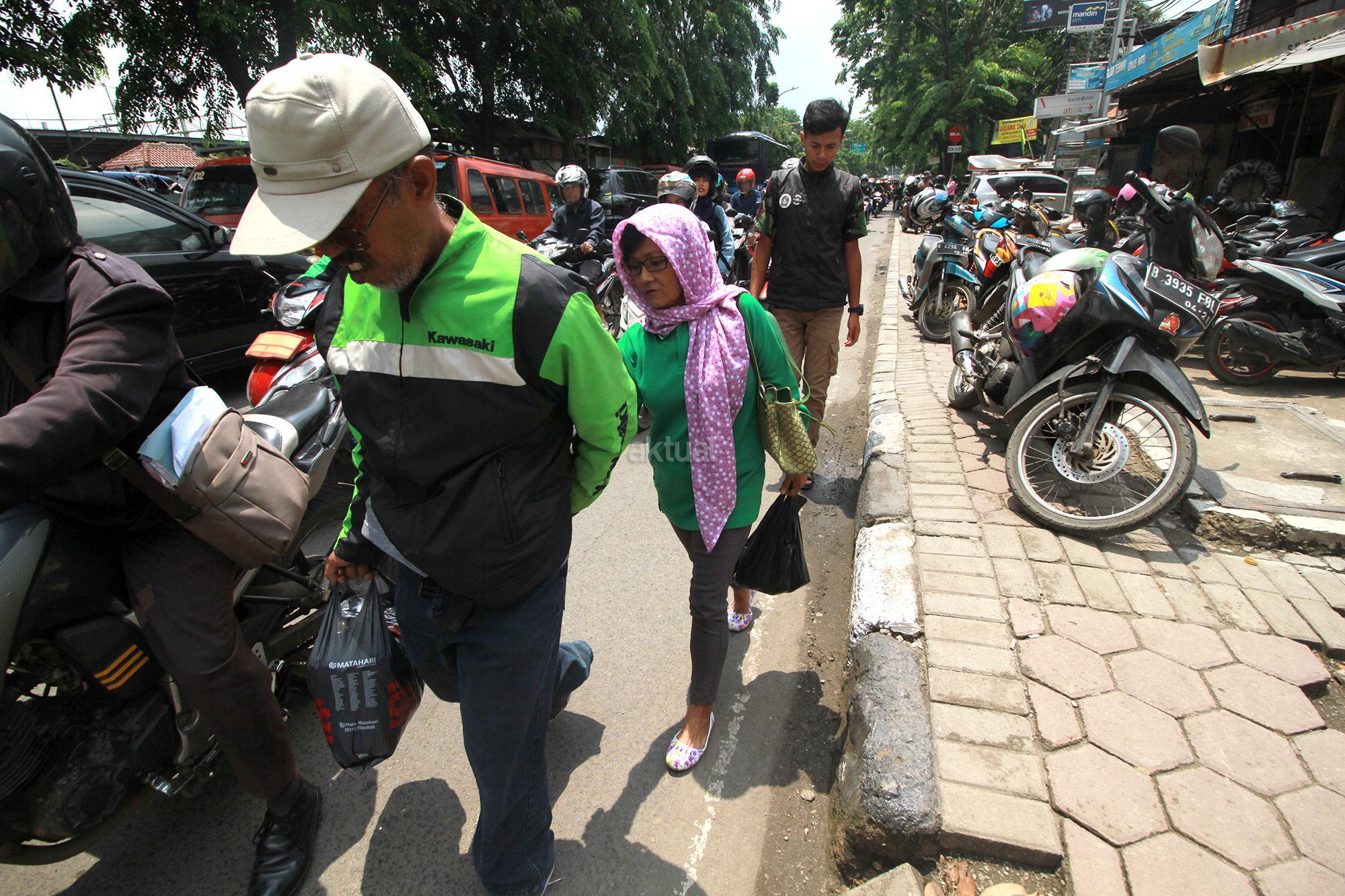 Seorang warga berjalan dipiggir jalan dengan kondisi trotoar dipakai parkir sepeda motor di Jalan Ir H Juanda, Kota Bekasi, Jawa Barat, Selasa (4/10). Trotoar dan jalur hijau di jalan Ir H Juanda, Kota Bekasi, berubah fungsi jadi lahan parkir sepeda motor. Hak seorang Pejalan kaki dilindungi oleh UU no.22 tahun 2009 tentang Lalu Lintas dan Angkutan Jalan, di pasal 13, yakni (1) Pejalan Kaki berhak atas ketersediaan fasilitas pendukung yang berupa trotoar, tempat penyeberangan, dan fasilitas lain. Aktual/Tino Oktaviano