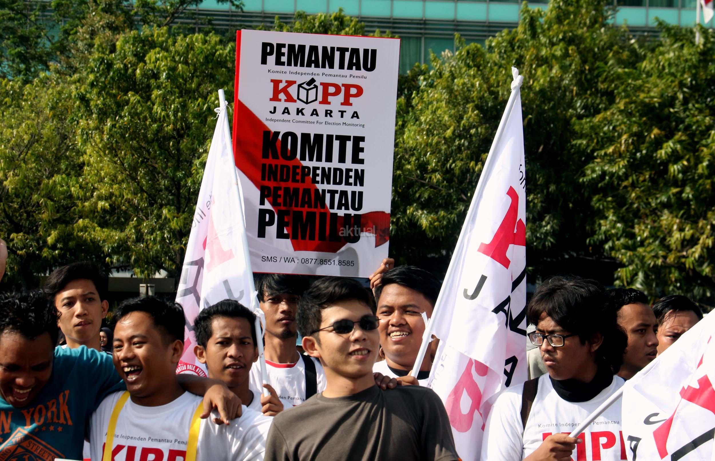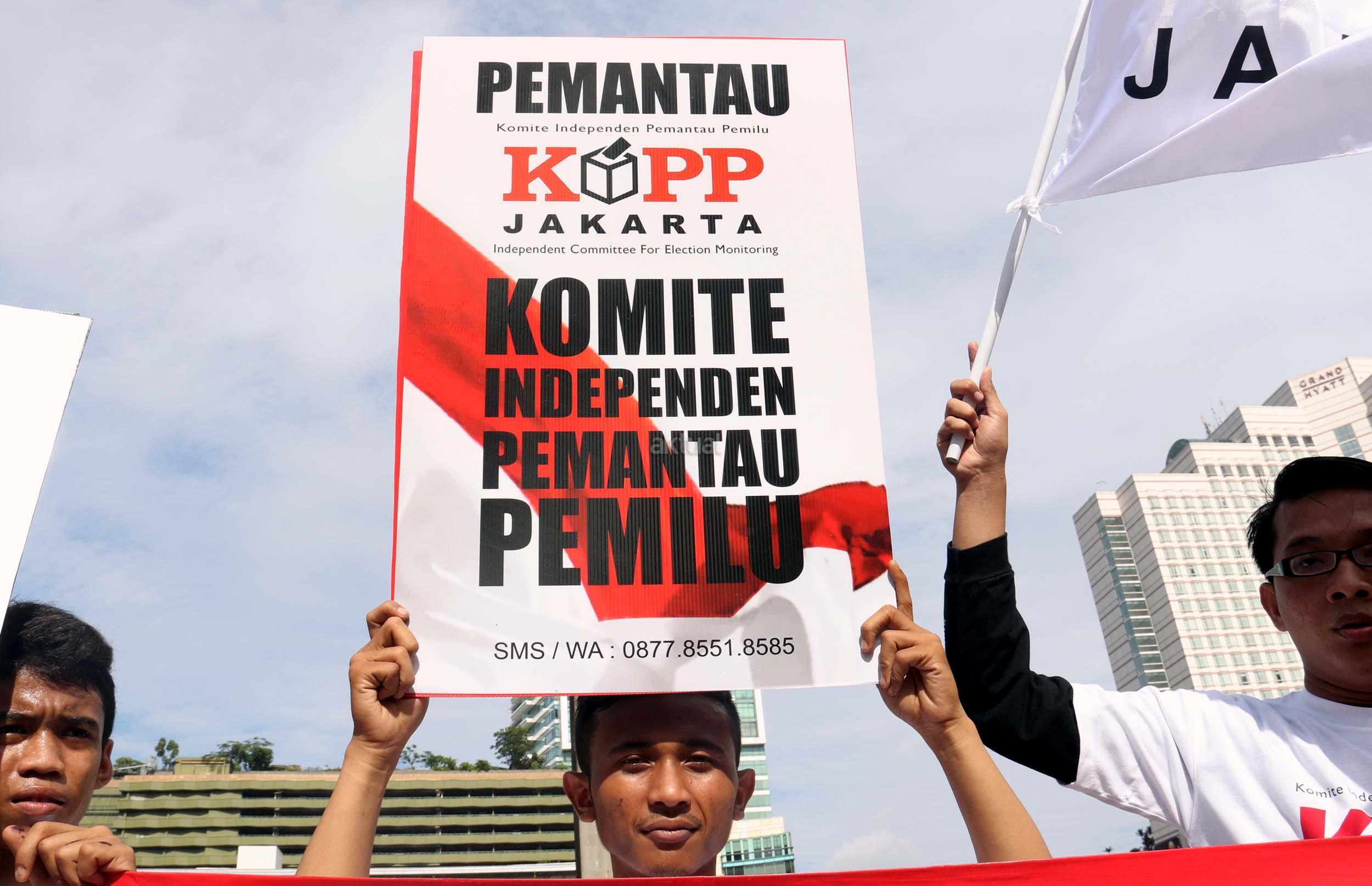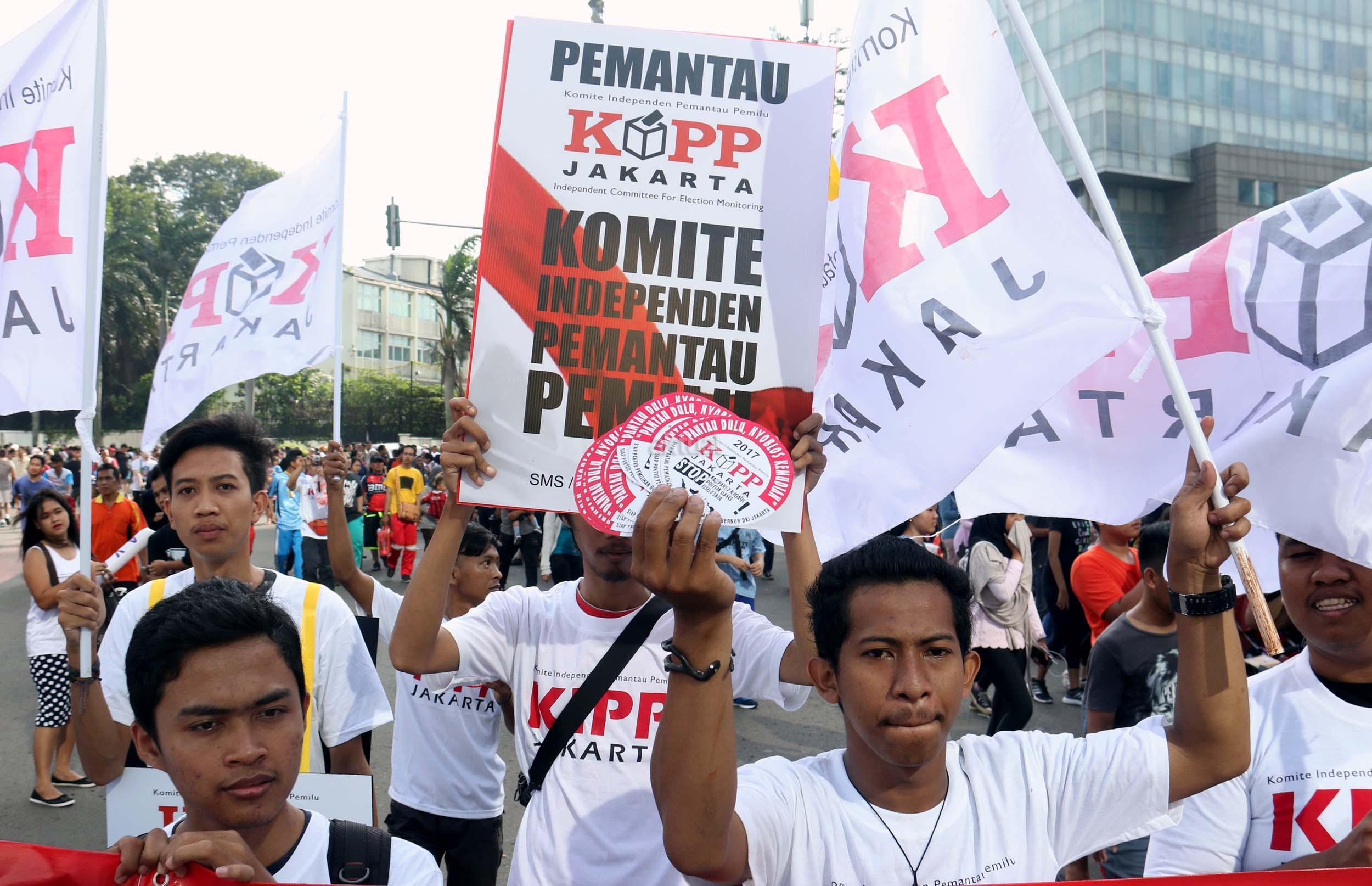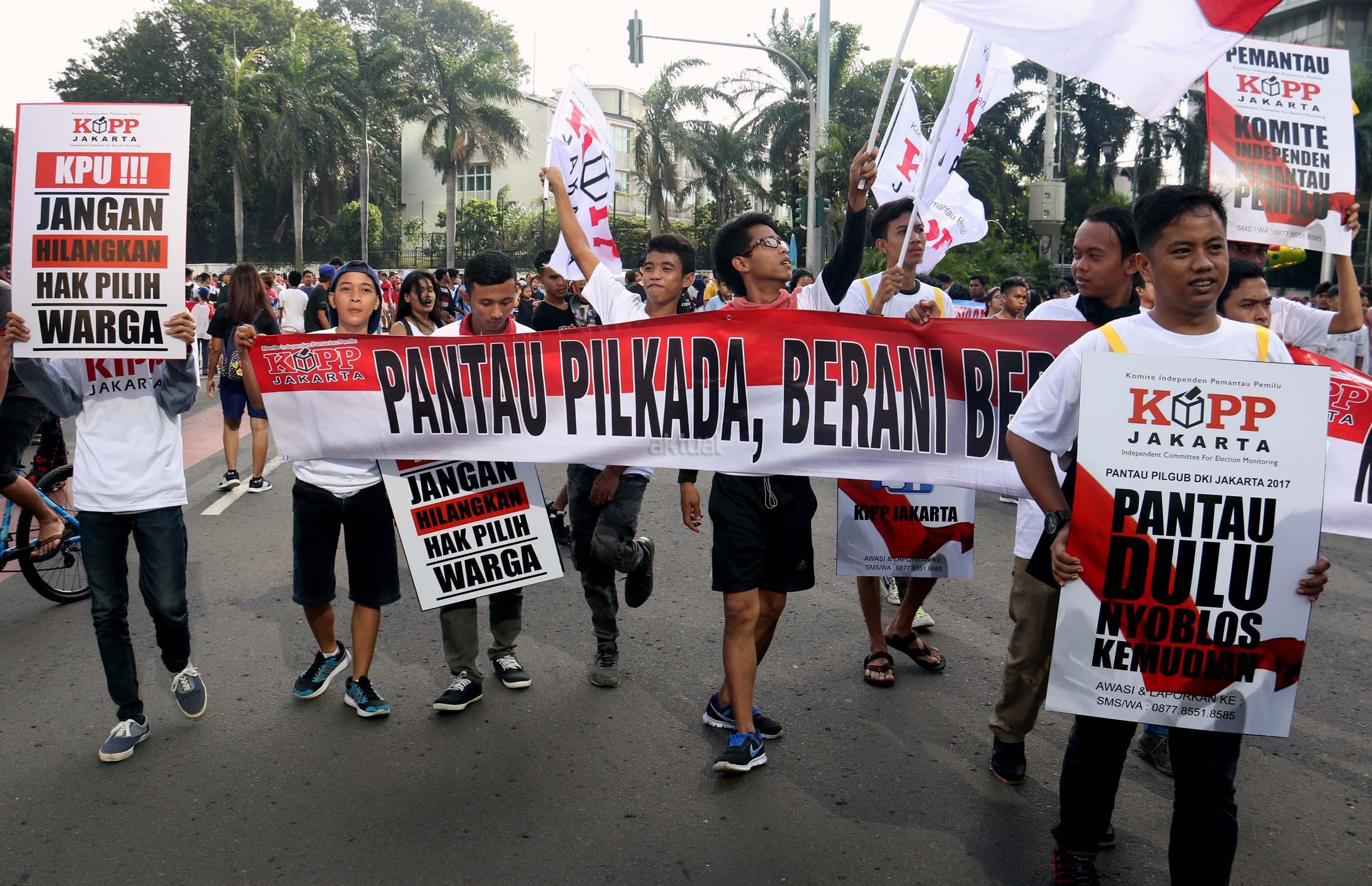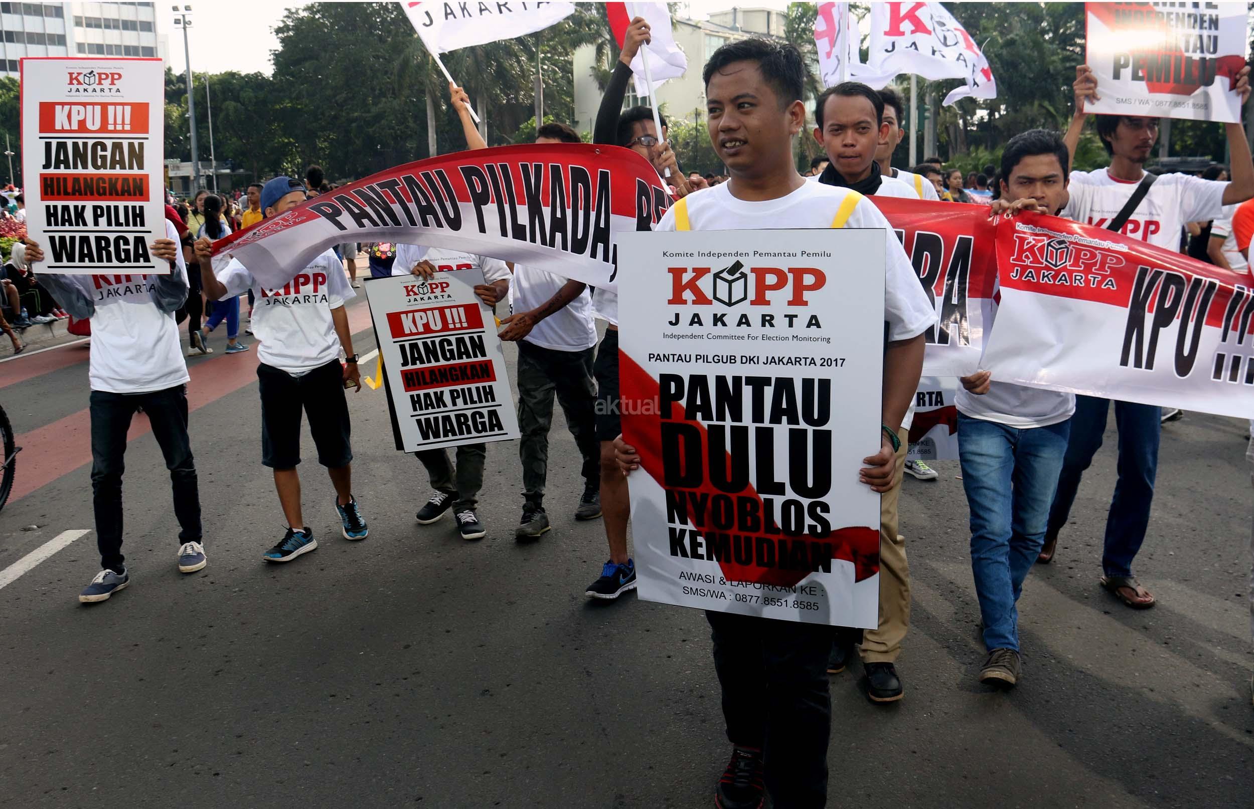 Sejumlah aktivis KIPP (Komite Independen Pemantau Pemilu) Jakarta melakukan aksi kampanye Pilkada Jakarta, di kawasan CFD, Bunderan HI, Jakarta, Minggu (12/3/2017). Dalam aksi kampanye Pikada DKI KIPP mengambil tema “KPU Jangan Hilangkan Hak Warga. AKTUAL/Munzir