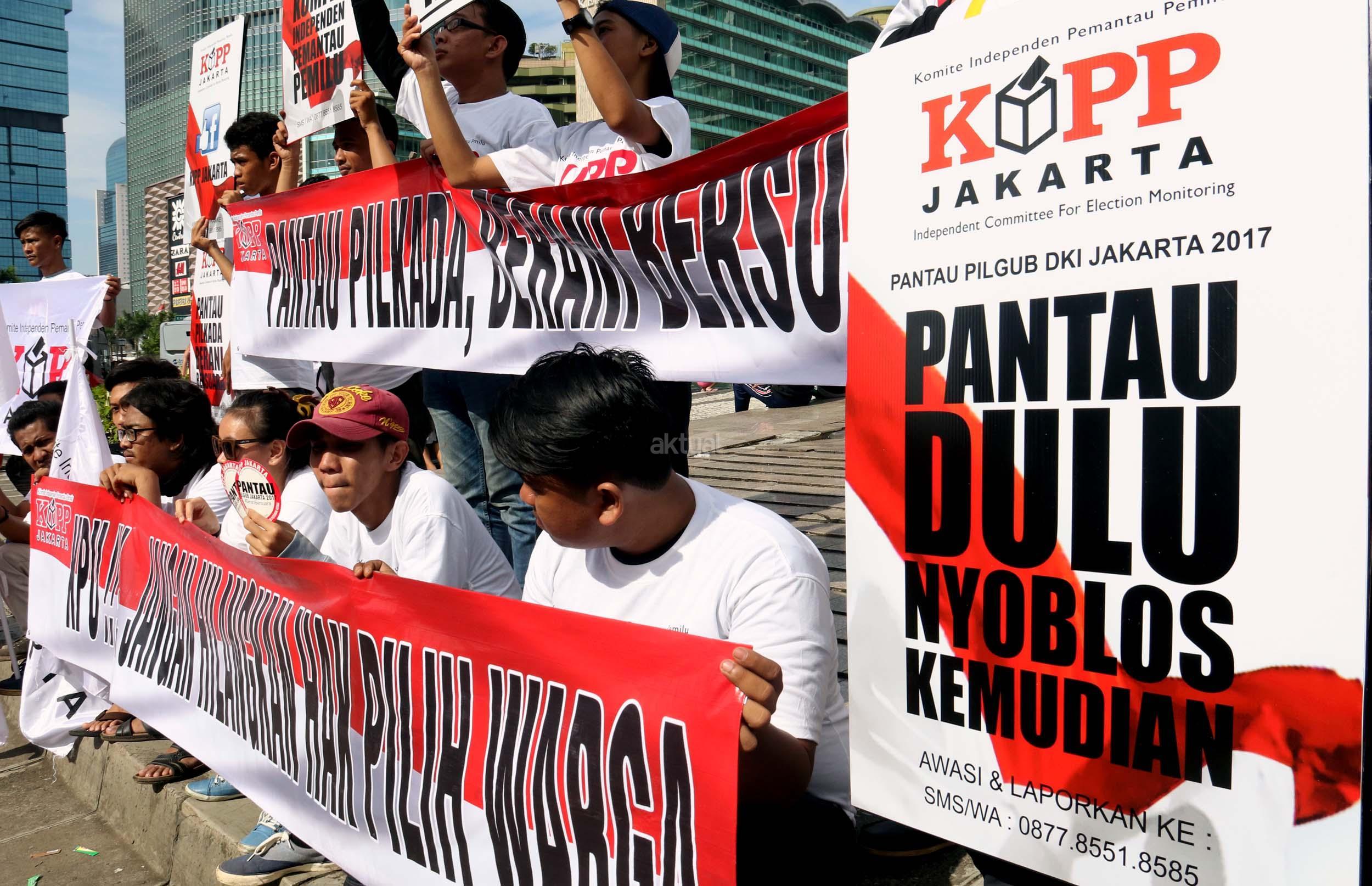 Sejumlah aktivis KIPP (Komite Independen Pemantau Pemilu) Jakarta melakukan aksi kampanye Pilkada Jakarta, di kawasan CFD, Bunderan HI, Jakarta, Minggu (12/3/2017). Dalam aksi kampanye Pikada DKI KIPP mengambil tema "KPU Jangan Hilangkan Hak Warga. AKTUAL/Munzir