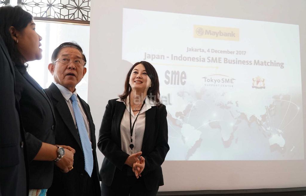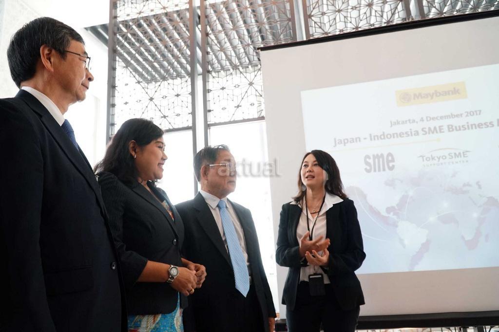 di tengah Seminar ‘Japan-Indonesia SME Business Matching’ di Kantor pusat Maybank, Jakarta, Senin (4/12). Maybank Indonesia secara aktif mendukung pertumbuhan ekonomi Indonesia, khususnya dalam penanaman modal asing dengan mempertemukan perusahaan lokal dengan perusahaan luar negeri. Seminar menjadi forum diskusi antara para pengusaha usaha kecil menengah (UKM) Jepang yang tergabung dalam Small & Medium Enterprises of Japan (SMEJ) dengan perusahaan Jepang di Indonesia, baik sebagai pembeli (buyer) maupun pemasok (supplier) dan perusahaan Indonesia sebagai pemasok. Dalam mendukung kemitraan tersebut, Maybank Indonesia menyediakan rangkaian produk dan layanan perbankan kepada para pengusaha UKM Jepang di Indonesia, mulai dari segmen perbankan ritel hingga perbankan global, termasuk account services dan remitansi (remmitance), pembiayaan perdagangan (trade finance), valuta asing (foreign exchange), serta produk treasury lainnya melalui Maybank Japan Desk. AKTUAL/Eko S Hilman