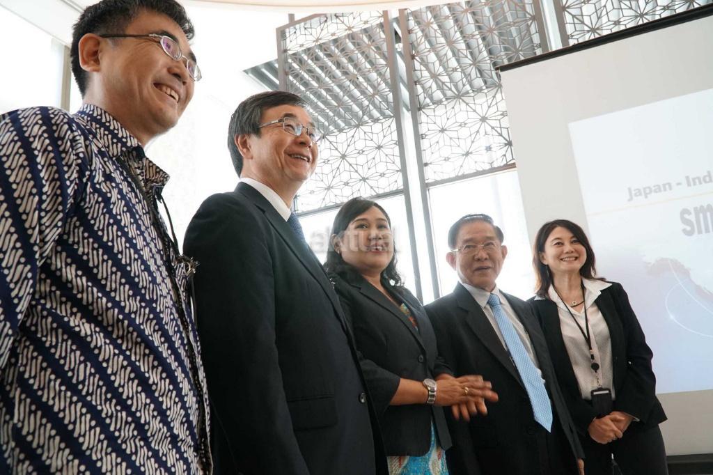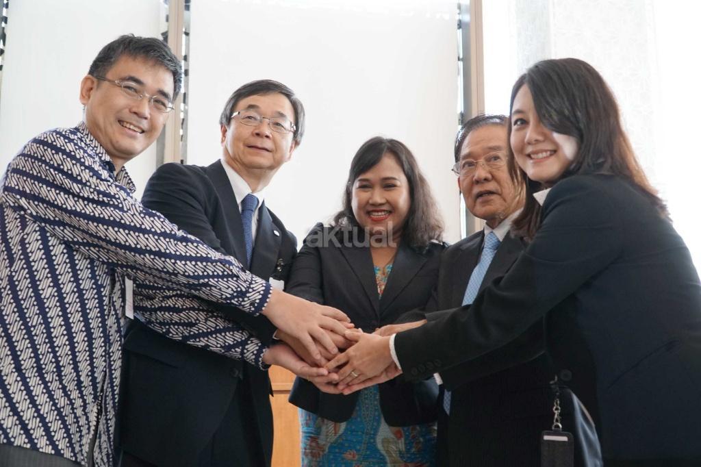 (kiri ke kanan) Head of Representative Office Japan External Trade Organization (JETRO) Kasugahara Daiki, Senior Executive Director of Tokyo SME Support Center, Masahiko Husaka, Head of Permanent Committee Institutional and Partnership National International SME’s and Cooperation of KADIN, Ratna Anggarwati Sudibyo, Chairman of Small & Medium Enterprises of Japan (SMEJ) Indonesia, Dr. Yasunobu Shiraishi dan Head, International Business Strategic Maybank Indonesia, Nancy Novita Helen saling bertumpu tangan
