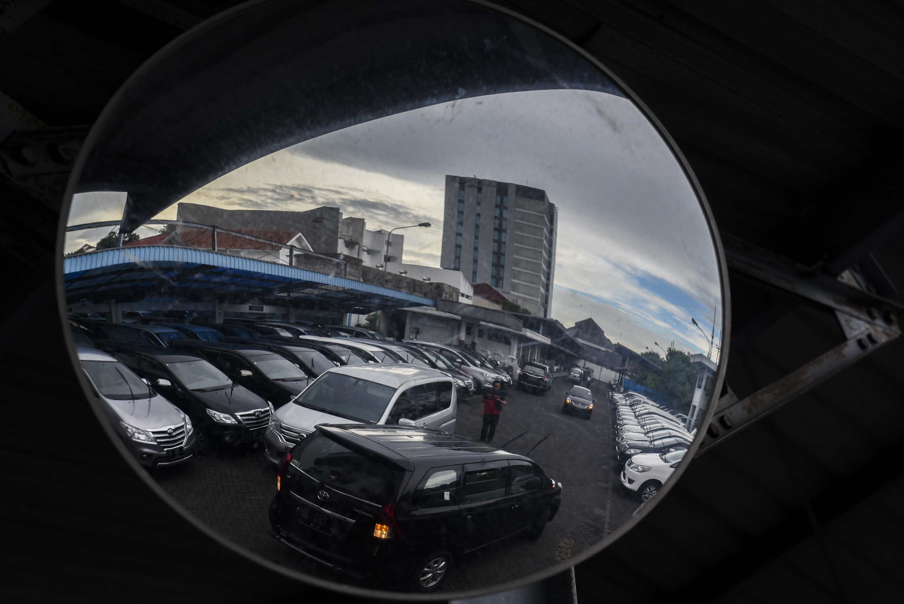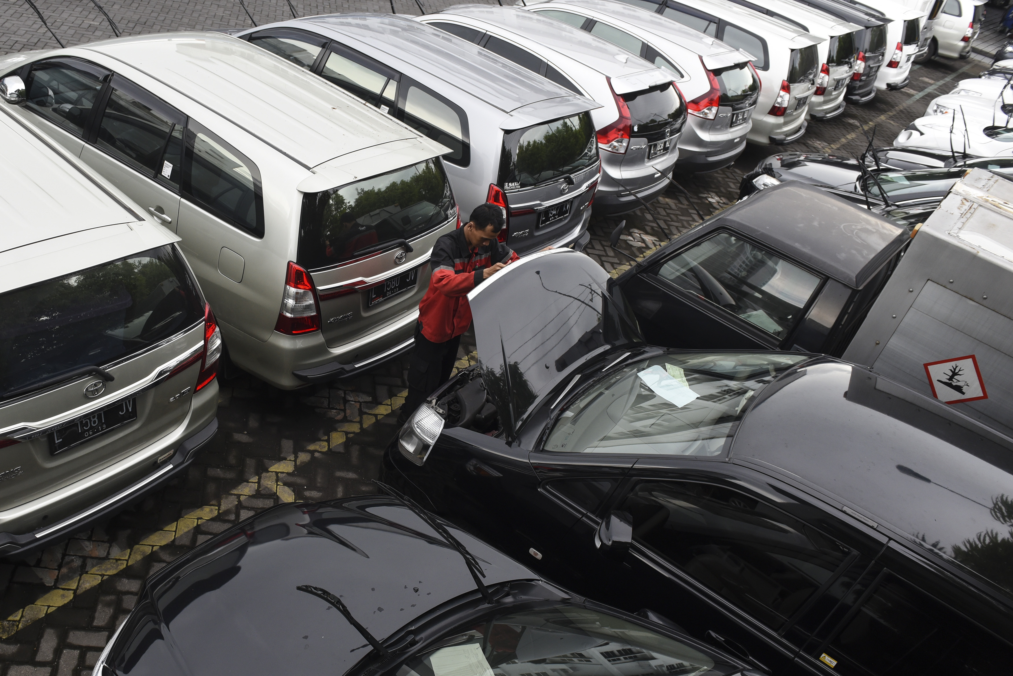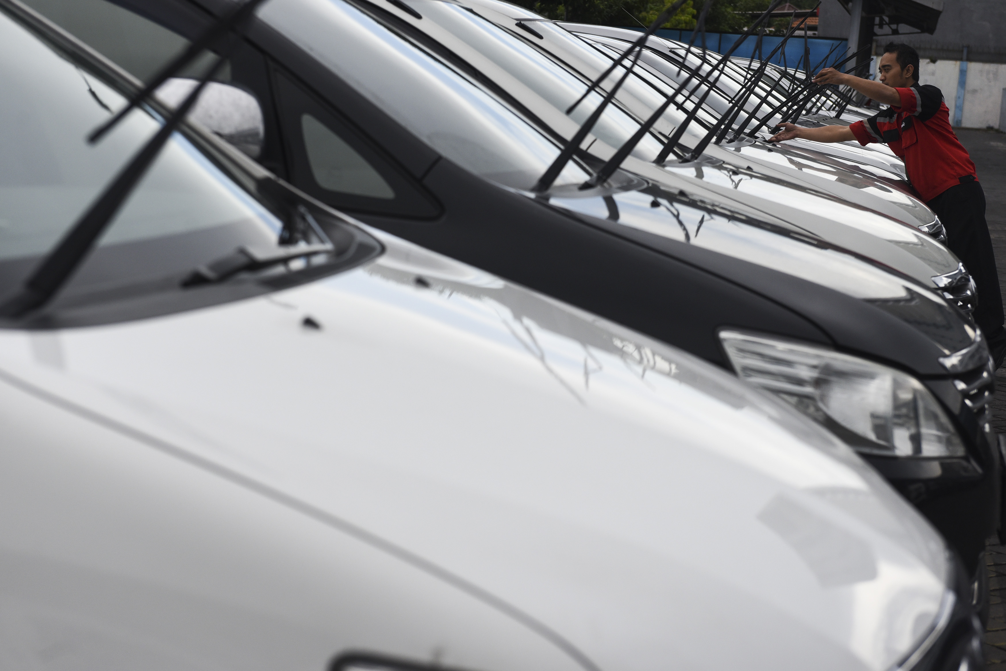 Pekerja memeriksa kondisi mobil di perusahaan penyewaan mobil Trac Astra di Surabaya, Jawa Timur, Kamis (30/6). Menjelang Lebaran, penyewaan mobil meningkat hingga 90 persen dibanding hari biasanya. ANTARA FOTO/Zabur Karuru/aww/16.
