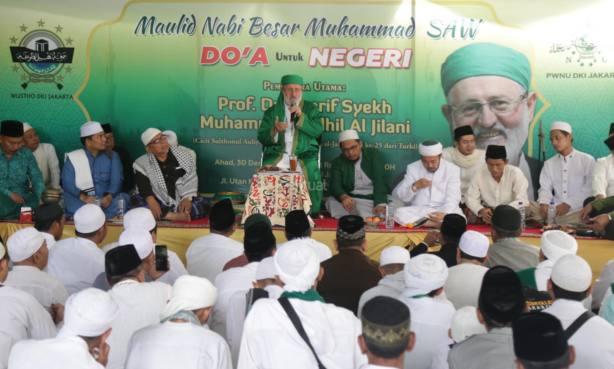 Prof Syarif Syekh Muhammad Fadhil Al Jailani mengisi peringatan Maulid Nabi Besar Muhammad SAW bertajuk ‘Doa Untuk Negeri’ yang digelar oleh Jam'iyyah Ahlith Thariqah Al- Mu'tabarah An-Nahdliyyah (JATMAN) DKI Jakarta di kantor Pengurus Wilayah Nahdlatul Ulama (PWNU) DKI Jakarta, Jalan Utan Kayu, Jakarta Timur, Minggu (30/12). Maulidul Anwar ini turut dihadiri perwakilan Rais Aam PWNU, Muqaddam Thariqah Tijani KH Muhammad Yunus Abdul Hamid dan Mudir Idaroh Wustho Ketua Jatman DKI Jakarta, KH Muhammad Danial Nafis. Secara garis besar dakwah di jalan Thoriqoh. Karena melalui Thoriqoh dari masyaikh-masyaikh dan guru-guru akan menjadi penghubung kita menuju Rasulullah SAW hingga Allah SWT. AKTUAL/Tino Oktaviano