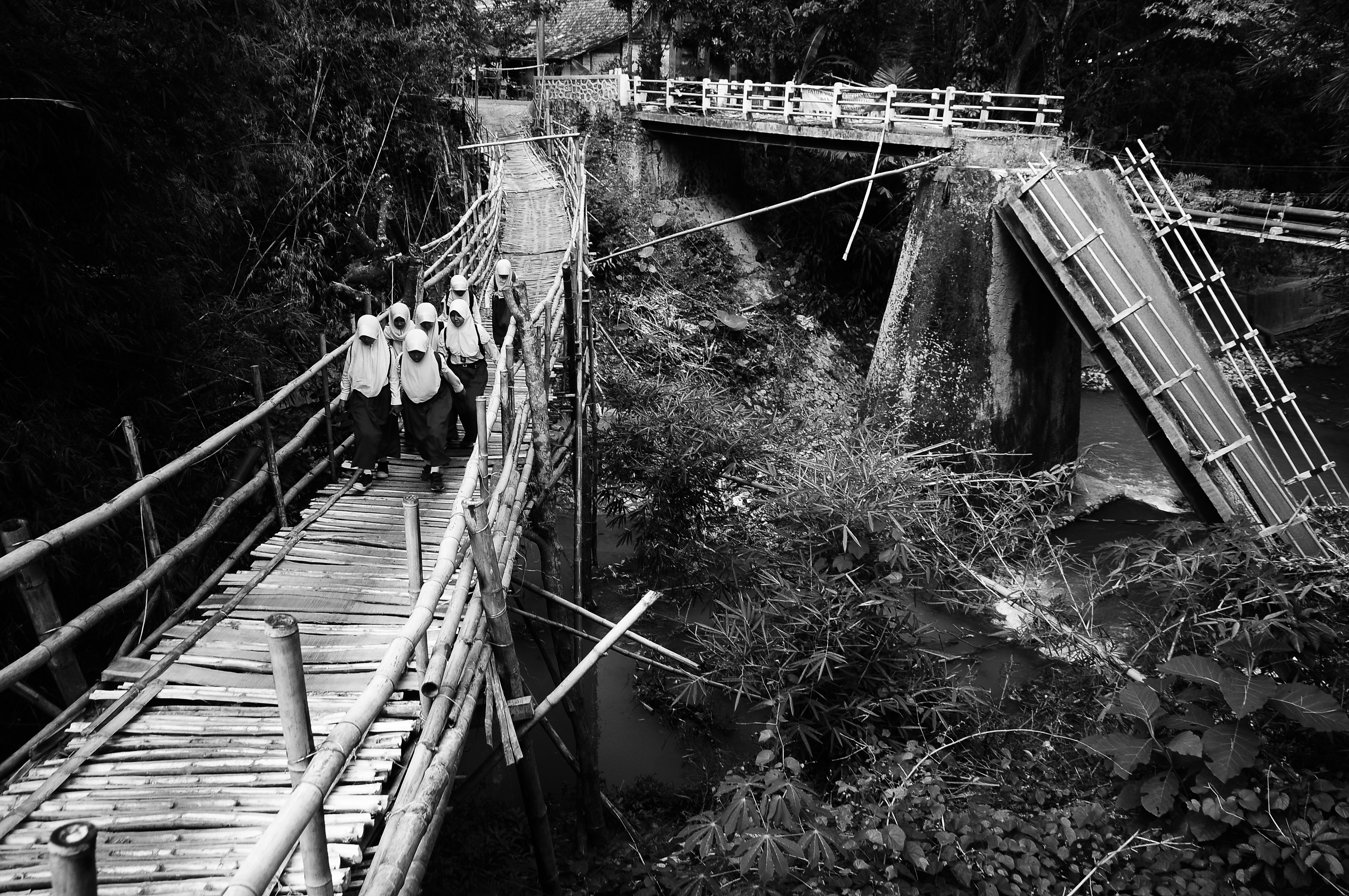 Foto berjudul ‘Semangat Berangkat Sekolah’ karya Yusuf Nugroho juara 2 kategori jurnalis. Sejumlah siswa melewati jembatan sesek bambu karena jembatan betonnya roboh di Blora. Istimewa