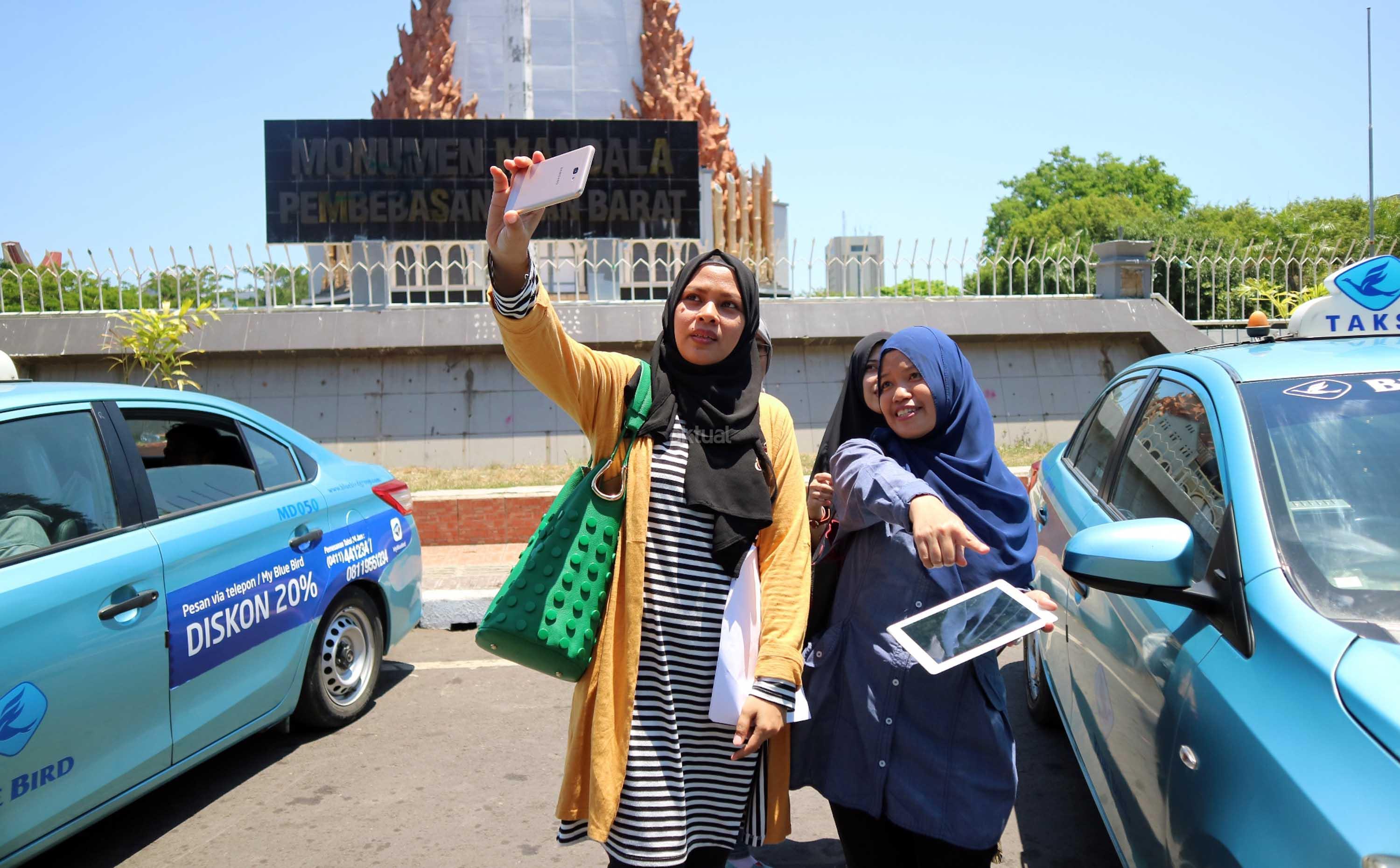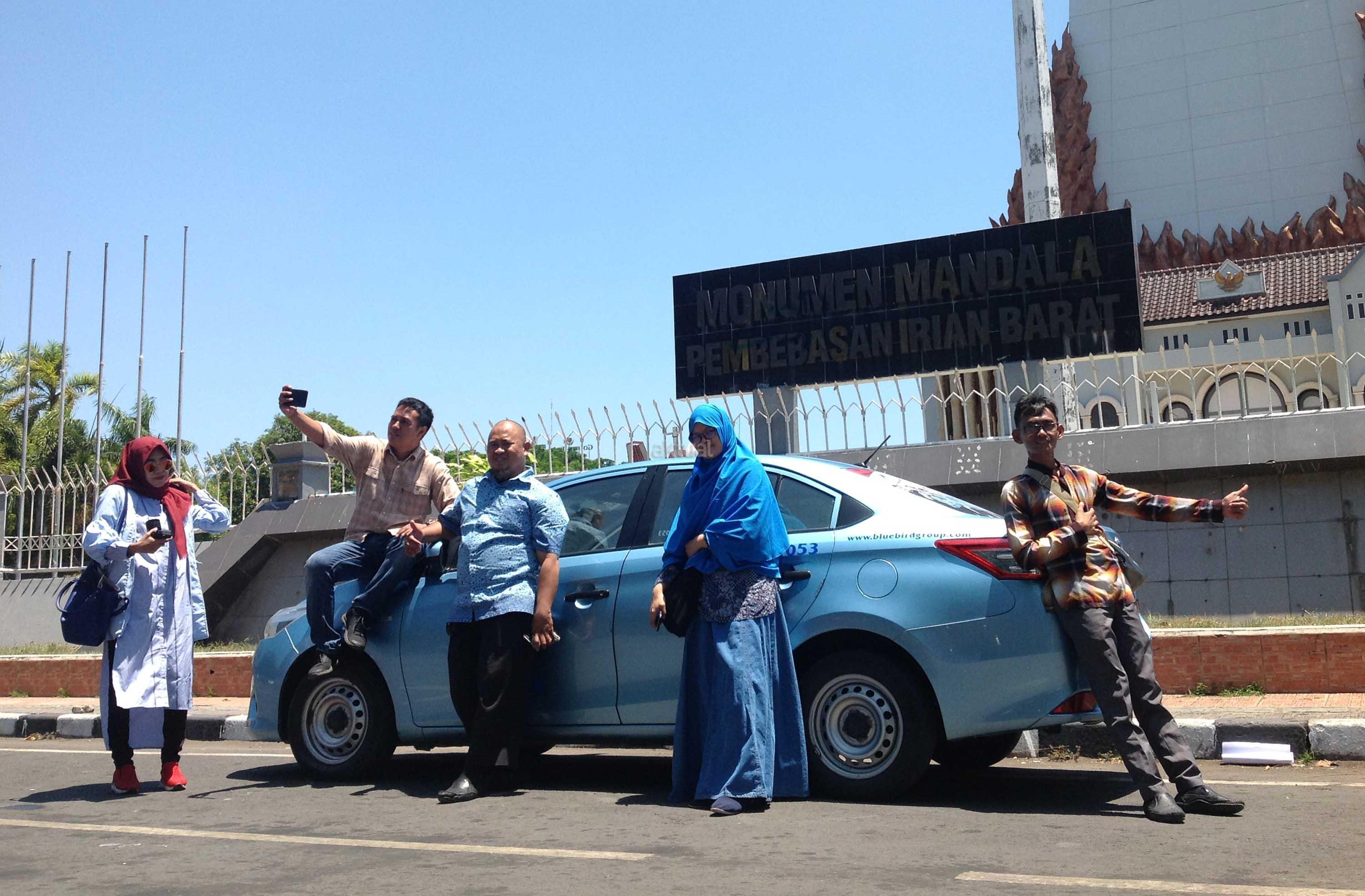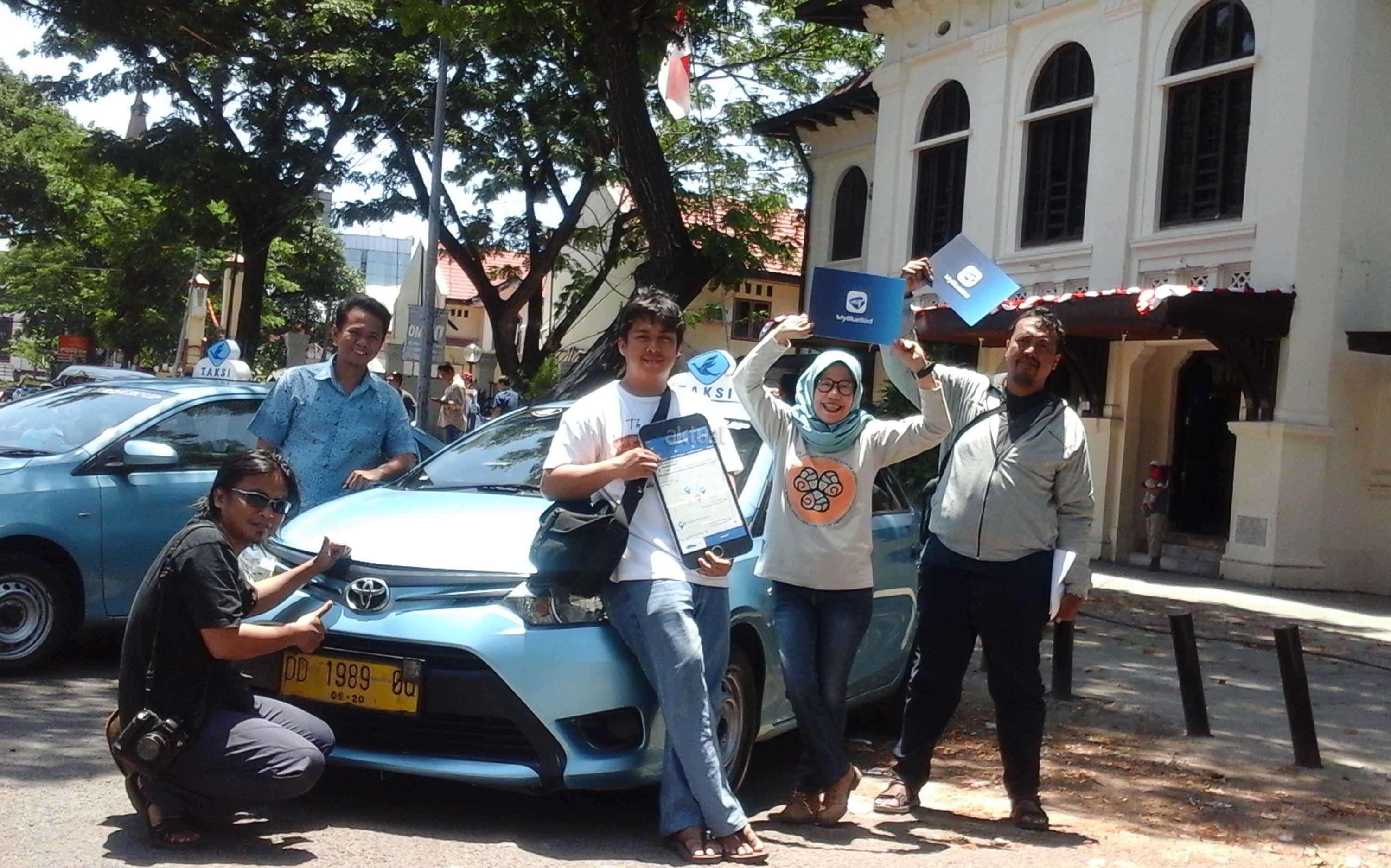 Peserta “Jelajah Makassar” menggunakan aplikasi My BlueBird melakukan swafoto dengan armada taksi Blue Bird saat tiba di Museum Mandala Pembebasan Irian Barat, Makassar. AKTUAL/Humas Blue Bird