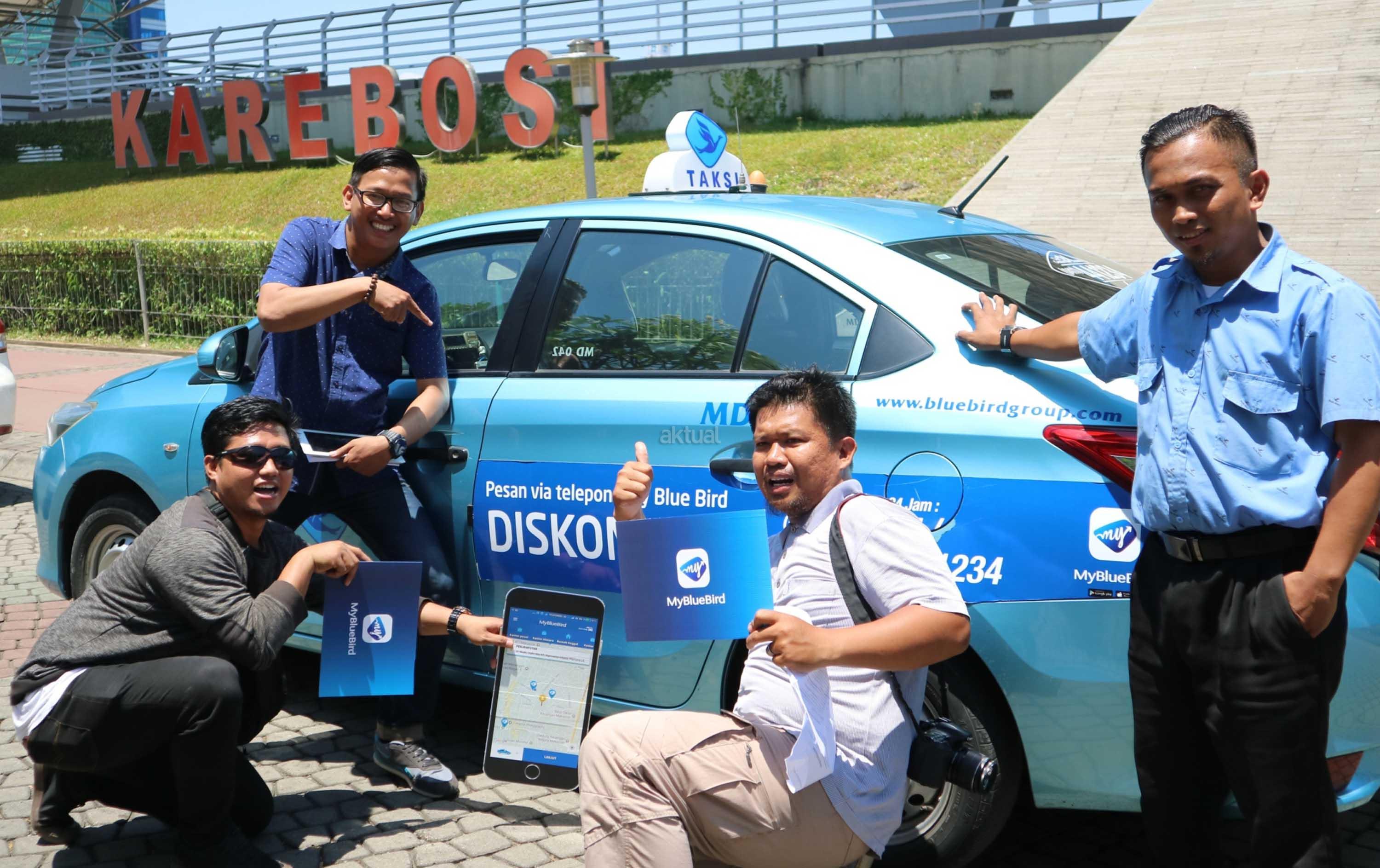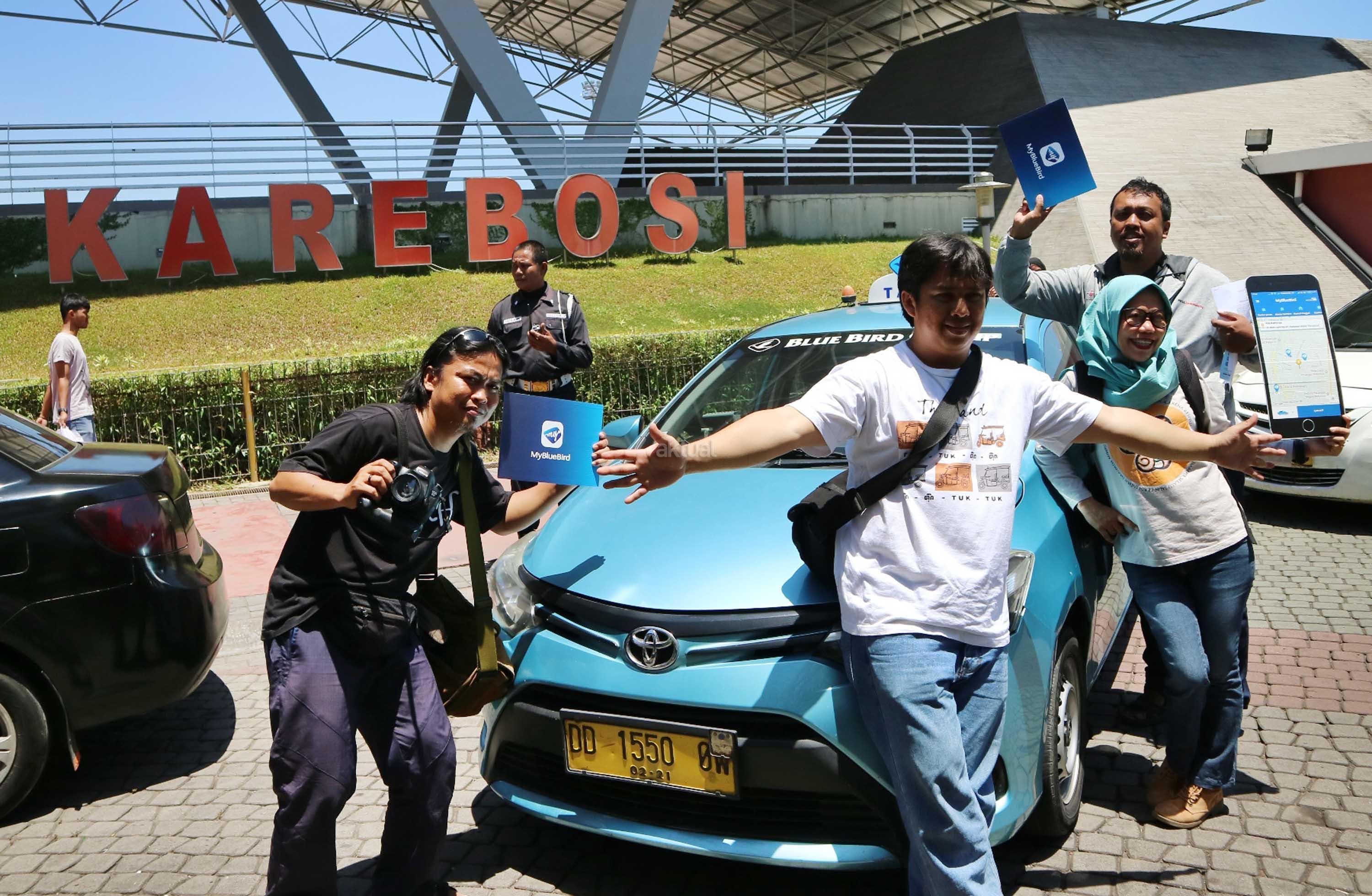 Peserta “Jelajah Makassar” menggunakan aplikasi My BlueBird melakukan swafoto dengan armada taksi Blue Bird saat tiba di Lapangan Kerebosi, Makassar. AKTUAL/Humas Blue Bird