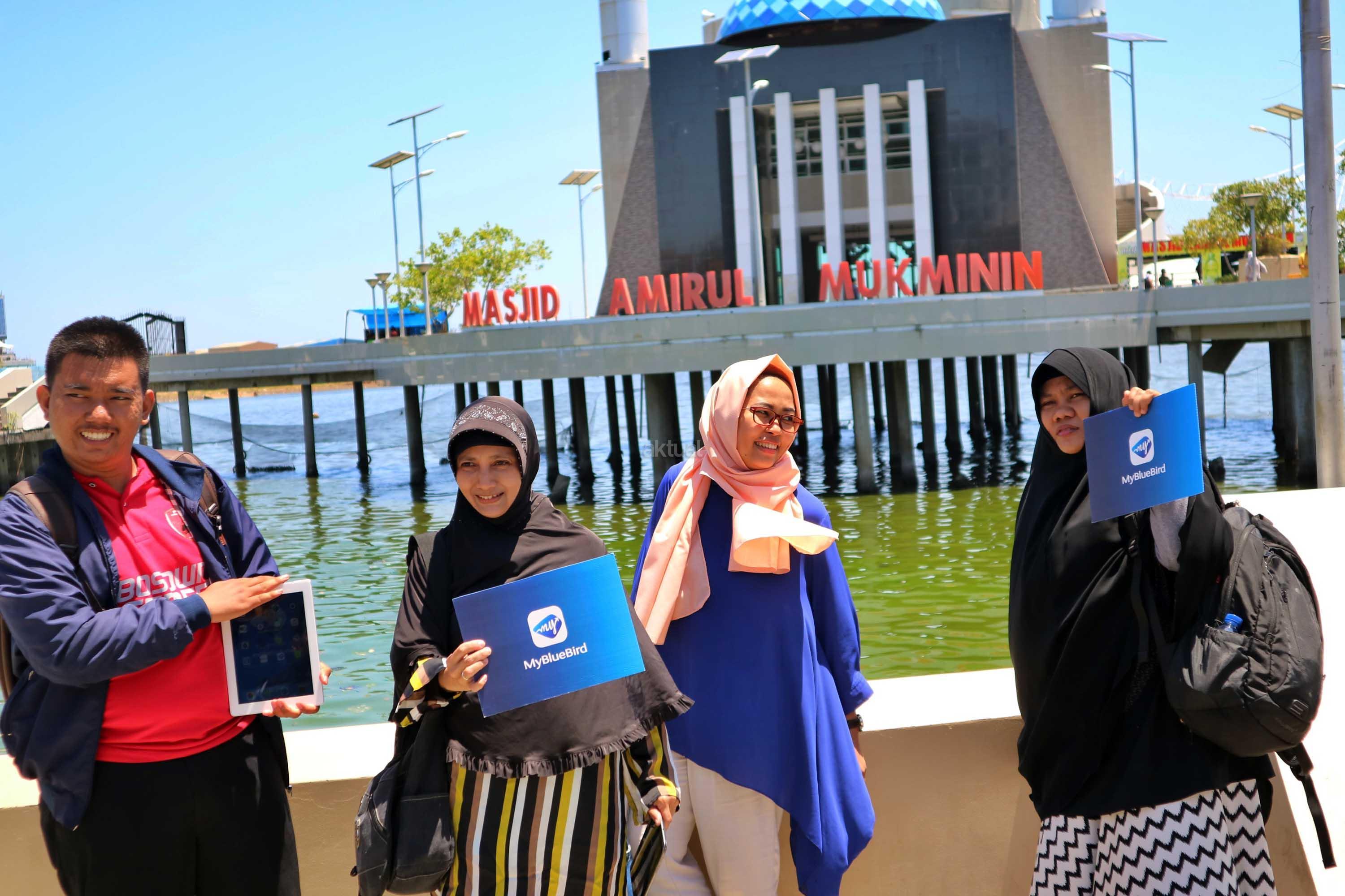 Peserta “Jelajah Makassar” menggunakan aplikasi My BlueBird melakukan swafoto dengan armada taksi Blue Bird saat tiba di Masjid Terapung Amirul Mukinin Makassar. AKTUAL/Humas Blue Bird