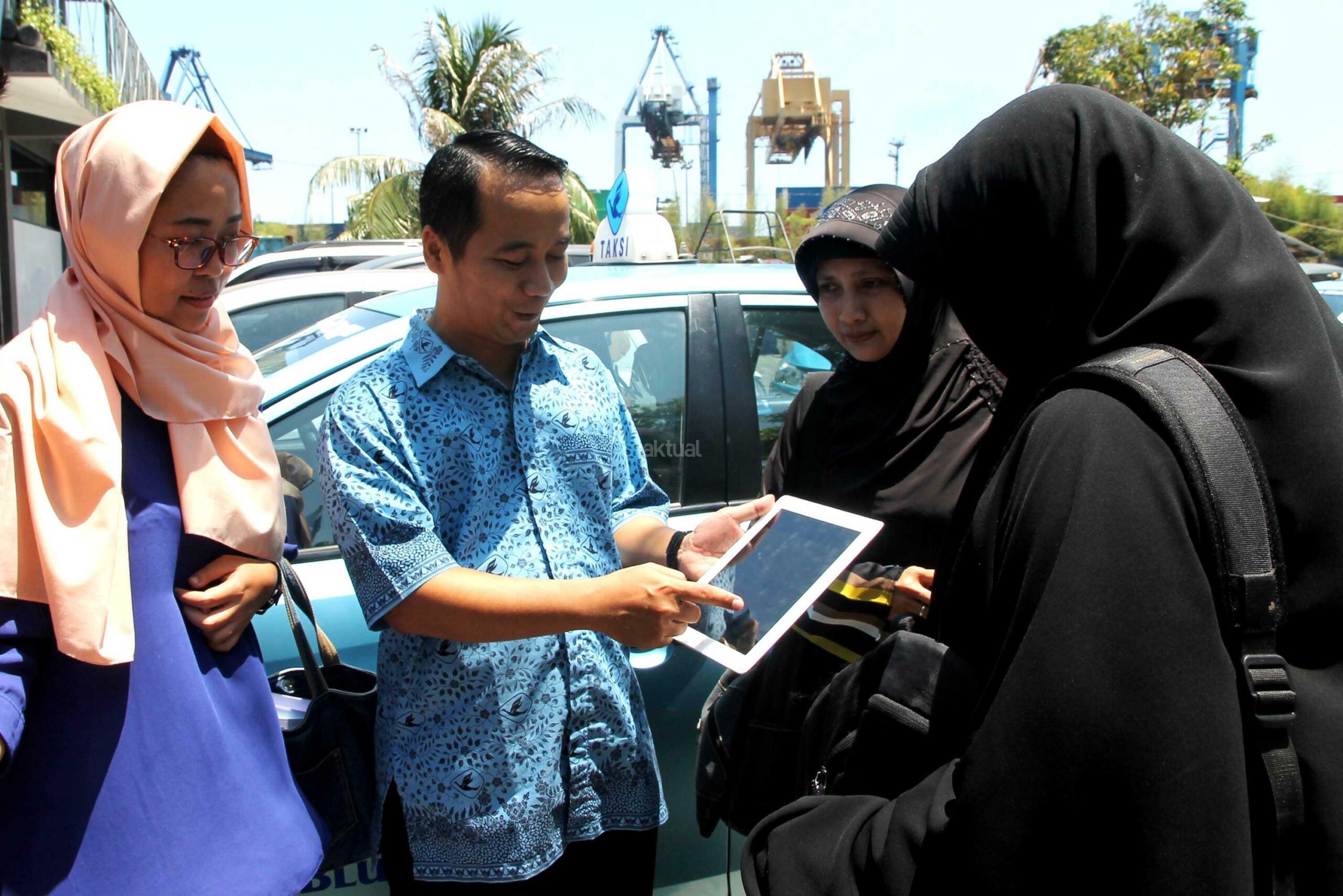 Peserta “Jelajah Makassar” menggunakan aplikasi My BlueBird saat mulai melakukan pemberangkatan menggunakan taksi Blue Bird Makassar. AKTUAL/Humas Blue Bird