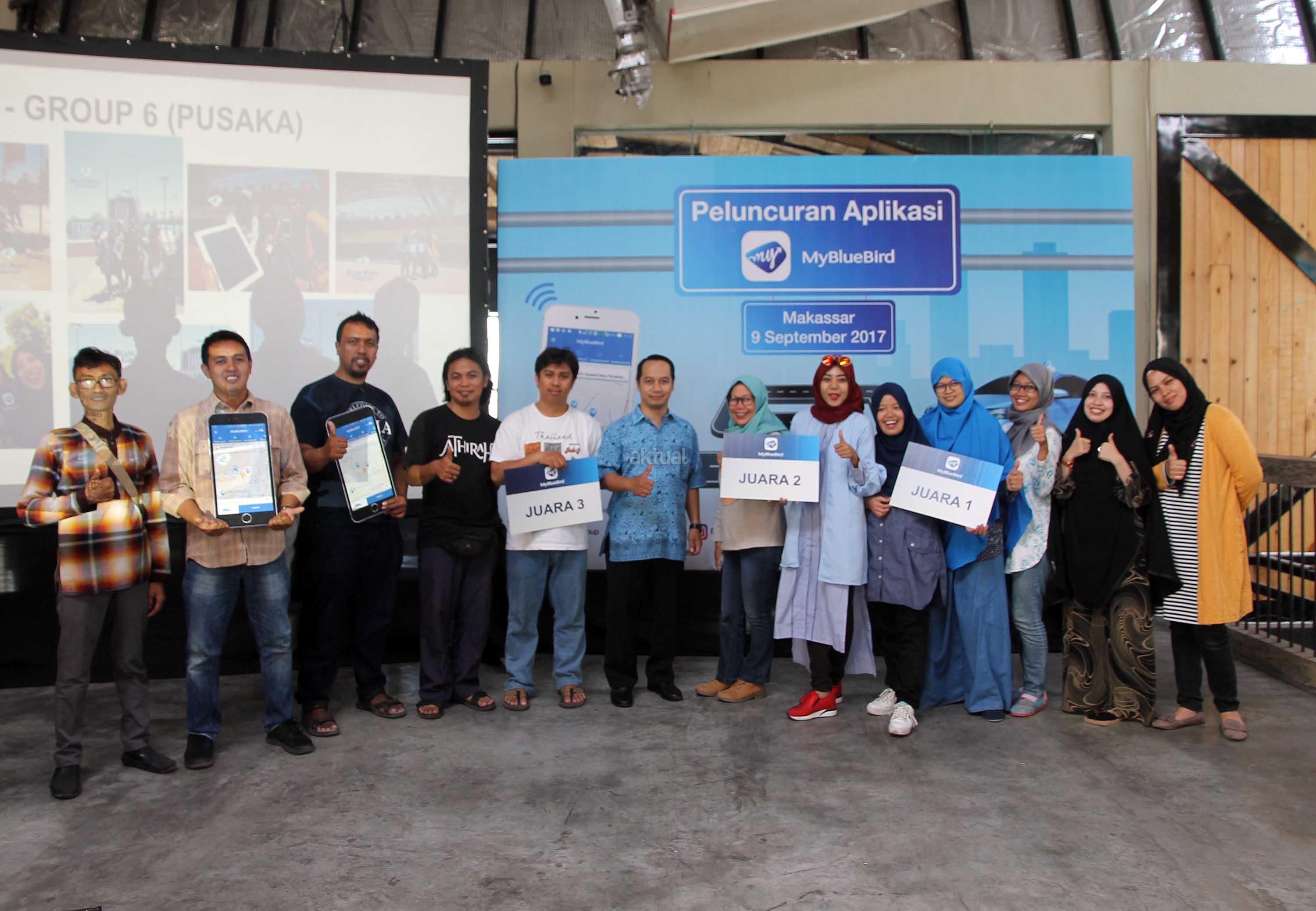 Direktur PT Blue Bird Tbk Sigit Priawan Djokosoetono foto bersama para pemenang “Jelajah Makassar” yang diselenggarakan Blue Bird untuk memberikan pengalaman menggunakan Aplikasi My Blue Bird, mulai dari pemesanan taksi hingga pembayaran dengan menggunakan fitur non-tunai yang diikuti para jurnalis dan blogger. AKTUAL/Humas Blue Bird