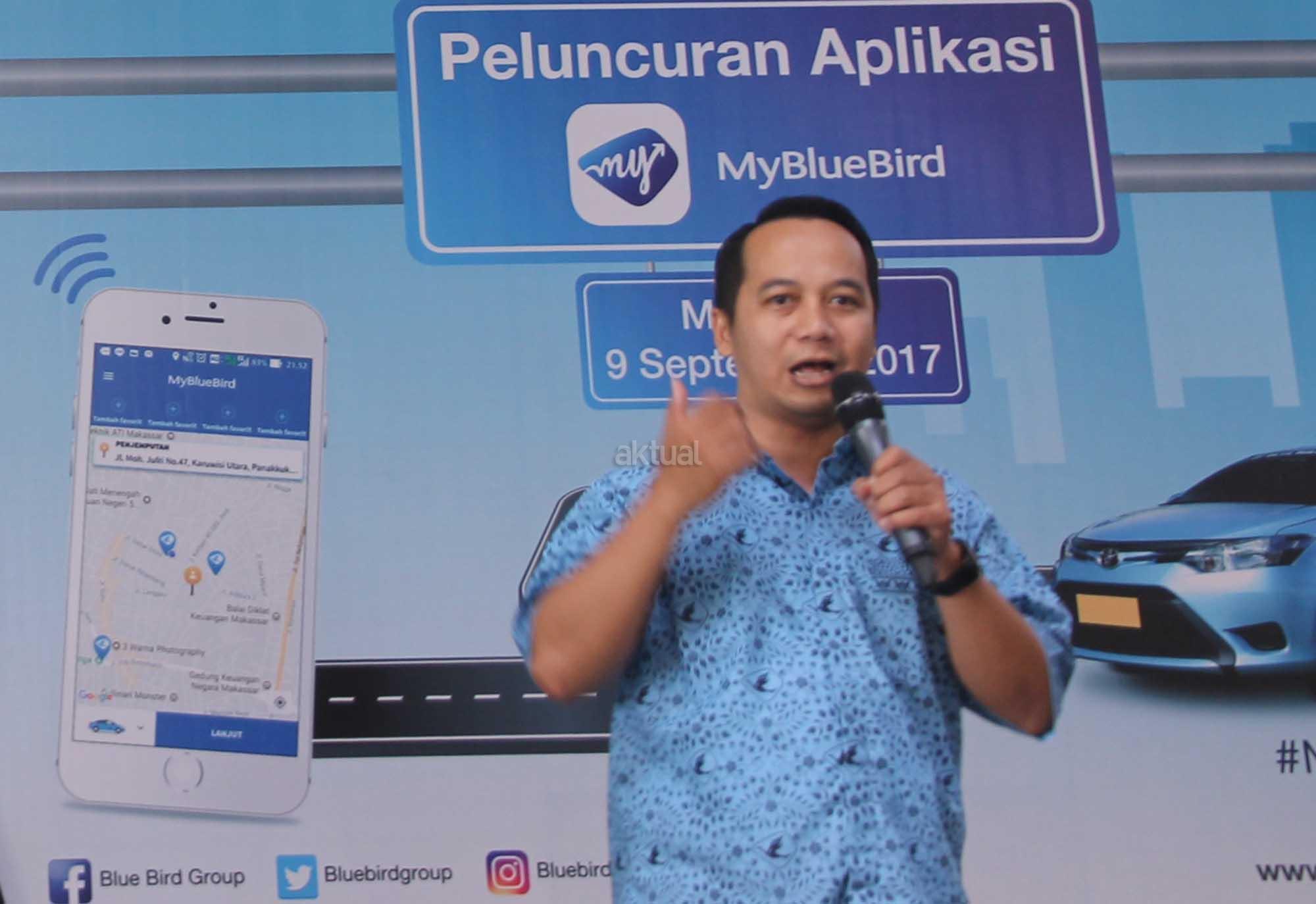 Branch Manager Blue Bird Pool Makassar, Didik Budianto, menjelaskan cara menggunakan aplikasi My BlueBird kepada pserta “Jelajah Makassar” untuk memberikan pengalaman menggunakan Aplikasi My Blue Bird, mulai dari pemesanan taksi hingga pembayaran dengan menggunakan fitur non-tunai yang diikuti para jurnalis dan blogger. AKTUAL/Humas Blue Bird