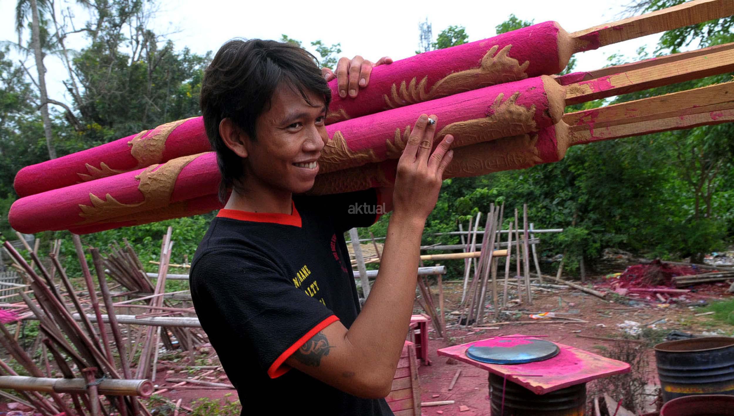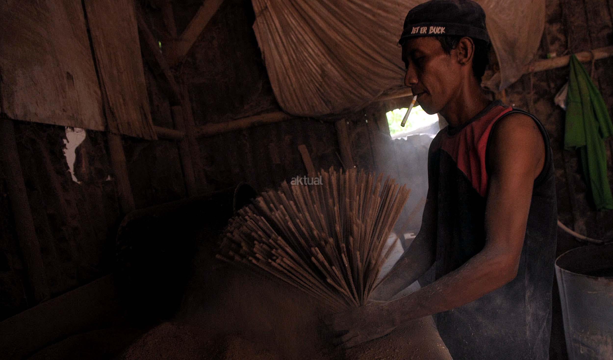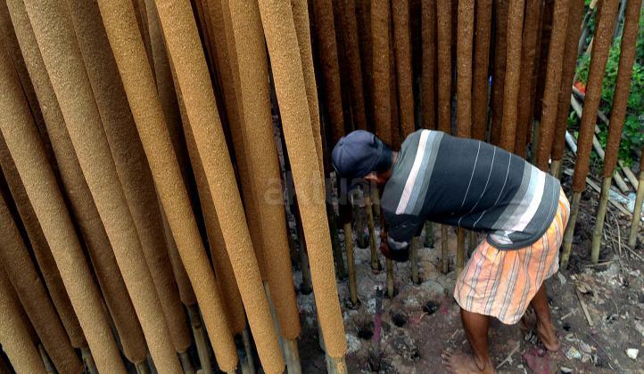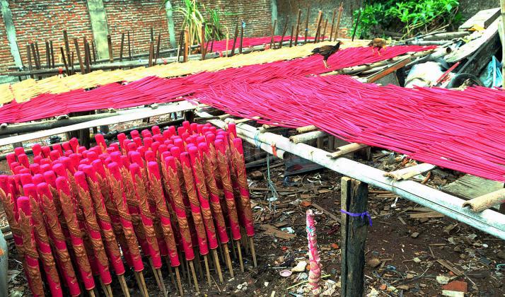 Kumpulan kayu untuk batang hio sedang dijemur, Teluk Naga, Tangerang, Jumat (22/1/2016). Menjelang perayaan tahun baru Cina (Imlek) pesanan hio melonjak drastis hingga 300 persen.